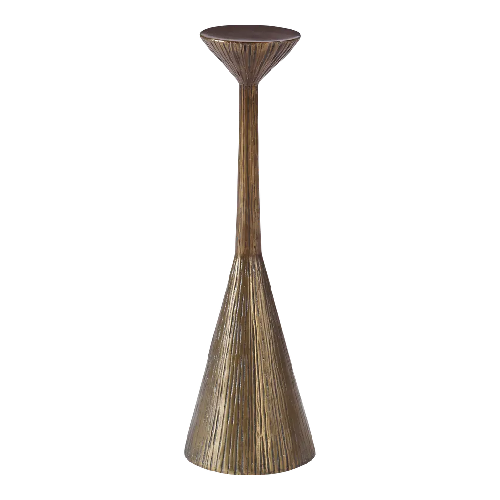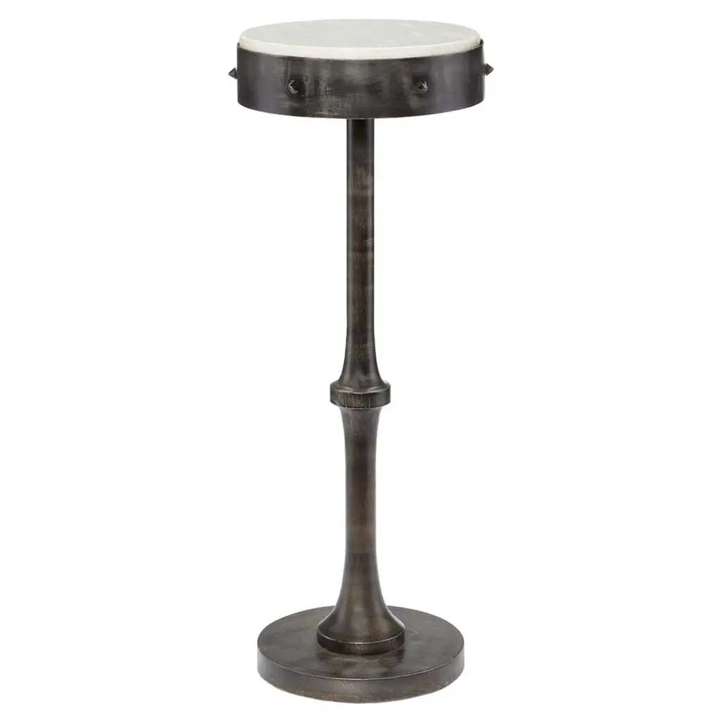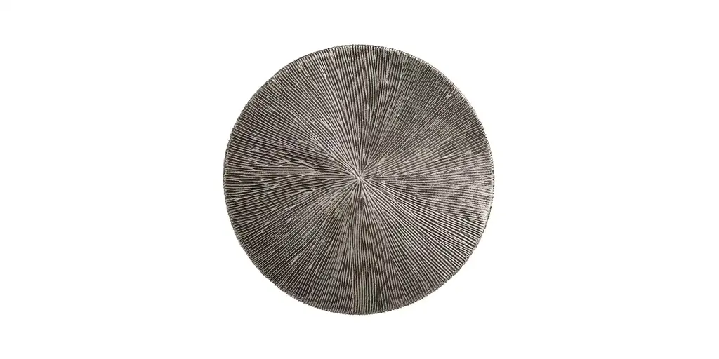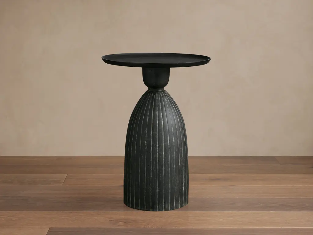 The Sparrow Drink Table features a platter of textured aluminum atop a simple yet elegant stem of mango wood. The walnut finish of the wood sits in dramatic contrast with the starburst-patterned table top. Along with the beaded aluminum collar and bottom ring, all the metal gleams in an antique gold finish. Fine wine, spirited cocktails, your favorite coffee all deserve to be served with the aplomb conveyed by this small but stately accent table.