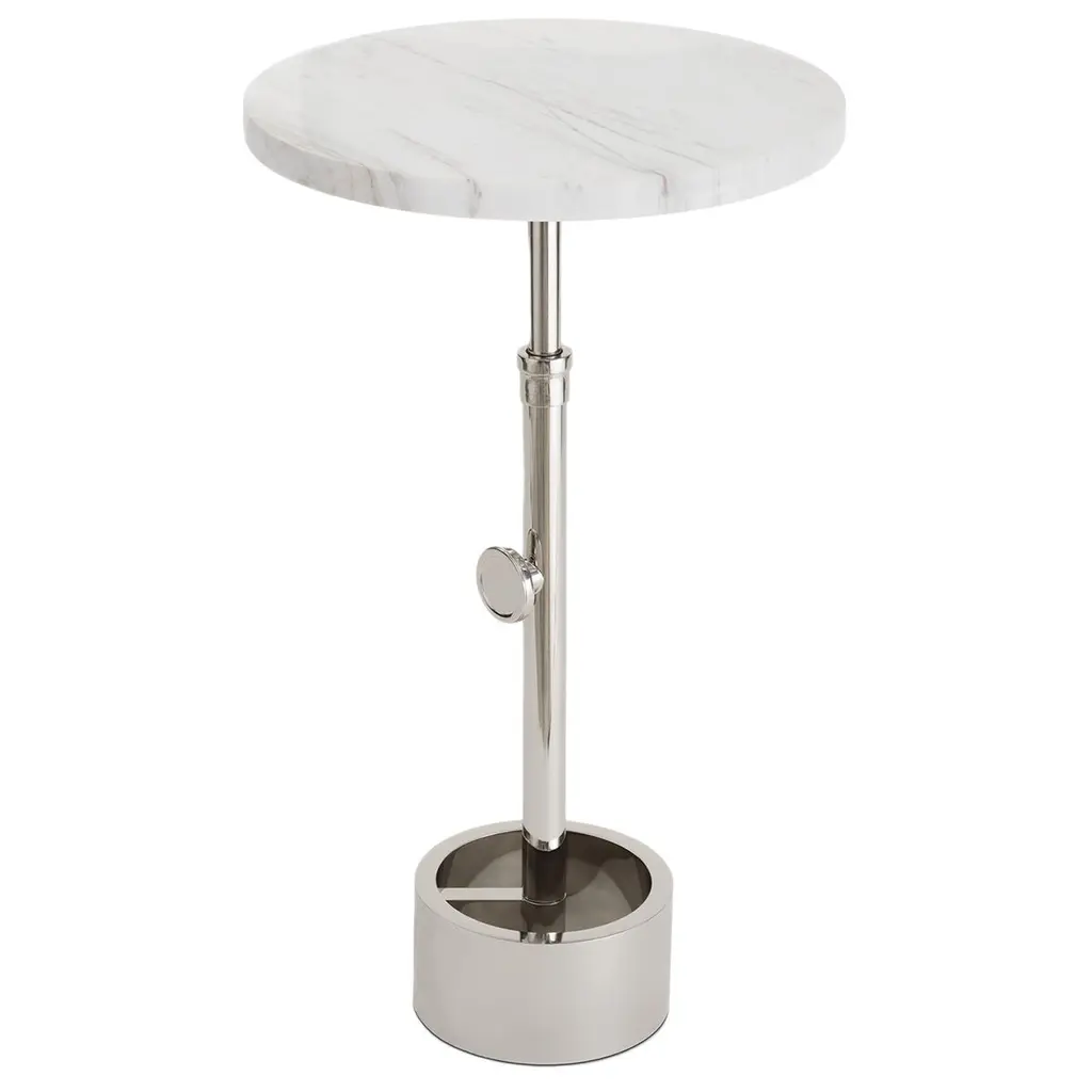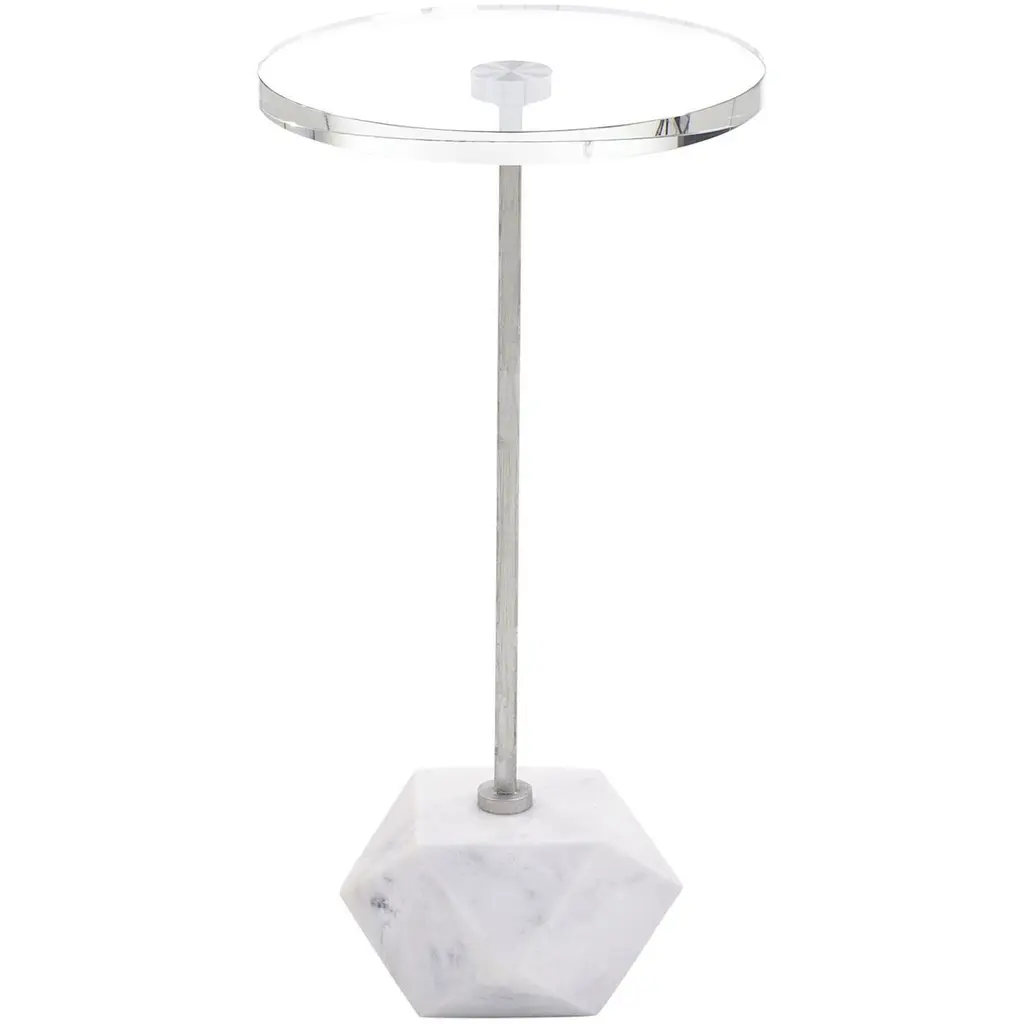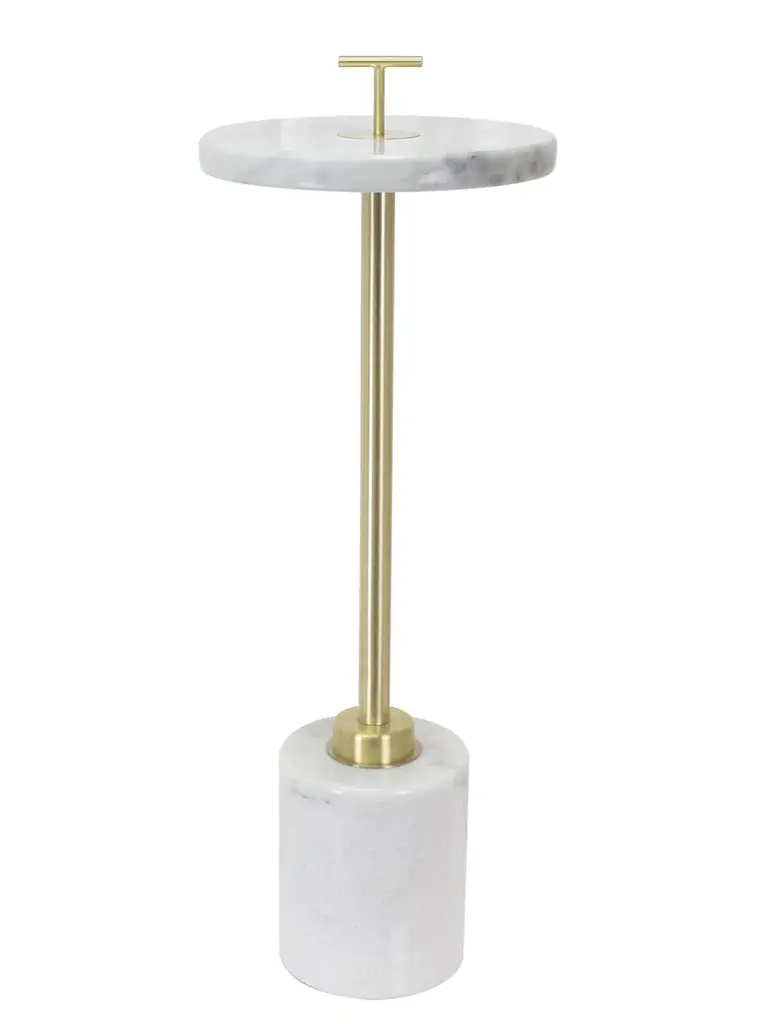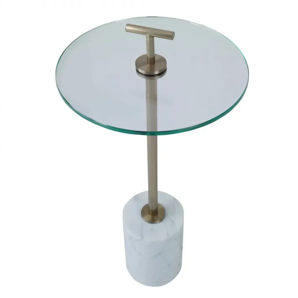 A petite spot table featuring a white marble base, brass stem and round glass top. The stem terminates in a small T shaped handle at the top. Perfect chairside table for a book, glass or bouquet.