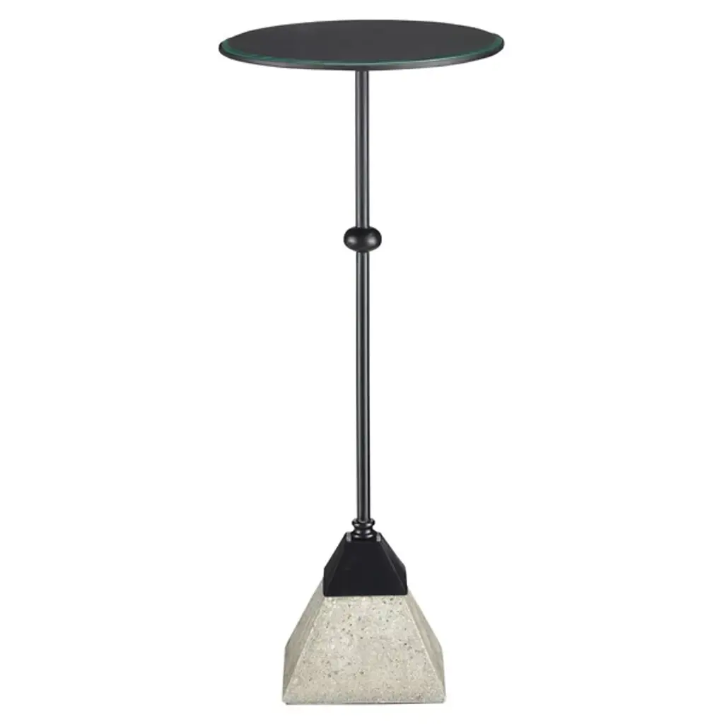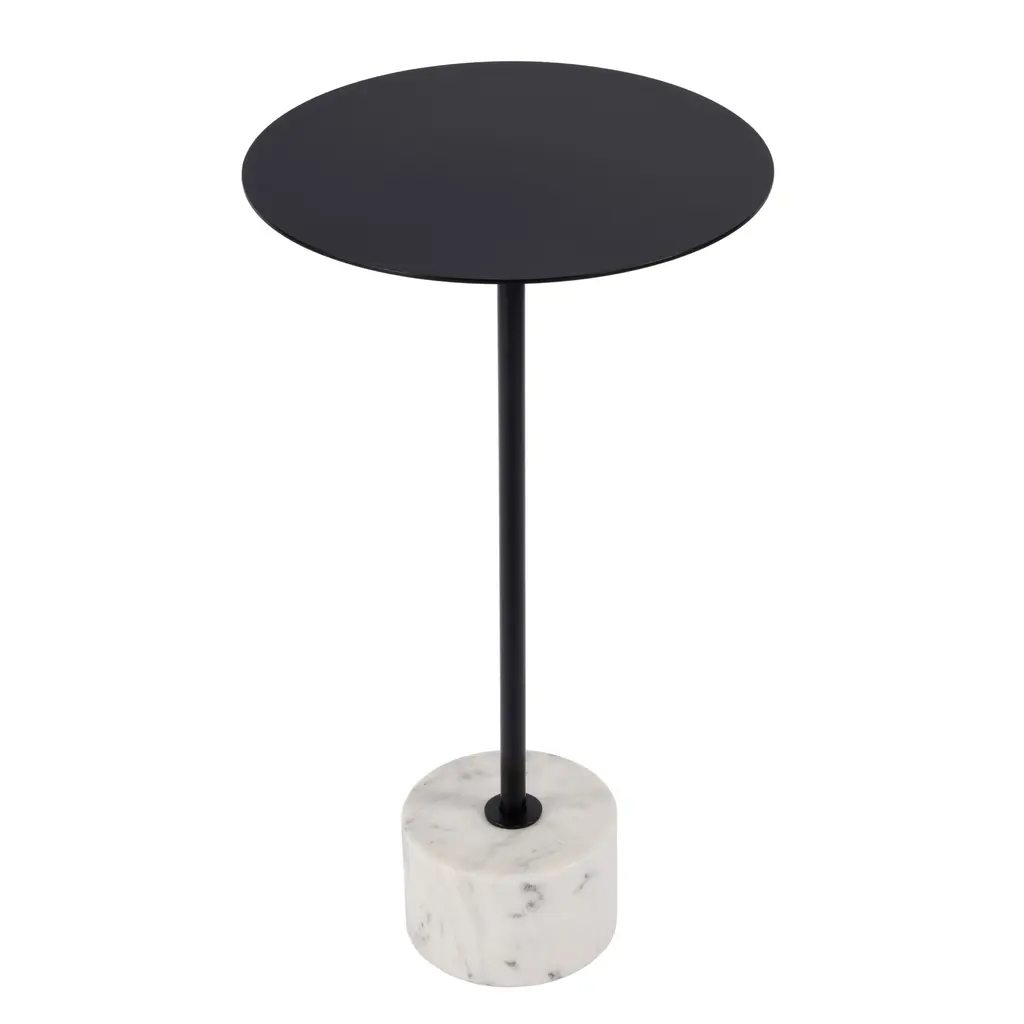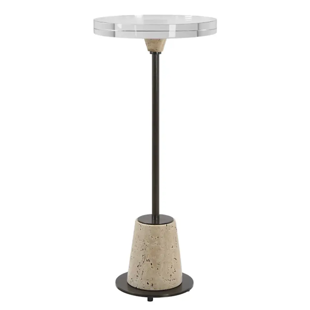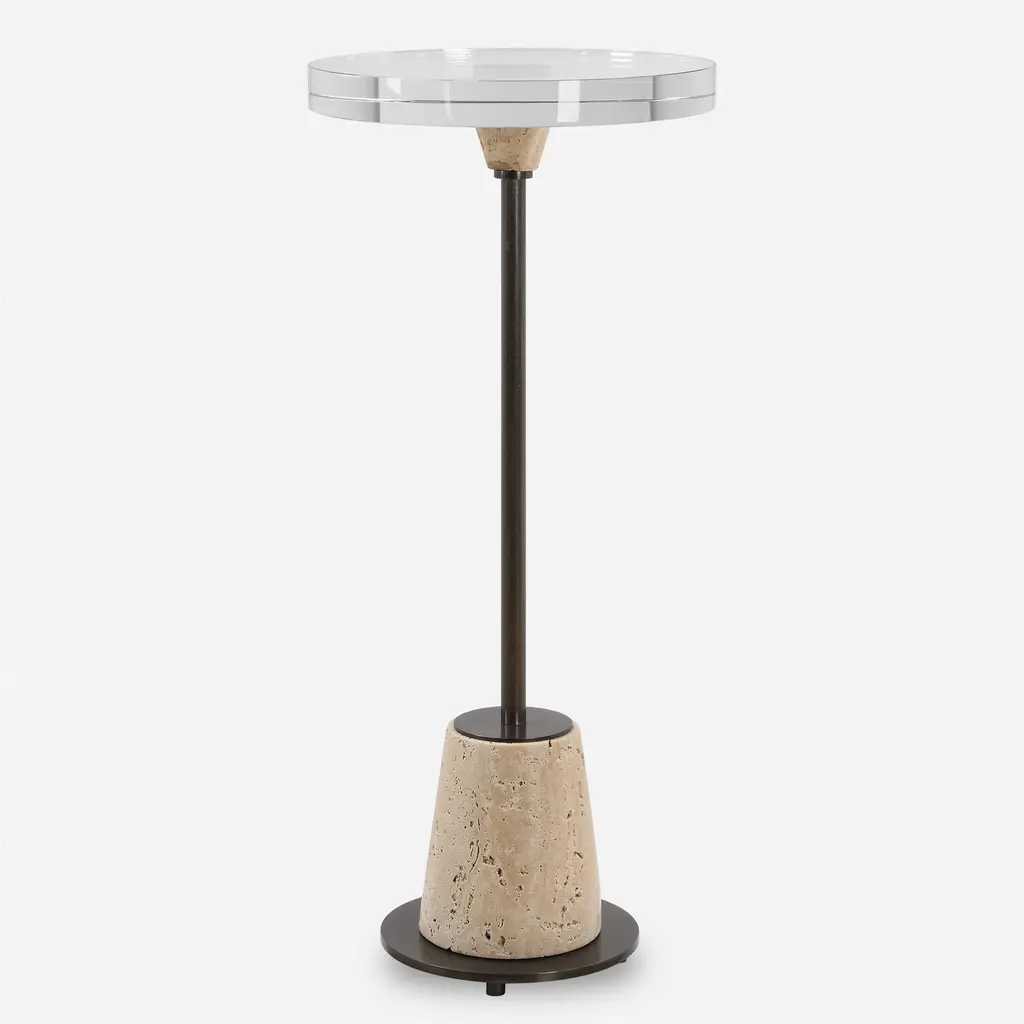 A petite spot table featuring a white marble base, brass stem and round glass top. The stem terminates in a small T shaped handle at the top. Perfect chairside table for a book, glass or bouquet.