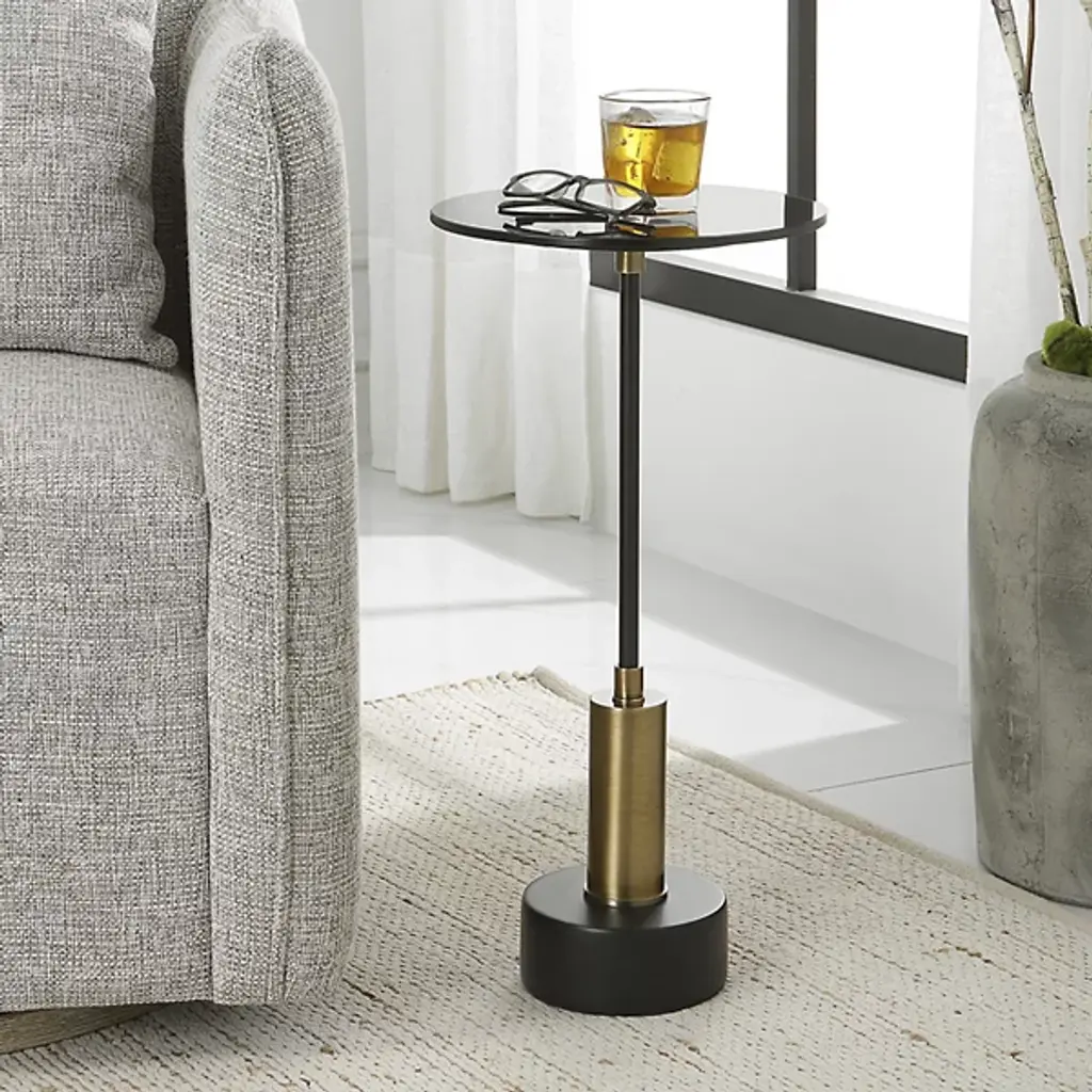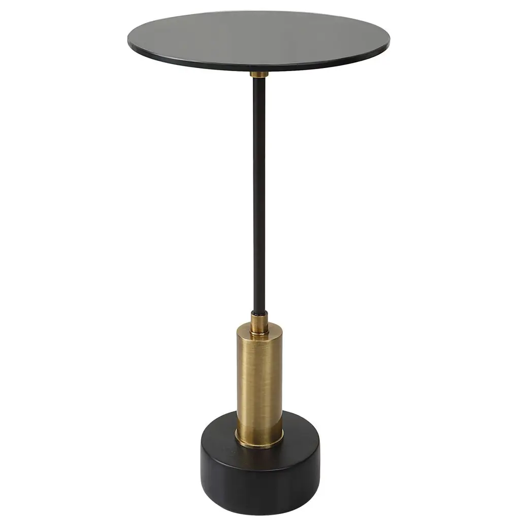 Embrace elegance and sophistication with the stunning Spector Modern Accent Table from Uttermost, designed with a brushed brass and satin black iron base adorned with exquisite black marble details. Topped with a sleek black glass surface, this table exudes refined charm. This table showcases a perfect blend of premium quality materials and distinctive high-style design, ensuring this accent table becomes a captivating centerpiece in any space, adding a touch of timeless beauty and luxury.