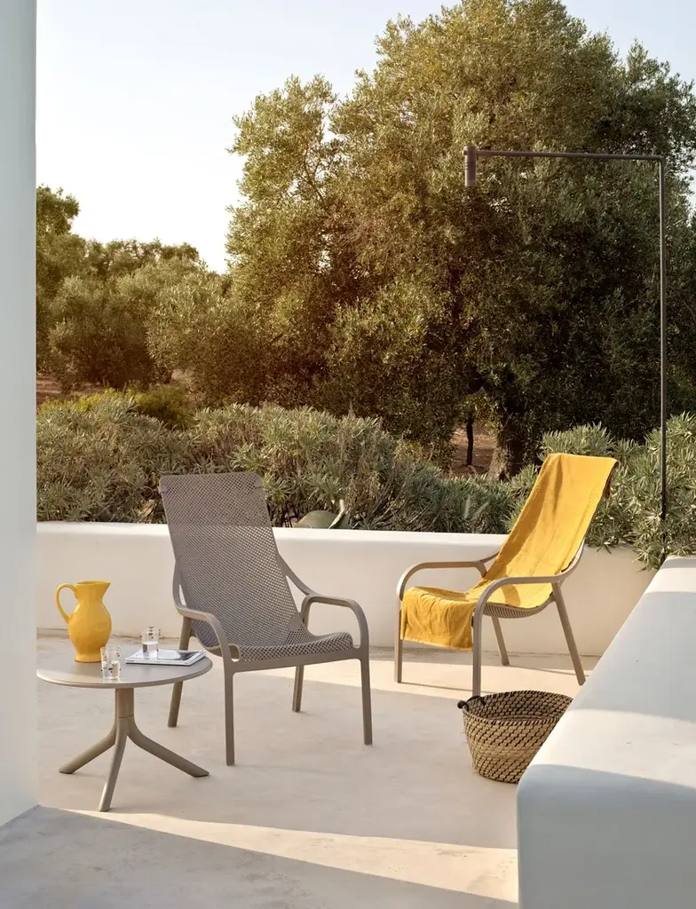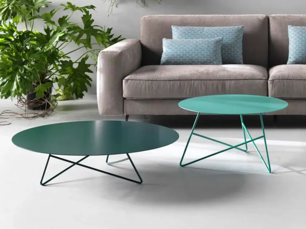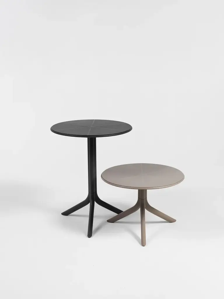 Spritz is an easy-chic low table with a round top and a base with three legs. It is ideal for terraces, balconies and gardens and perfect as an indoor furnishing accessory.Easy to assemble and disassemble with a single slot system, Spritz is available in six colours, from the most sophisticated to the most vibrant.Made of recyclable UV-treated and mass-coloured fiberglass resin, with a matt finish, Spritz is weatherproof and does not require any special maintenance. Fitted with non-slip feet, Spritz is It comes with a kit to set it up at two heights.Ideal for outdoor and indoor use.