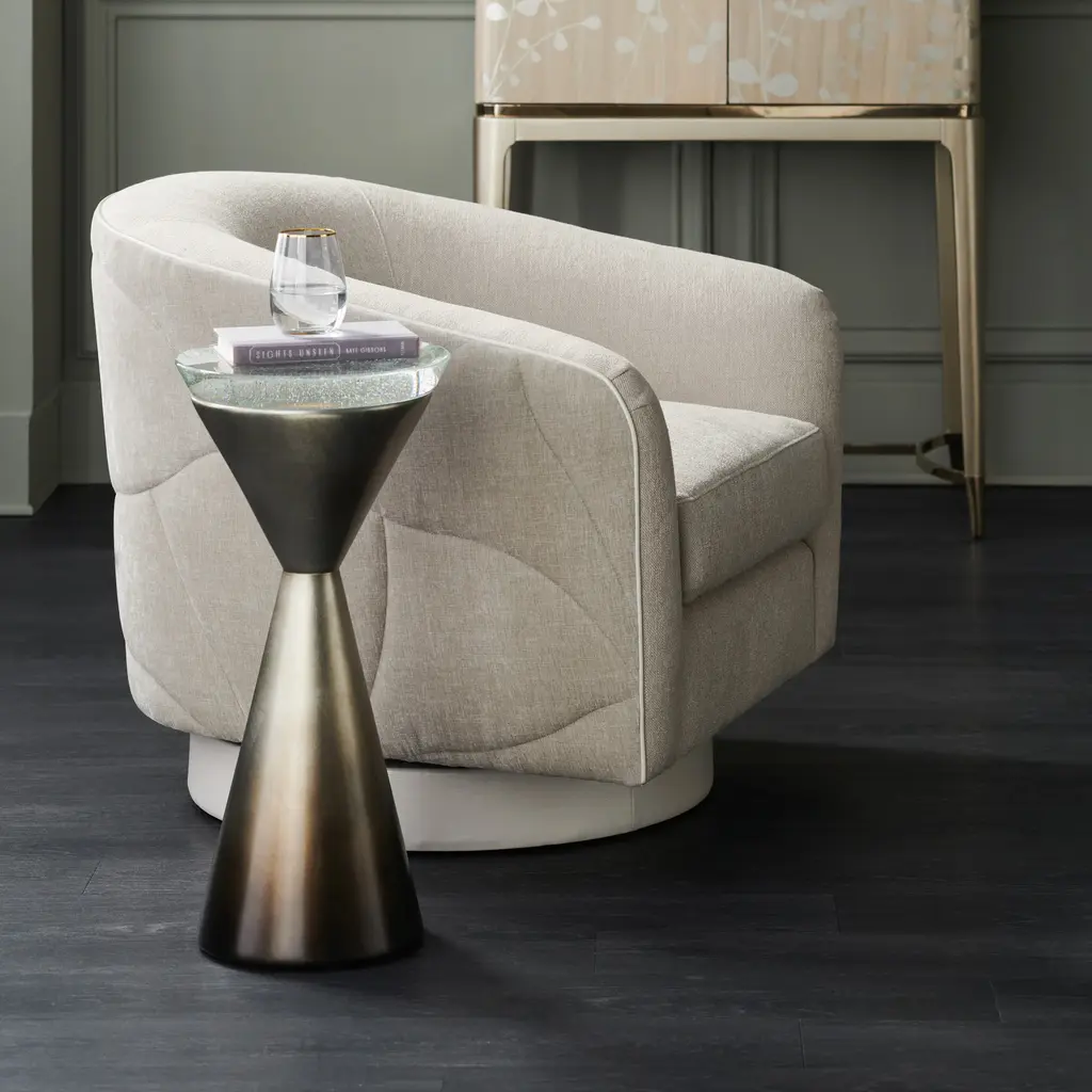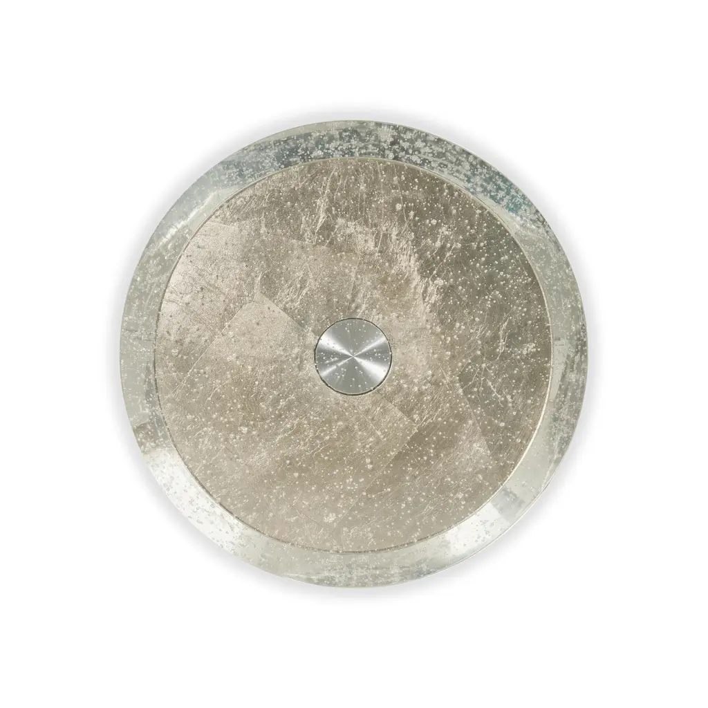 Add the perfect finishing touch with the Spy Glass End Table from Caracole. Its bold and bubbly design features a stunning cast bubble glass top and a shimmering silver leaf finish on its hourglass-shaped base. Perfect for adding sparkle and sophistication to any room, it also offers a practical surface for your chilled cocktail and favorite spy novel. Highlights