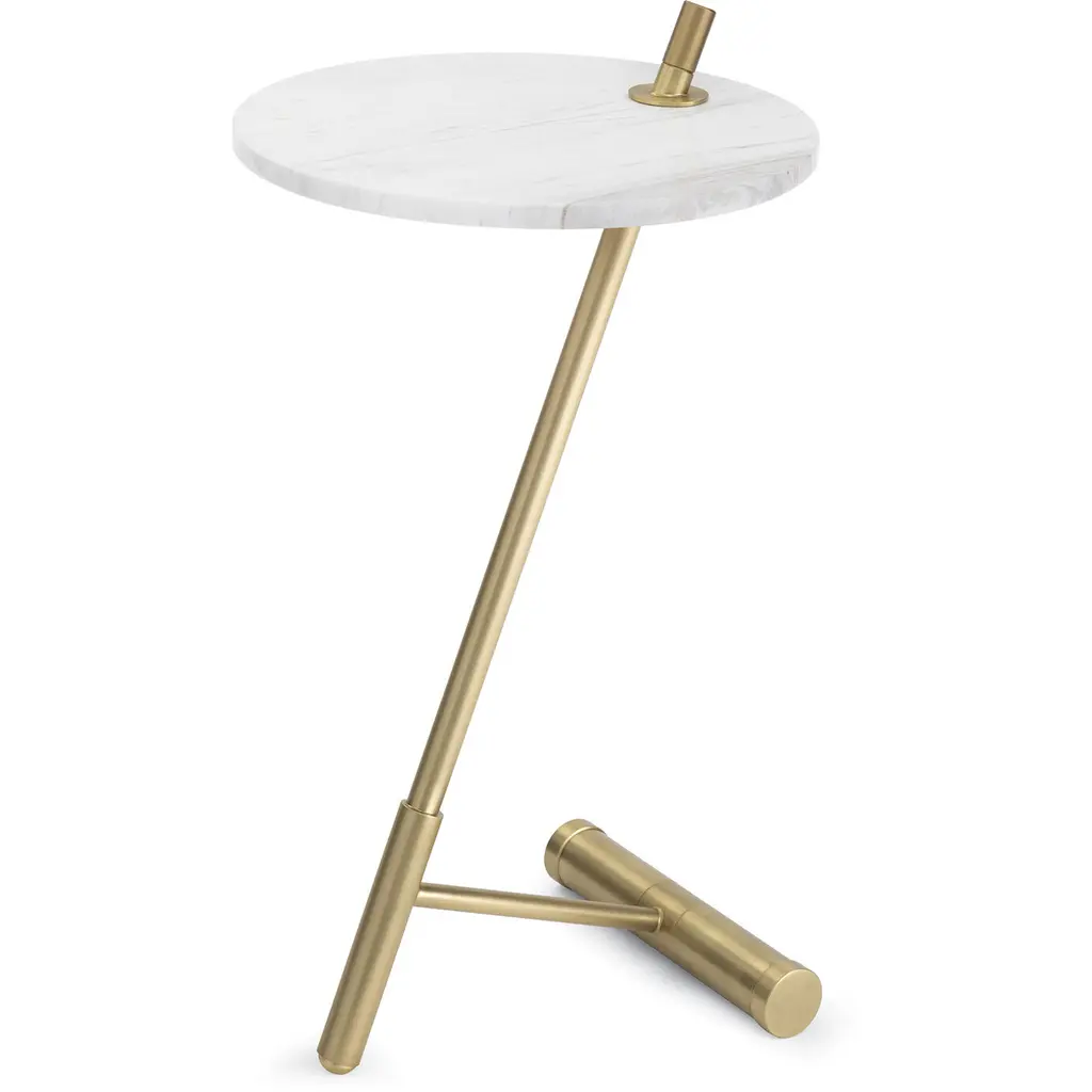 The Spyder Accent Table from Regina Andrew features an unusual kickstand-style base that creates visual intrigue and structural interest. Natural marble tops provide cool, smooth surfaces, contrasting with the warm metal base and the angled support that provides a dynamic appearance as if leaning forward. This table works well beside chairs or sofas where you need surface space but want something more interesting than traditional designs. The sculptural base makes this piece conversation-worthy while remaining completely functional for everyday use.