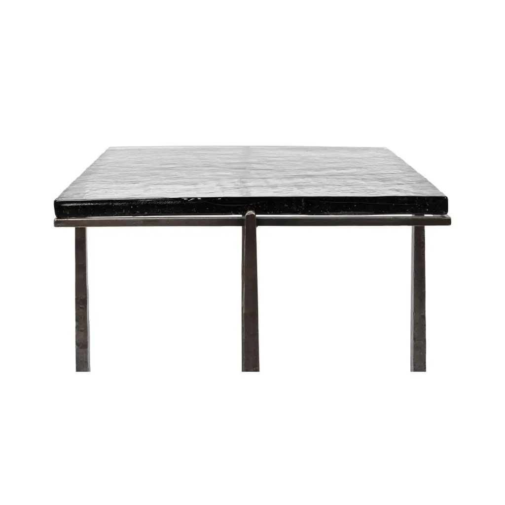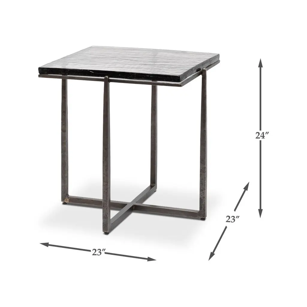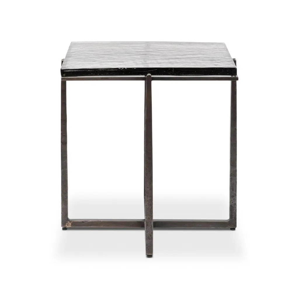 This exquisite piece features a hand-forged iron base in an aged nickel finish, lending a touch of vintage elegance while maintaining a sleek contemporary aesthetic. The casted glass top, with its organic texture, adds depth and character, reflecting light beautifully to enhance any interior.Perfect as a statement accent beside a sofa or as a sophisticated complement to your favorite reading nook, this end table offers a harmonious balance of durability and artistry. Its compact design makes it an ideal addition to both spacious and intimate settings, effortlessly elevating the ambiance of any room.Dimensions: 23" W x 23" D x 24" H