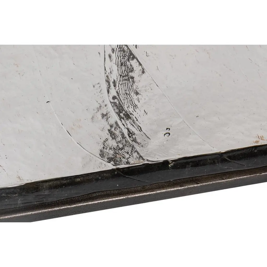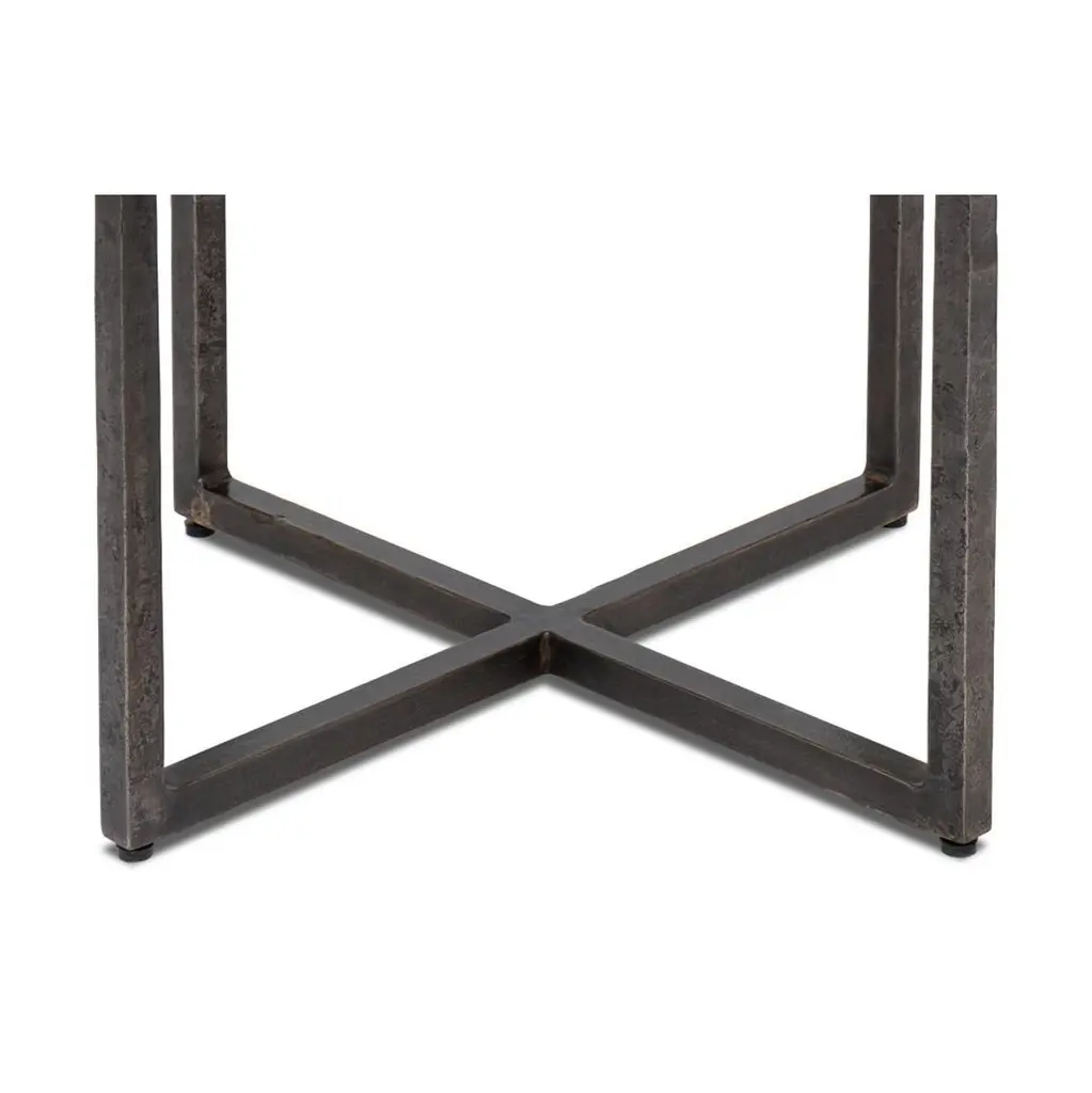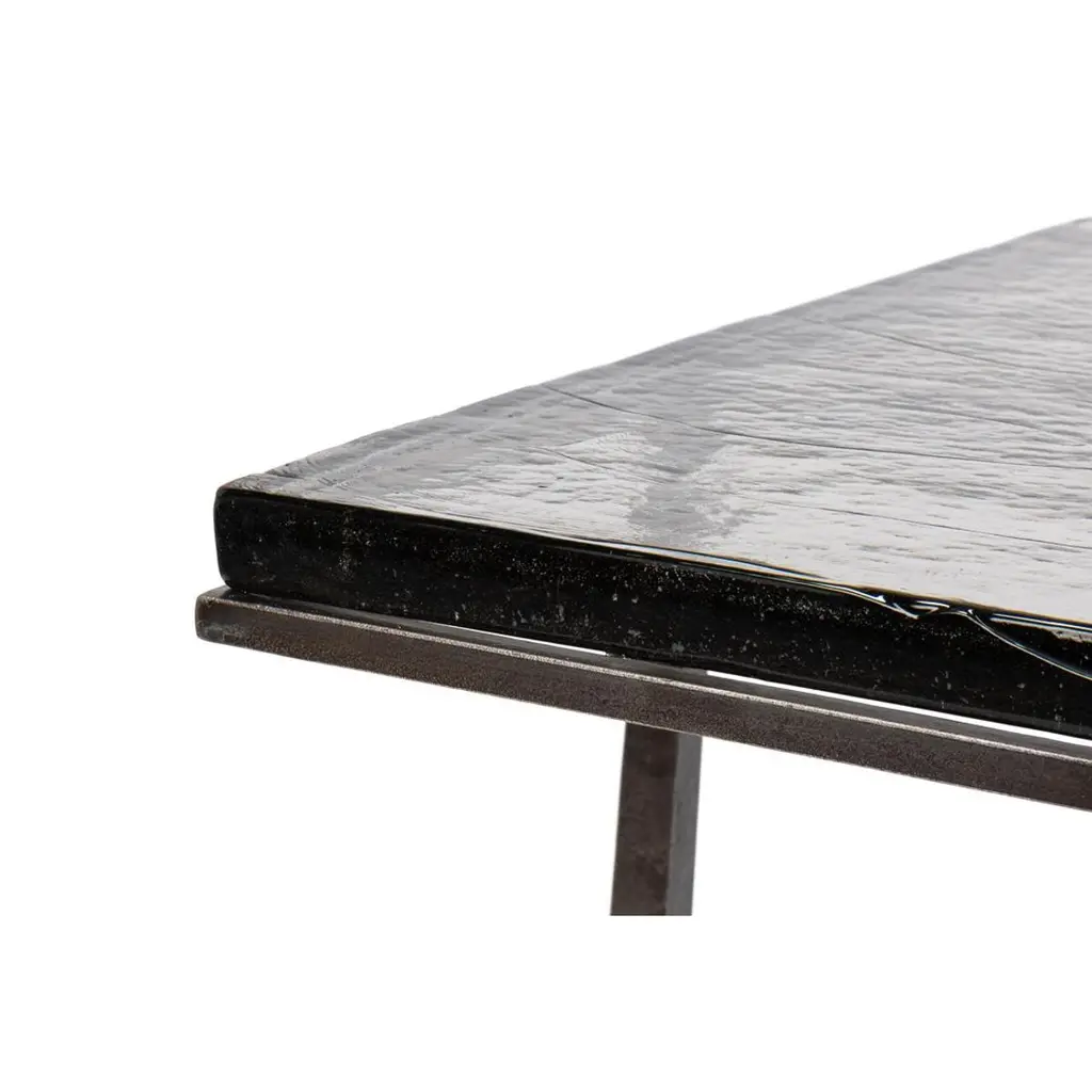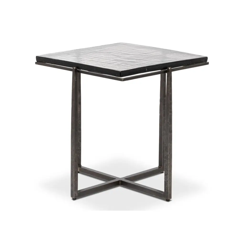 This exquisite piece features a hand-forged iron base in an aged nickel finish, lending a touch of vintage elegance while maintaining a sleek contemporary aesthetic. The casted glass top, with its organic texture, adds depth and character, reflecting light beautifully to enhance any interior.Perfect as a statement accent beside a sofa or as a sophisticated complement to your favorite reading nook, this end table offers a harmonious balance of durability and artistry. Its compact design makes it an ideal addition to both spacious and intimate settings, effortlessly elevating the ambiance of any room.Dimensions: 23" W x 23" D x 24" H