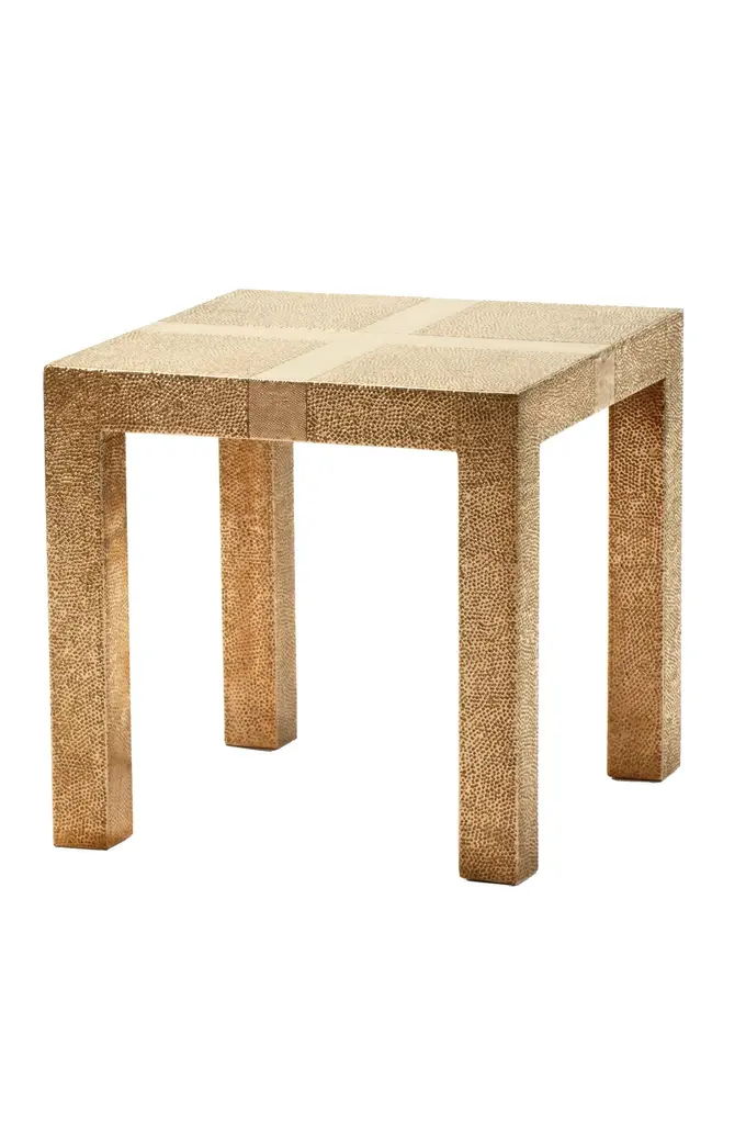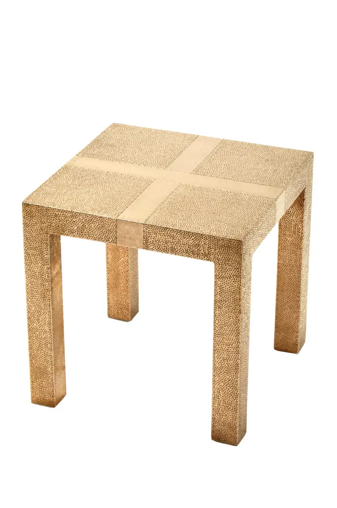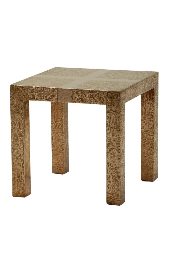 Alison Spear designed this elegant and minimal table for Stephanie Odegard during their trip together to Rajasthan, India. The craftsmen create patterns using diffrent types of hammerings in the metal sheets clad over teakwood structure.Square Drink Table In CopperAvailable Sizes : 18" x 18" x 16"HMaterial- Copper, wood, hand-carved Please note that moisture in air, sudden change in temperature and natural movement of wood over time causes the metal to wrinkle or bubble up. We use well seasoned, reclaimed teak and high quality marine grade MDF (wherever technically possible) to avoid and delay the above mentioned changes. However a perfect stability of metal cannot be guaranteed.Please note that our smooth finish metal clad pieces will have some unavoidable tool marks. This is proof that everything is done by hand. The smooth finish will not come out like a machine made perfect surface and the master artisan will do their best to make it look as good/clean/stable/perfect as he possibly can. Our hammered finishes are a much safer option if the tool mark scratches are unacceptable. The hammered finishes are also safer against eventual bubbling/wrinkles due to natural forces as mentioned above. We would love to send you some samples before order confirmation so that the finish can be judged and experienced first hand.Prices do not include shipping from India (for custom orders) or our MN warehouse (items from stock). That will be additional.