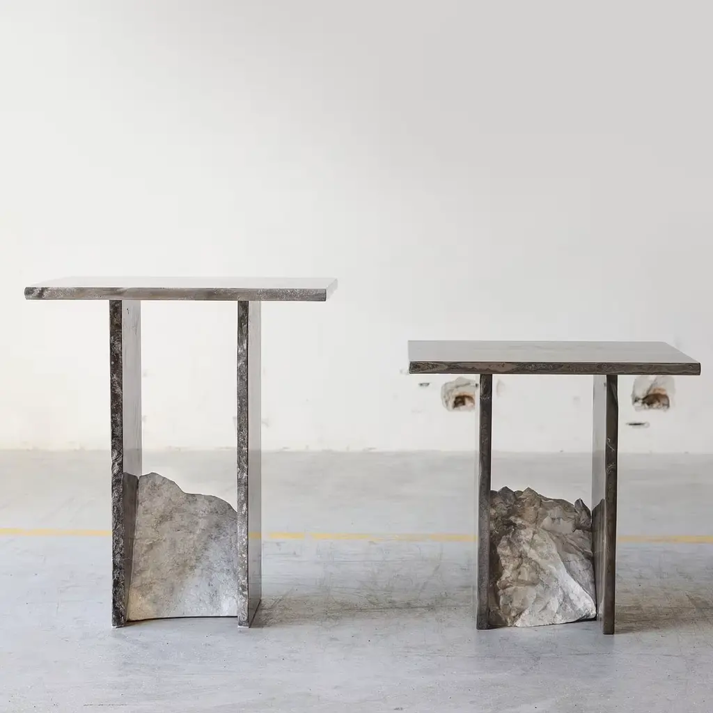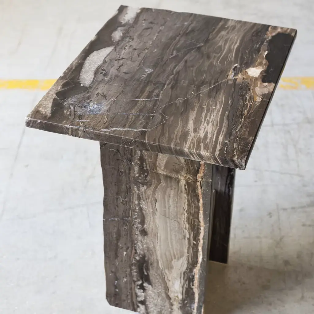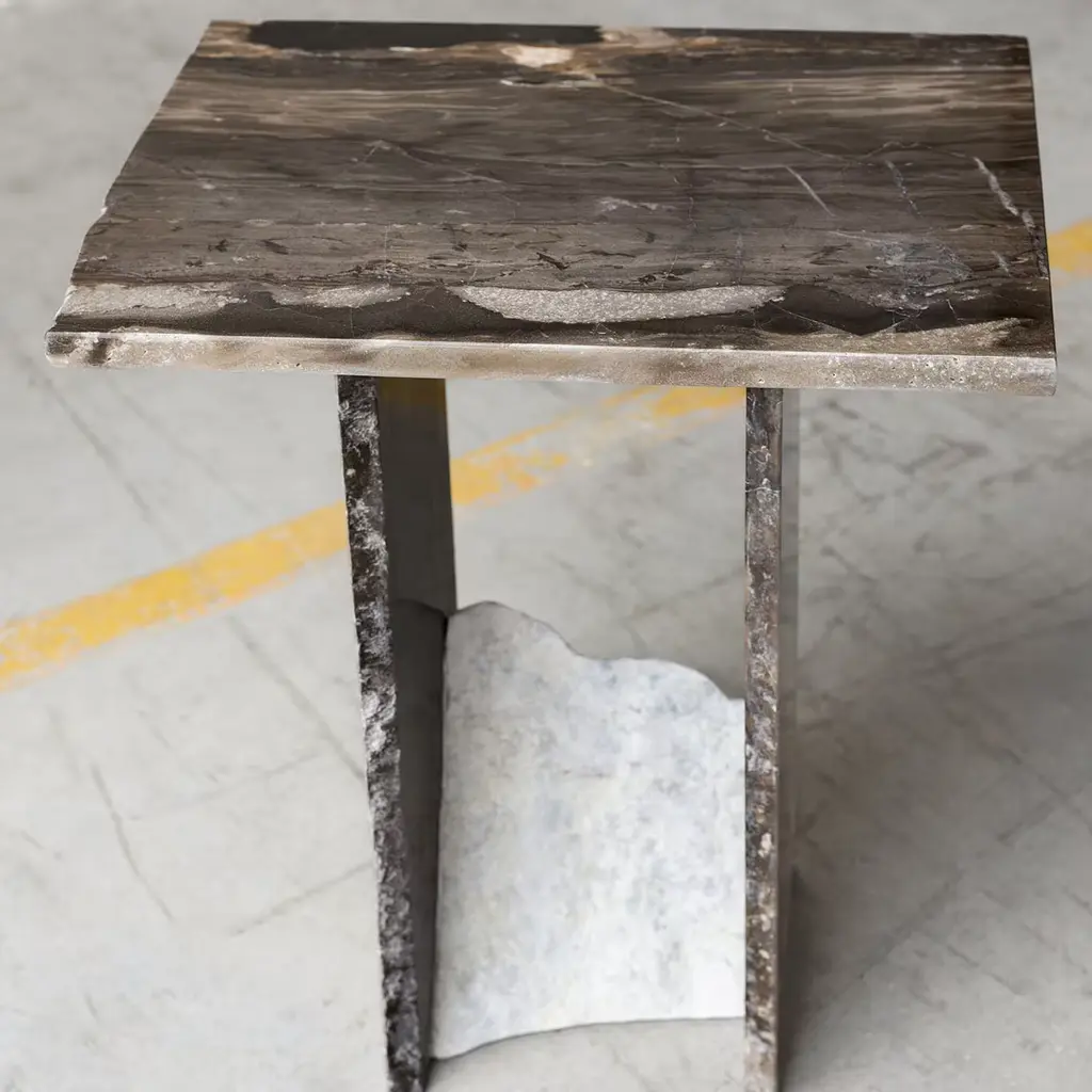 This side table is part of a set of two pieces. It combines sleek lines and sculptural marble stone elegantly juxtaposed with the likewise-fashioned top and side marble offcuts. A functional sculpture playing with geometry, balance, and nature to elevate the look of any contemporary living space. The marble structure is composed of frappuccino marble whereas the base is Invisible Grey.