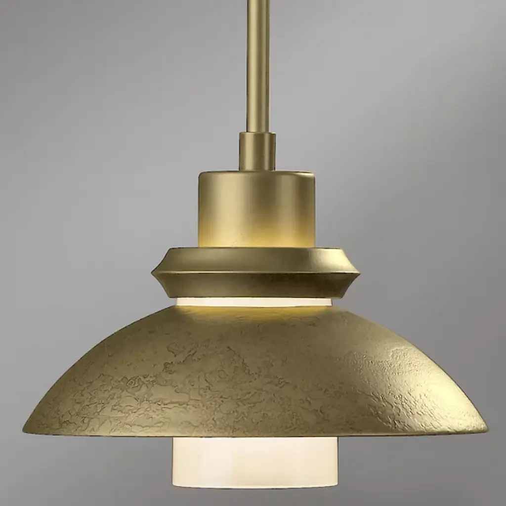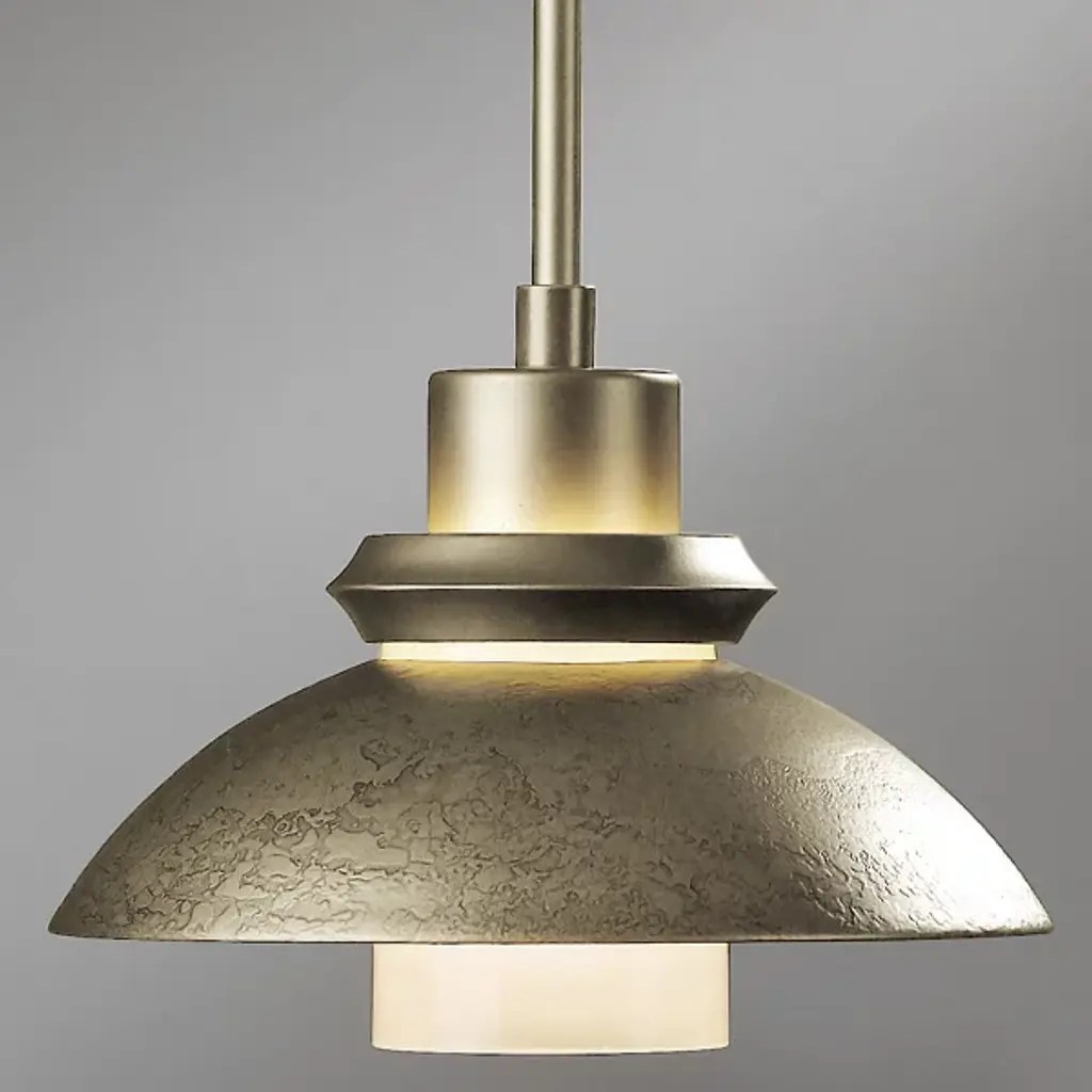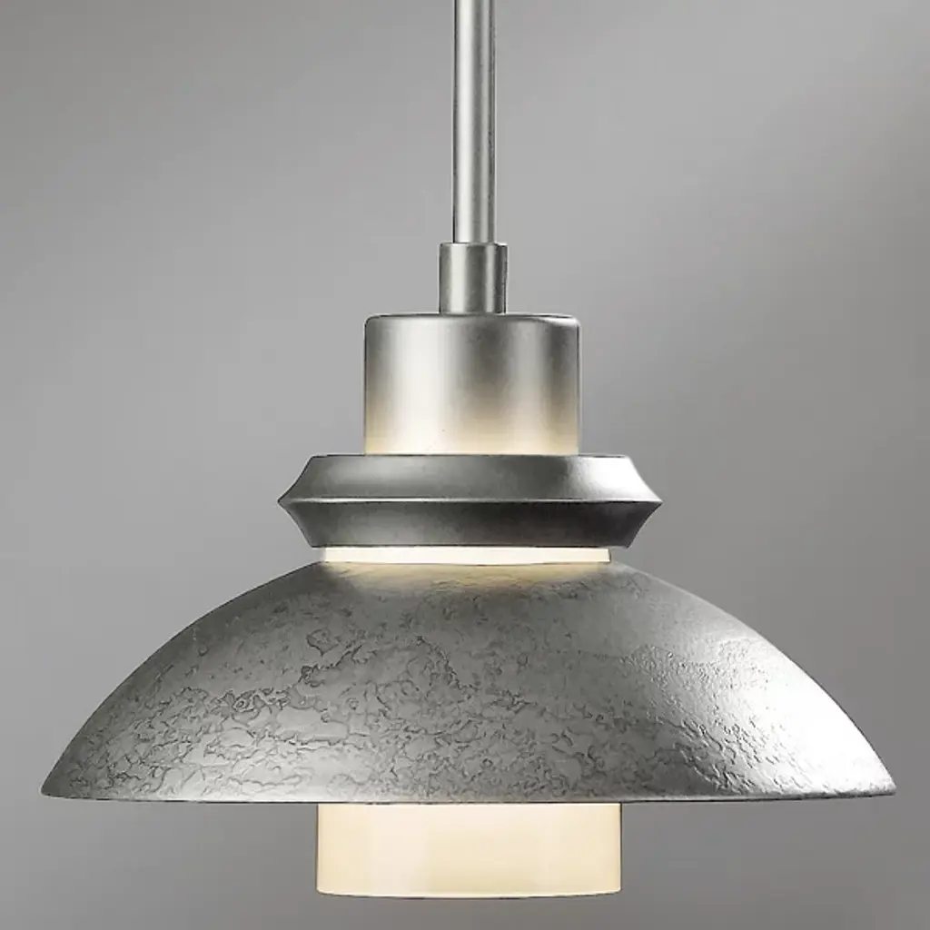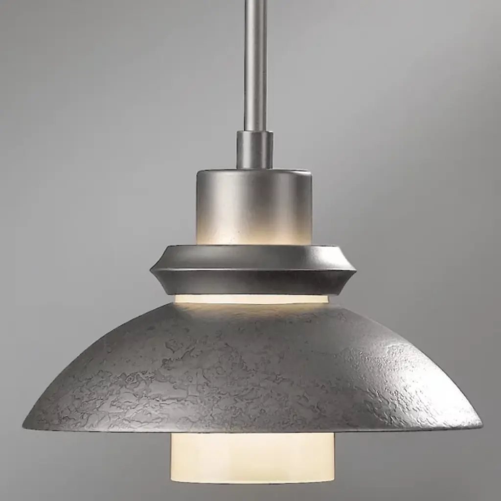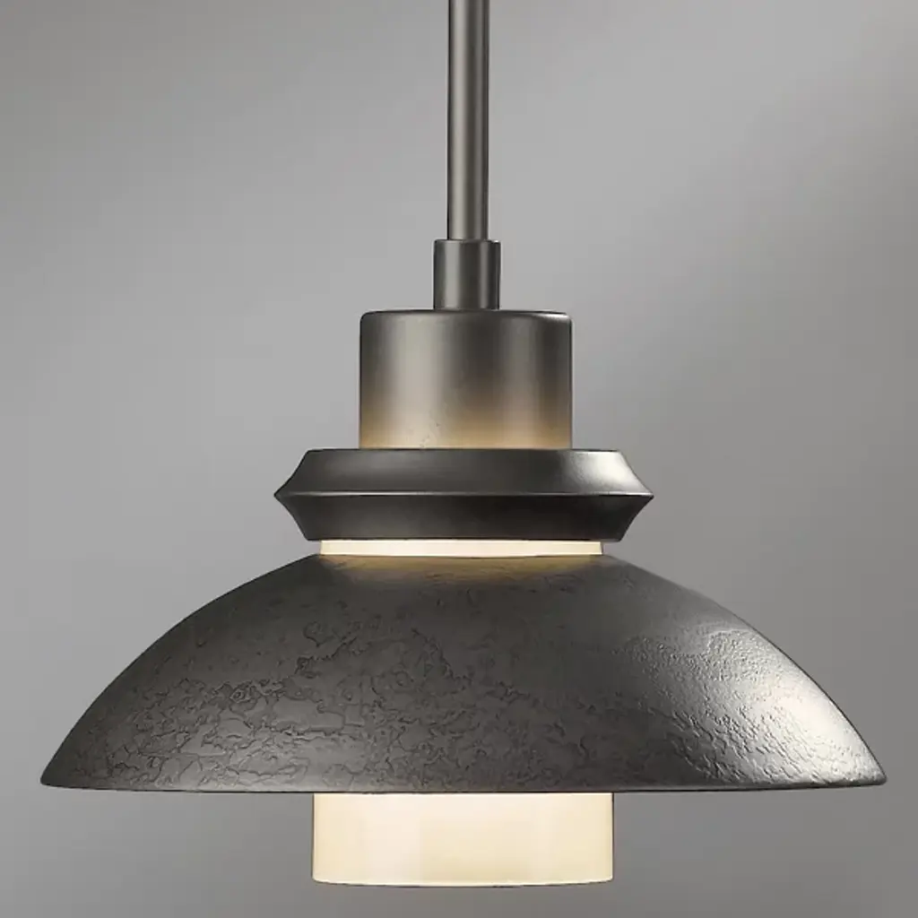 An artful choice for dressing up the ceiling. The Hubbardton Forge Staccato Adjustable Large Pendant offers a handsome visual flow as the eye travels down the dome-shaped wrought iron shade and rests on the hand-blown glass diffuser. The small slat between the shade and diffuser creates an attractive halo for a warm look. The Staccato can be finished in a number of earthy tones.