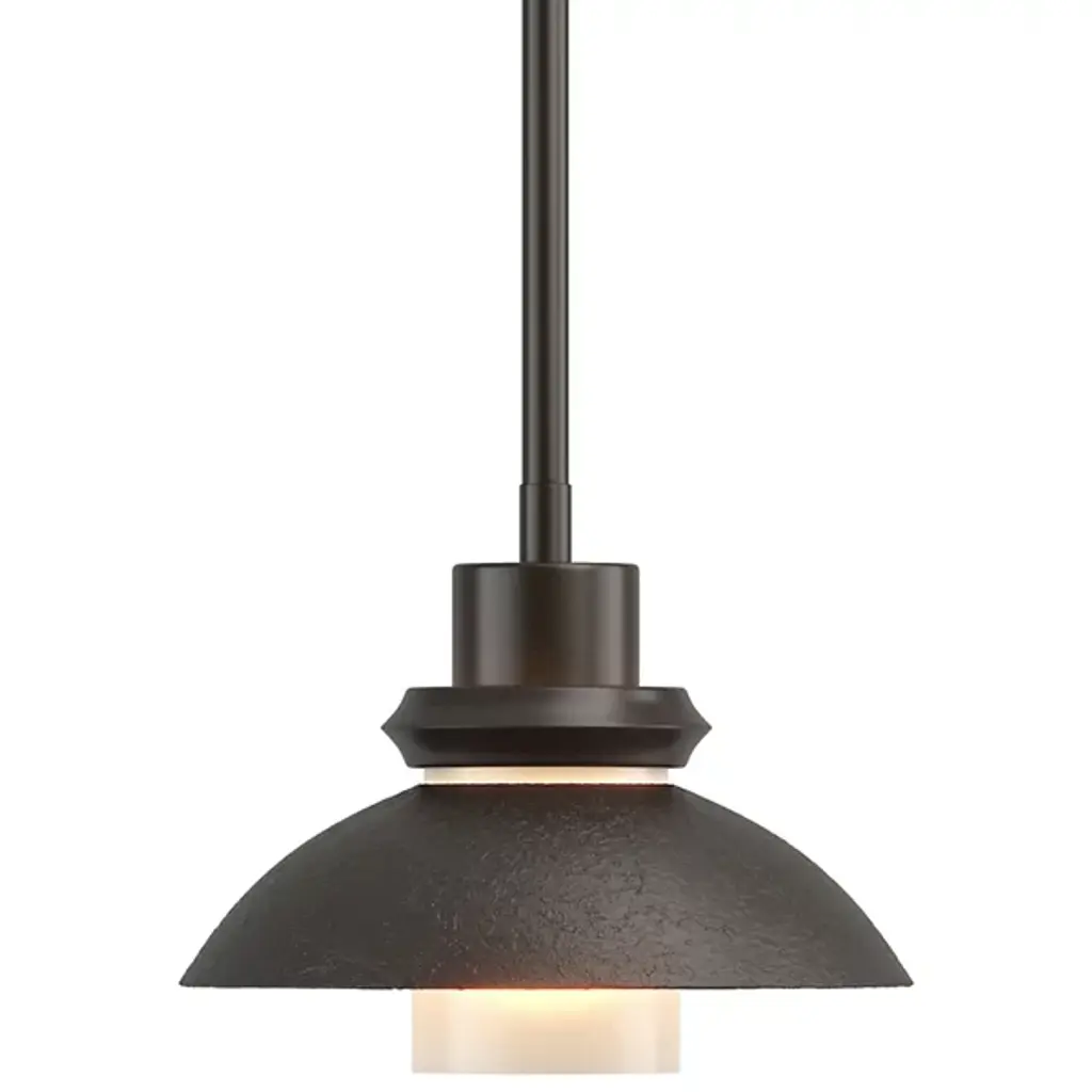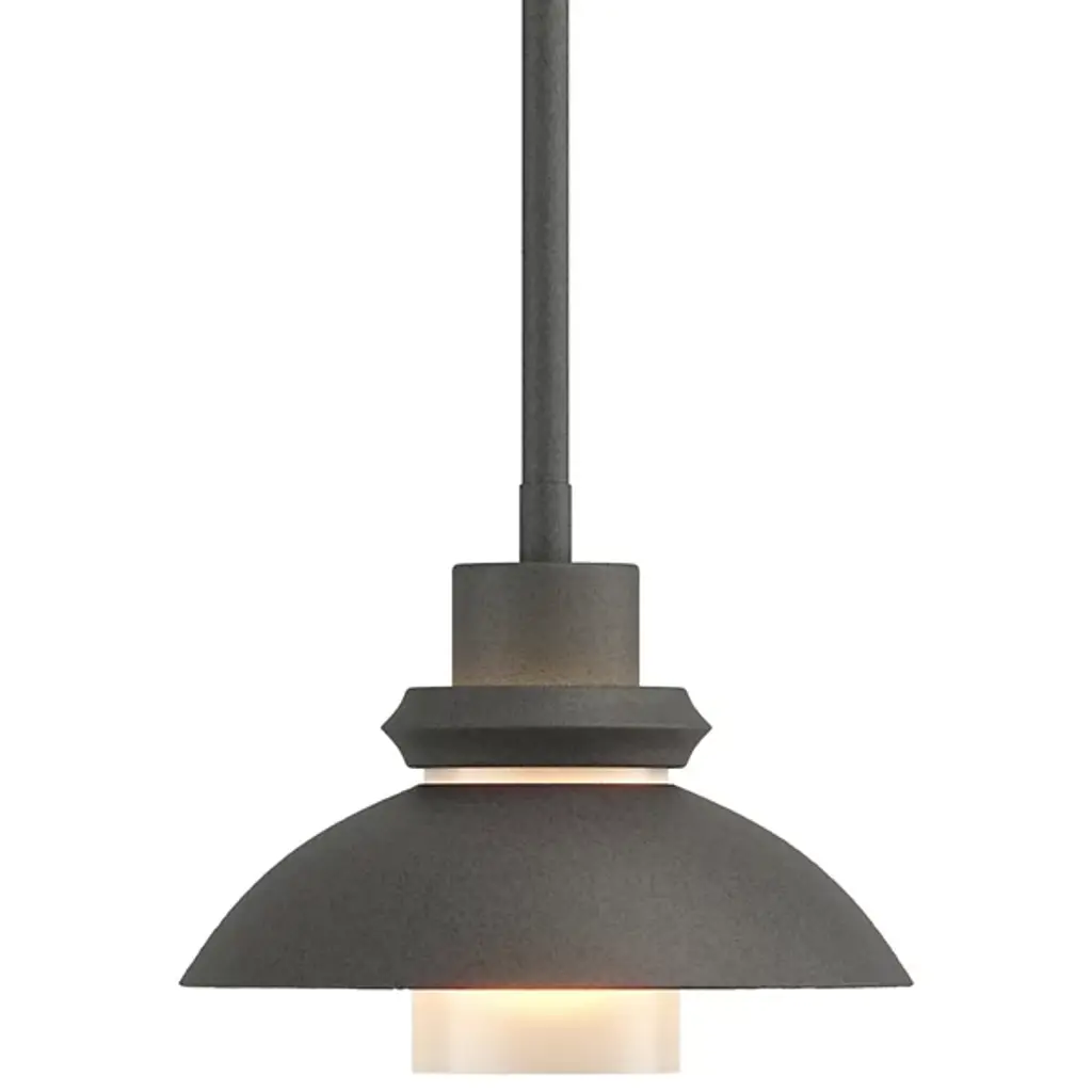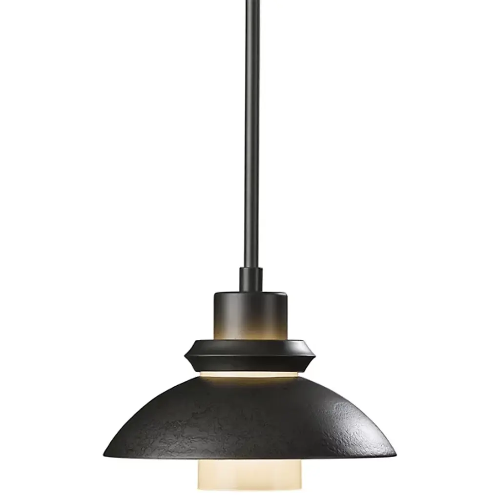 An artful choice for dressing up the ceiling. The Hubbardton Forge Staccato Adjustable Large Pendant offers a handsome visual flow as the eye travels down the dome-shaped wrought iron shade and rests on the hand-blown glass diffuser. The small slat between the shade and diffuser creates an attractive halo for a warm look. The Staccato can be finished in a number of earthy tones.
