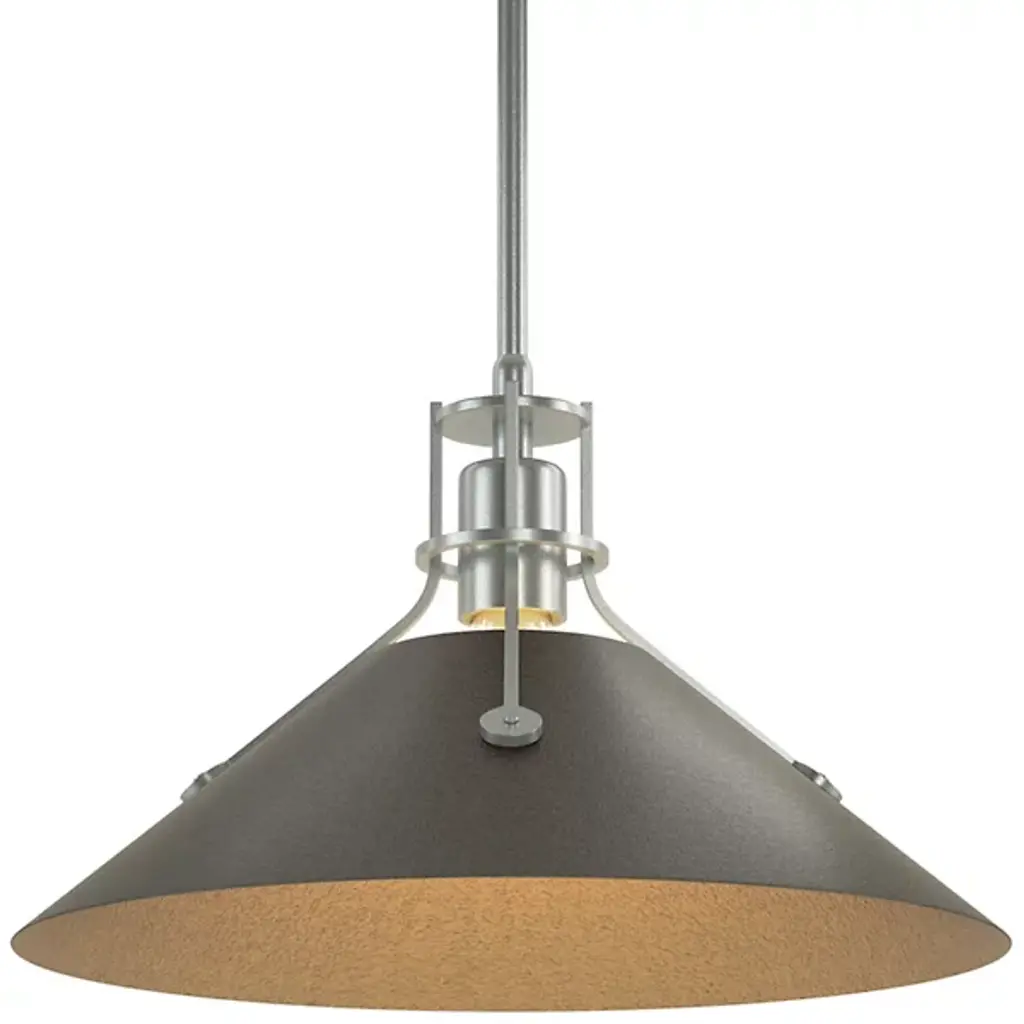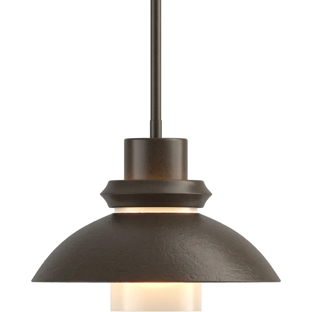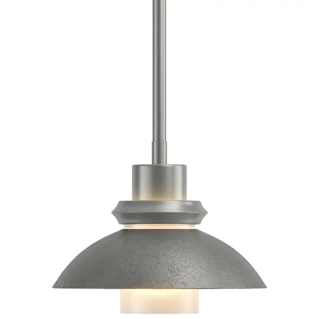 An artful choice for dressing up the ceiling. The Hubbardton Forge Staccato Adjustable Large Pendant offers a handsome visual flow as the eye travels down the dome-shaped wrought iron shade and rests on the hand-blown glass diffuser. The small slat between the shade and diffuser creates an attractive halo for a warm look. The Staccato can be finished in a number of earthy tones.