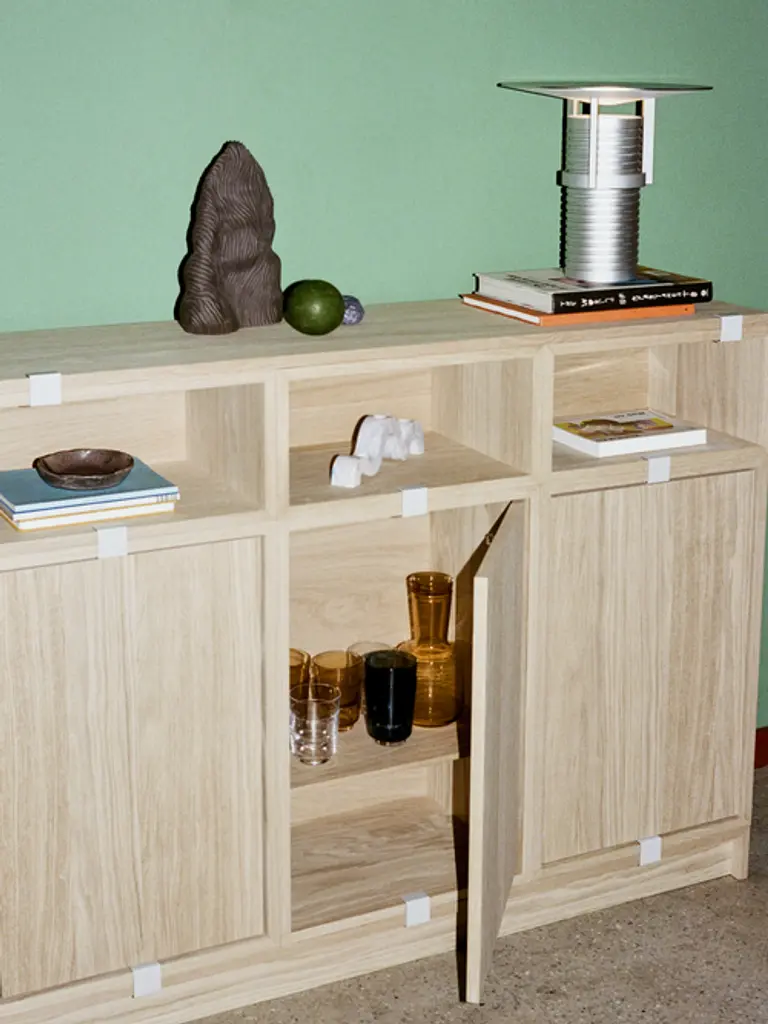 Being both versatile and functional, the Stacked Storage System can be arranged and rearranged for the exact configuration that you’d like, whether it be as shelving setups, sideboards, bookcases, or side tables. The design can easily be refreshed by playing around with the space between the modules or mounting the modules with a backboard directly onto the wall. Use Modules with a Door for protective storage.