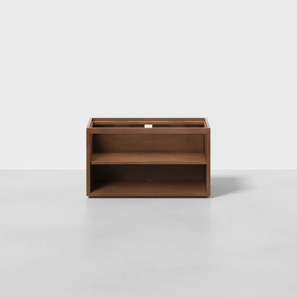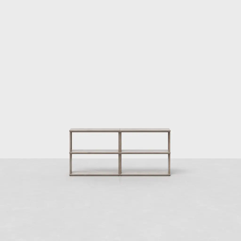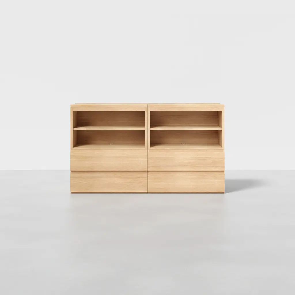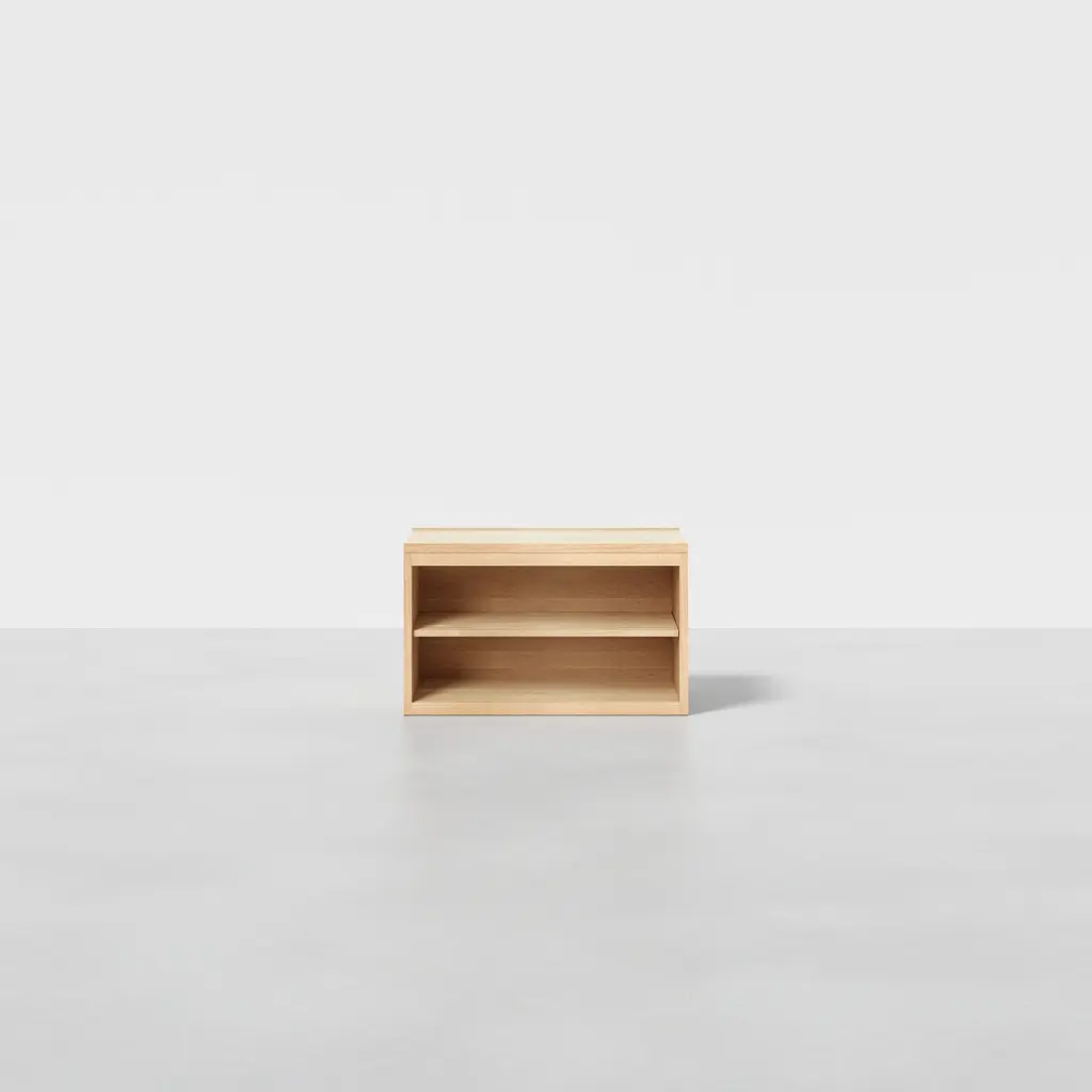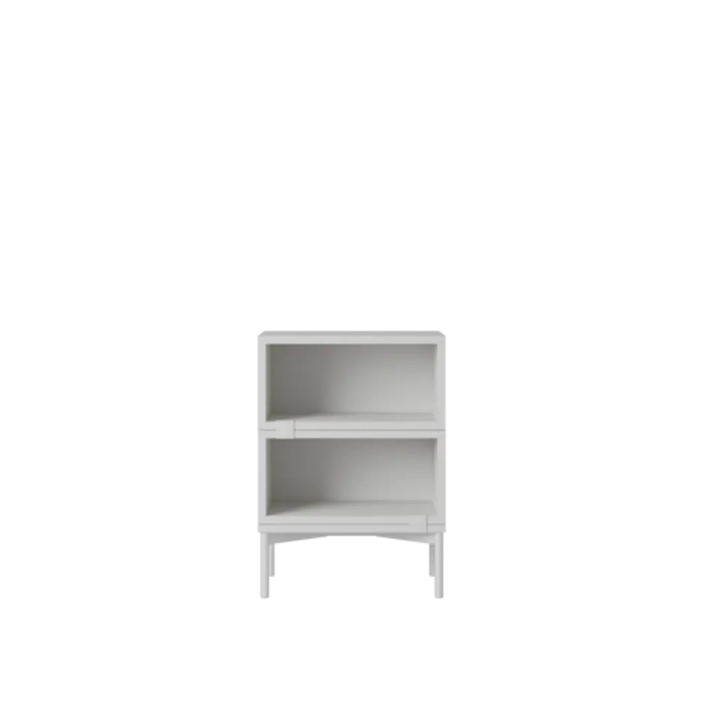 Being both versatile and functional, the Stacked Storage System can be arranged and rearranged for the exact aesthetic and functional needs of any space. Seen here is a predesigned Bedside Table configuration that brings modern and functional storage to any bedroom setting. All modules with backboard can be mounted directly onto the wall.