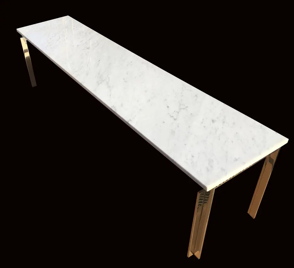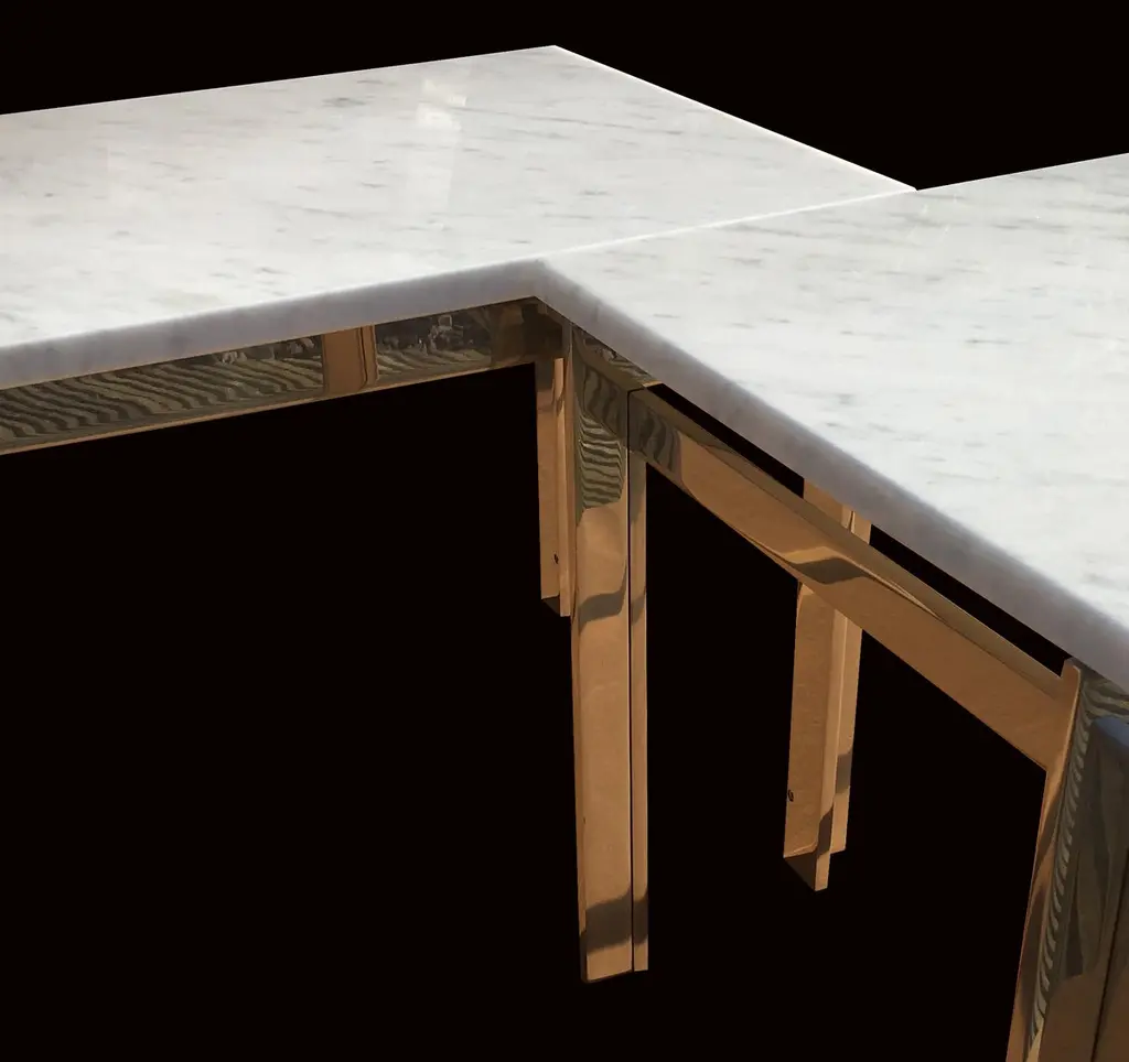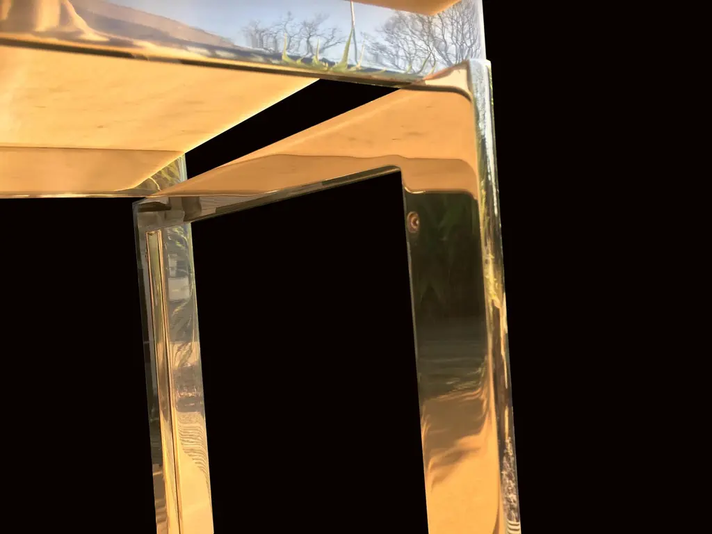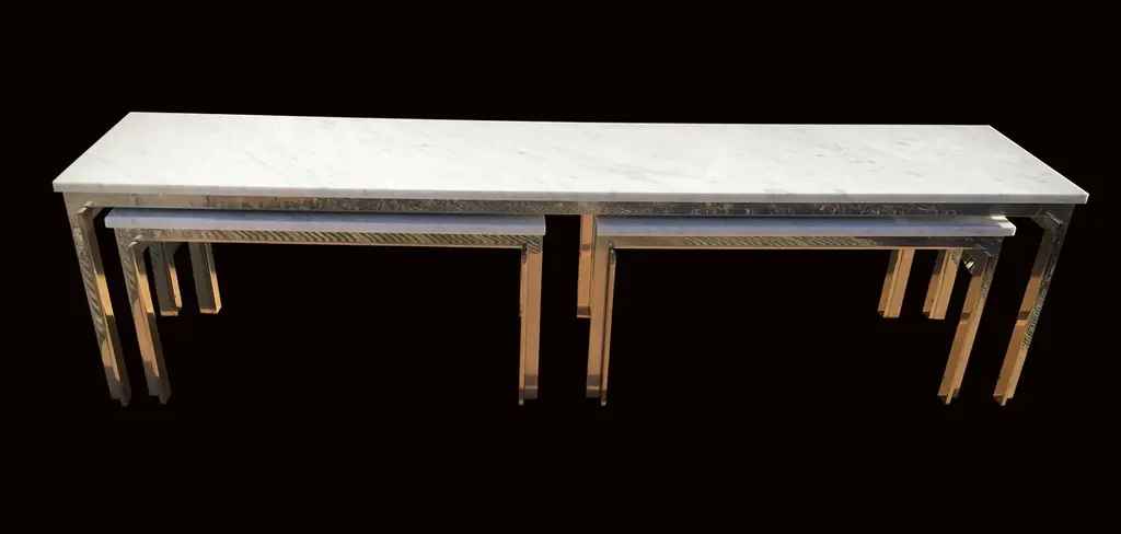 These tables are part of our new bespoke service.Please note that they the metal parts are bright silver colour, as they look slightly gold in some of the photos!They are produced from mirror polished solid stainless steel, every piece handmade in our own workshops, to the highest standard using top quality materials, and in this case, designed in the manner of Poul Kjaerholm.The long low table is our solution to where to put the flat screen TV that is going to look at home in a stylish midcentury Scandinavian style room, shown here with an optional pair of matching side tables which can be stored under the main table.The pieces shown are ready for immediate delivery, and there will be a console table in the same range ready shortly, photos will be added as soon as it is available.We are able to produce pieces in a large range of materials, tops from many kinds of Marble, Granite or Glass, and bases from steel, bronze brass or aluminium and finished to your preference.Price shown is for this set of 3.Sizes are for the pair height 35 cm, width 80 cm, depth 43 cmfor the long table height 46 cm, width 189 cm, depth 43 cm