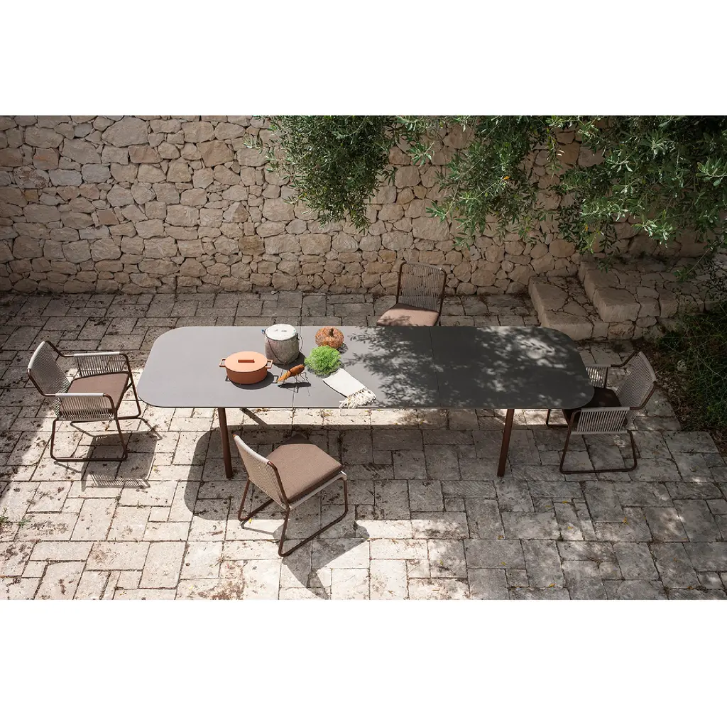 In PIPER extendable table, the simplicity of the design is balanced by the materials used: stainless steel, available in smoke, milk or rust colors, for the structure and Lapitec® for the top. This innovative full-body sintered stone combines an aesthetic value with very high physical and mechanical properties: the potential of technical porcelain meets the consistency and elegance of the natural stone. RODA chose the mole color variant for the PIPER table, a transversal shade easy to match with the seats from the same collection or from other outdoor lines.