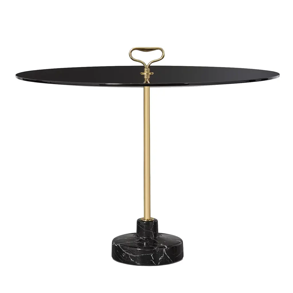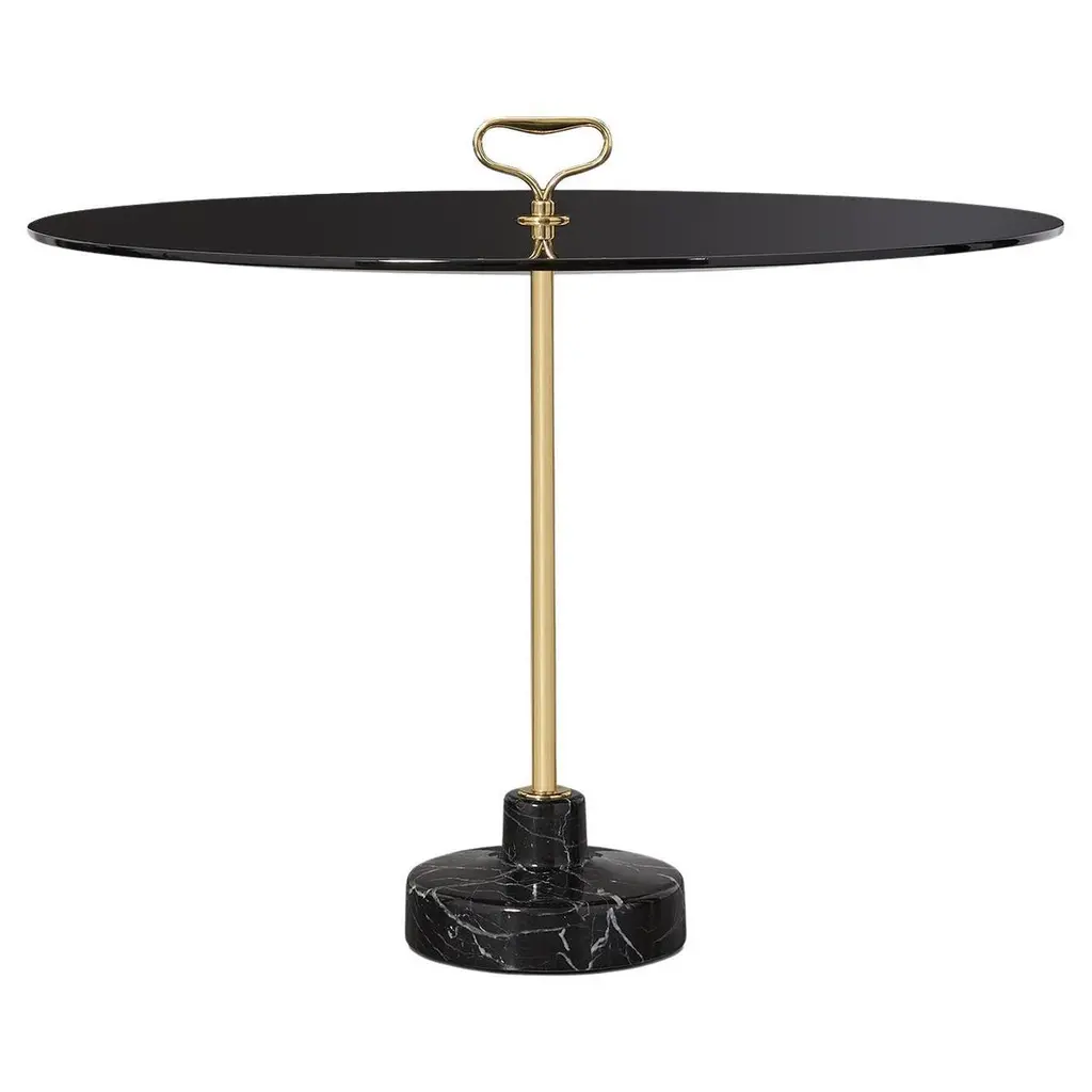An exquisite design created by Ignazio Gardella for the Stand Collection of side tables, this gorgeous piece is distinguished by a vintage-inspired combination of hues. Resting on a black marble base, it features a brass stem topped with a practical handle and a round, polished green-lacquered top (55cm diameter) in wood. Available for customizations, please consult the Concierge for options.