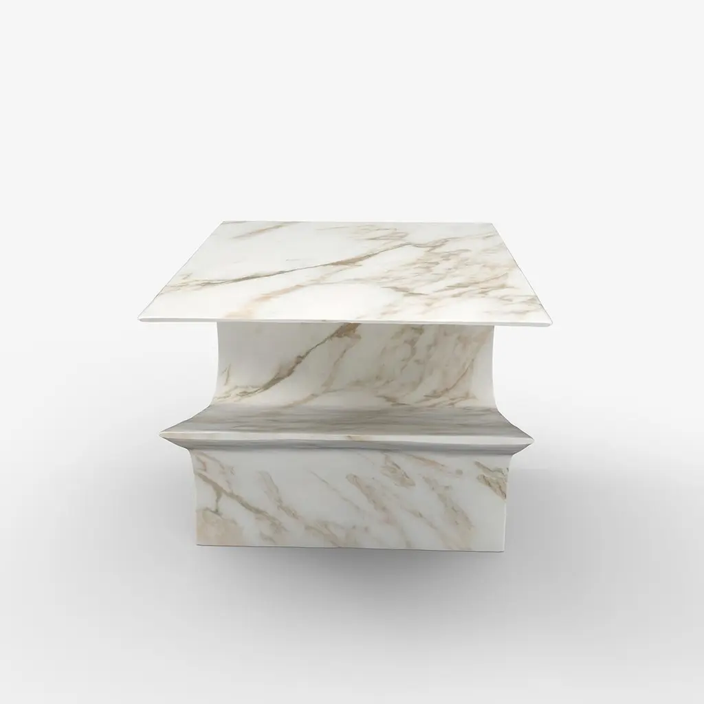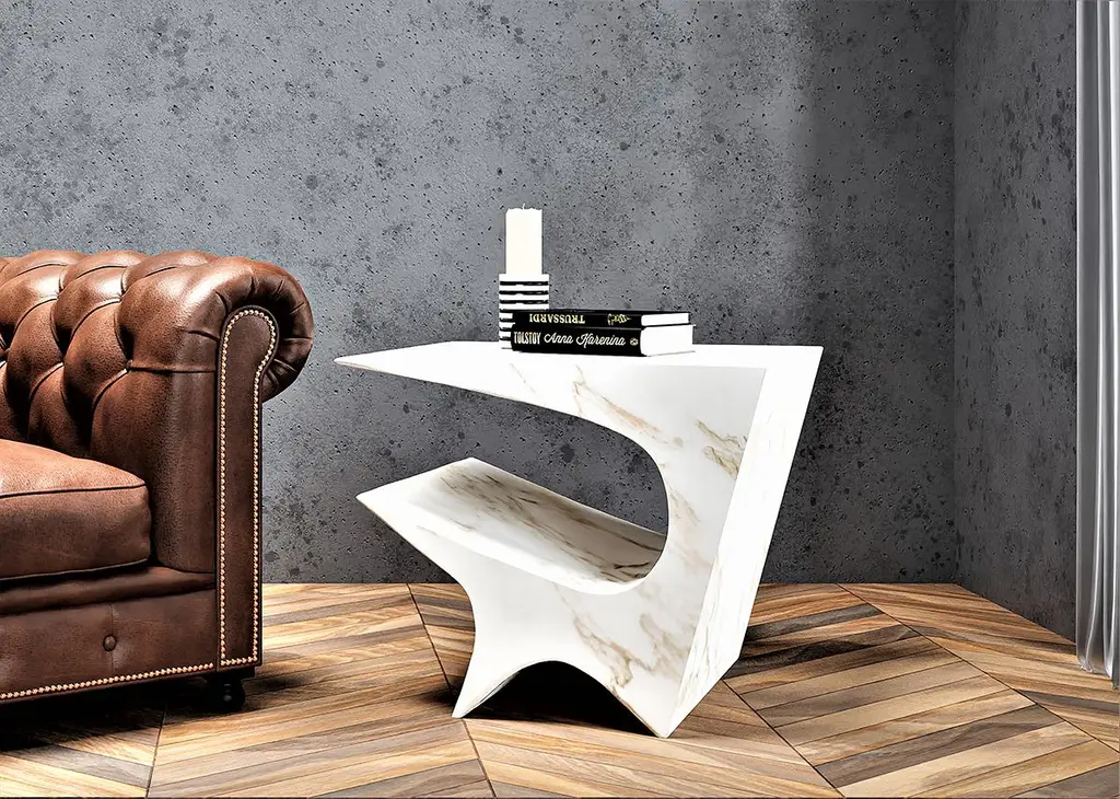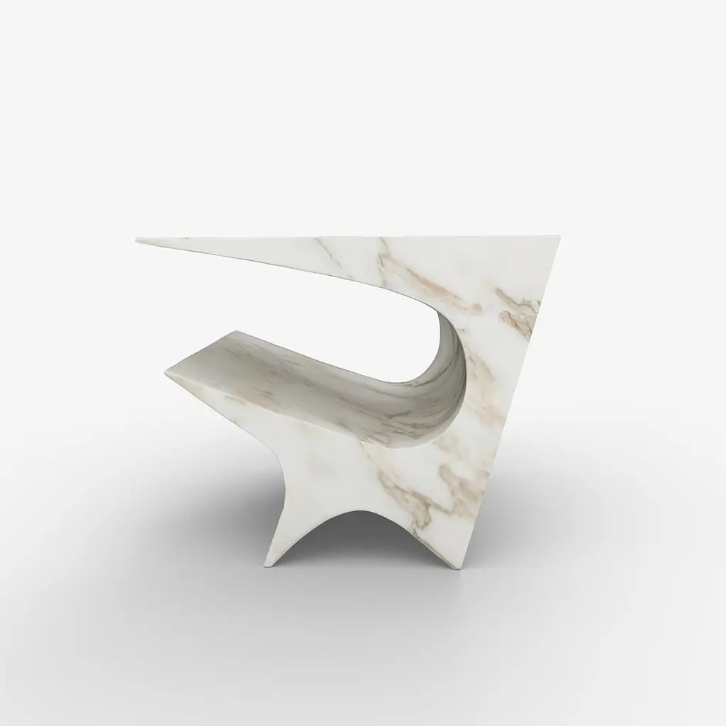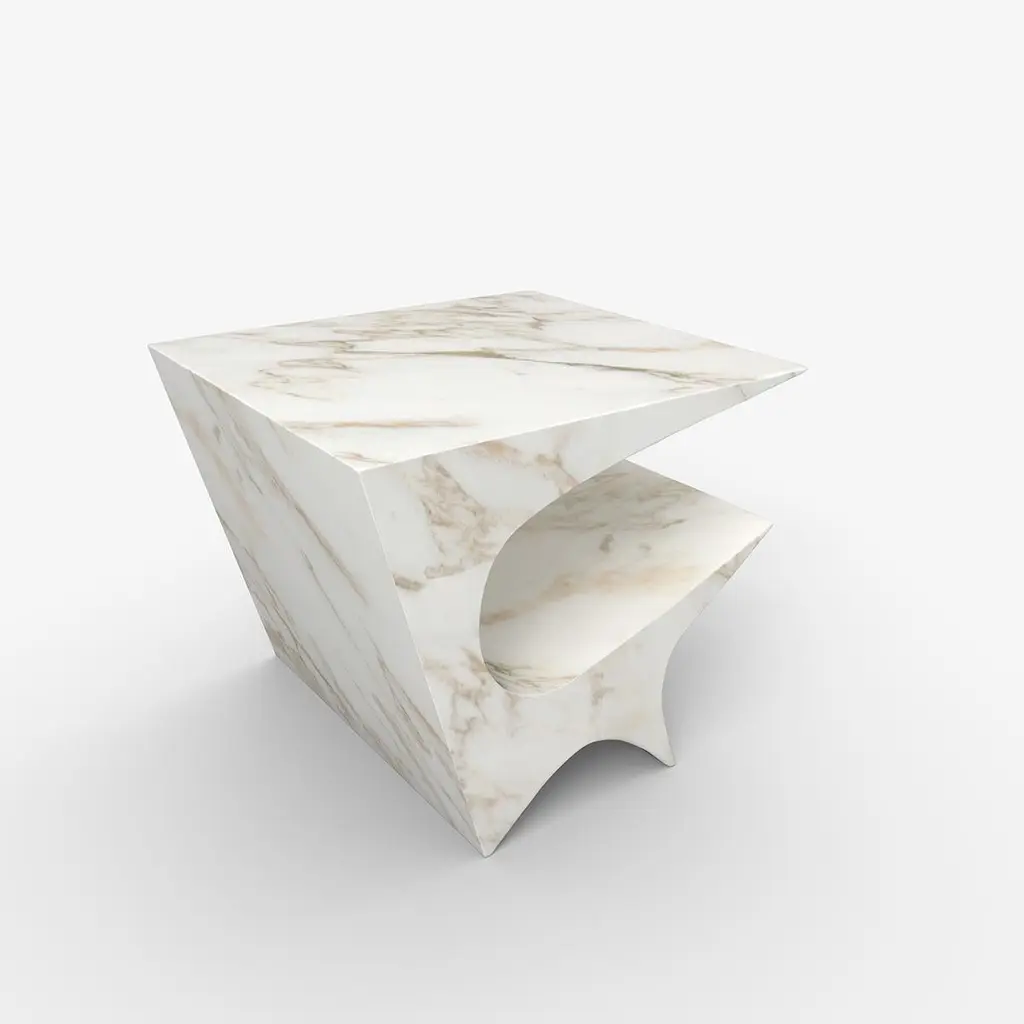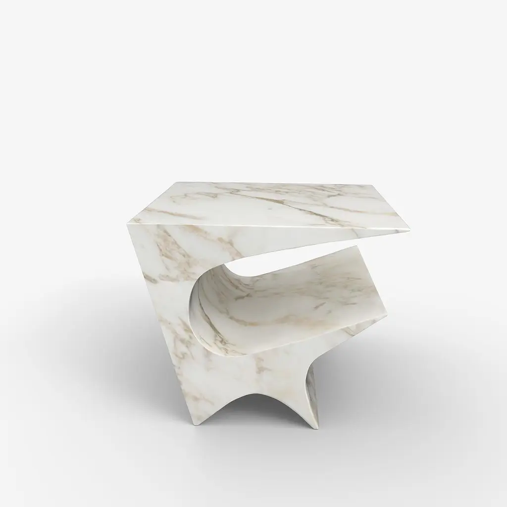 This modern, minimalist side table by award-winning artist/designer Neal Aronowitz is a powerful sculptural statement and a dynamic presence in any room! The Star Axis Collection represents another playful and iconic form in the constellation of furniture and lighting by Neal Aronowitz. The Star Axis Side Table in Marble has already made its mark in the design world as a 2022 NYCx Design Award winner for residential side tables. Powerful yet restrained, each piece is unique and crafted by Neal Aronowitz' Portland, Oregon studio. The marble has a rich patina with the subtle markings and eternal characteristics of stone. The open angular shelf holds books and magazines. As a side or end table it serves as functional furniture and blurs the distinction between art and craft. The surface is well sealed and highly resistant to stains and easy to clean. There is simply nothing else like it! Custom sizes and colors are available.