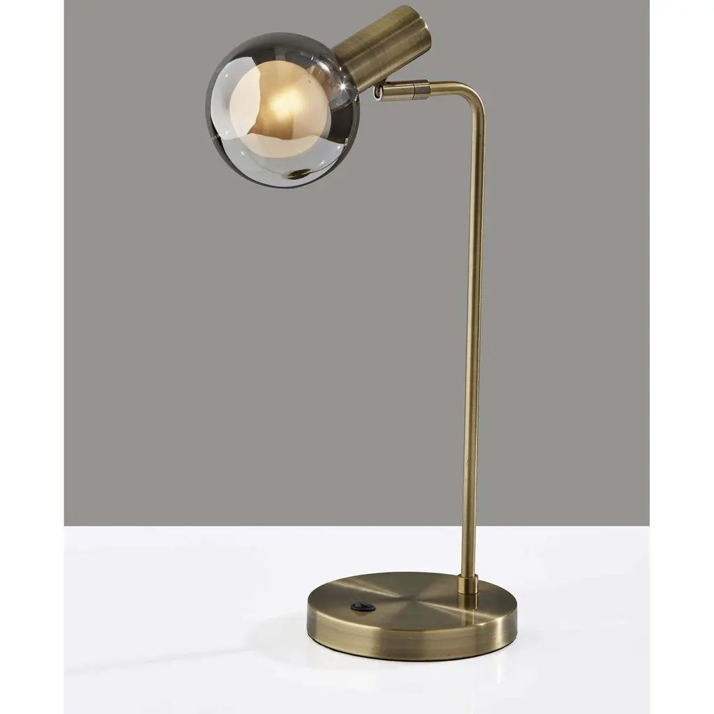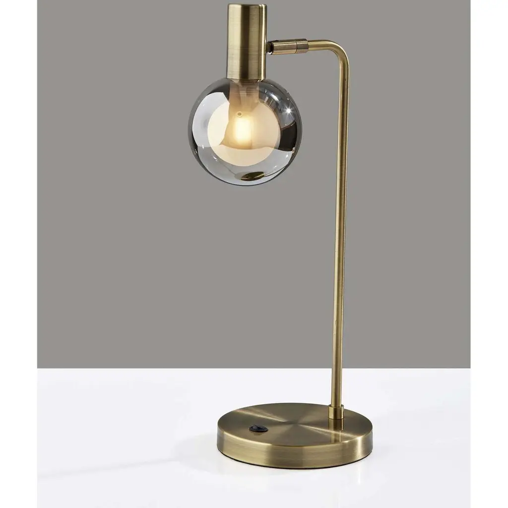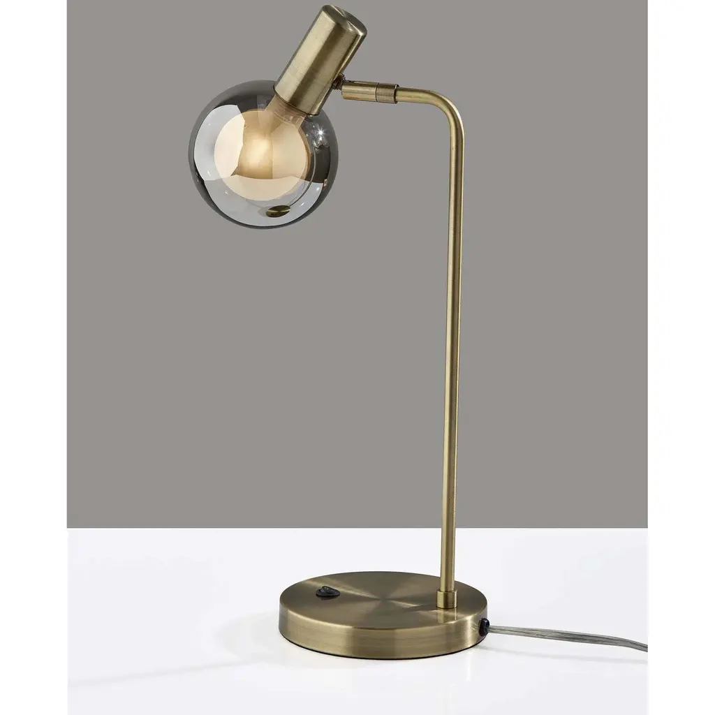 The Starling LED lamp adds instant retro-modern appeal to desks, end tables, accent tables, and nightstands. The body of the lamp is crafted entirely of metal with an antique brass finish. Rising from the 5.5" diameter round base is a softened L-shaped pole supporting the eye-catching glass shade. With a smoked outer glass design and frosted interior, the 4" diameter globe shade is simple yet unique, while the included LED bulb is energy efficient at only 4W and produces a soft, warm glow. For added versatility, the base of the lamp shade features an articulation point, allowing you to redirect the shade for a variety of looks and lighting options. The table lamp is easily turned on or off with a rocker switch located on the base. Complete your décor with the coordinating Starling LED floor lamp featuring a stunning Sputnik silhouette.