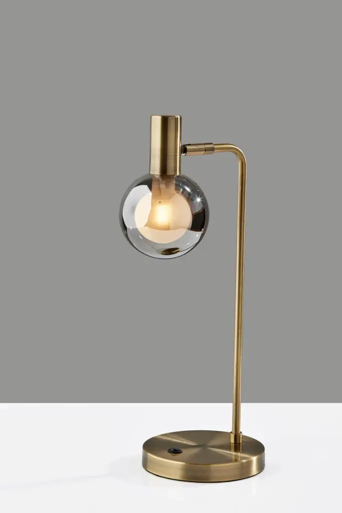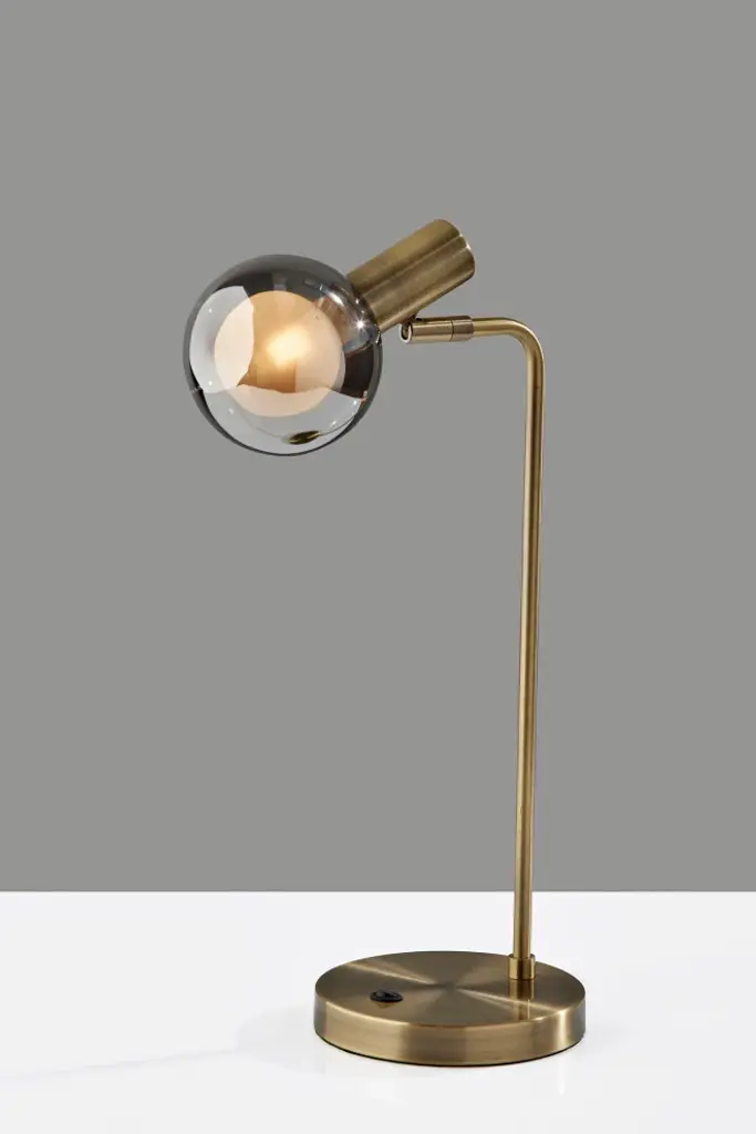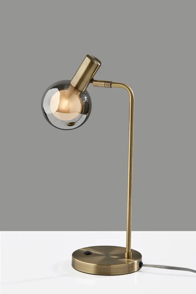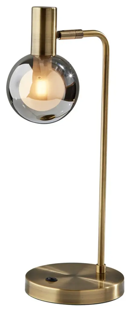 The Starling LED lamp adds instant retro-modern appeal to desks, end tables, accent tables, and nightstands. The body of the lamp is crafted entirely of metal with an antique brass finish. Rising from the 5.5" diameter round base is a softened L-shaped pole supporting the eye-catching glass shade. With a smoked outer glass design and frosted interior, the 4" diameter globe shade is simple yet unique, while the included LED bulb is energy efficient at only 4W and produces a soft, warm glow. For added versatility, the base of the lamp shade features an articulation point, allowing you to redirect the shade for a variety of looks and lighting options. The table lamp is easily turned on or off with a rocker switch located on the base. Complete your décor with the coordinating Starling LED floor lamp featuring a stunning Sputnik silhouette.Coordinates with mid-century modern and vintage décor.Integrated LED lighting is energy efficient.The LED 3,000K color temperature creates warm white light.An articulation point at the base of the shade allows you to adjust the lighting direction.The Starling collection also includes a Sputnik-style floor lamp.4W G9 LED Included