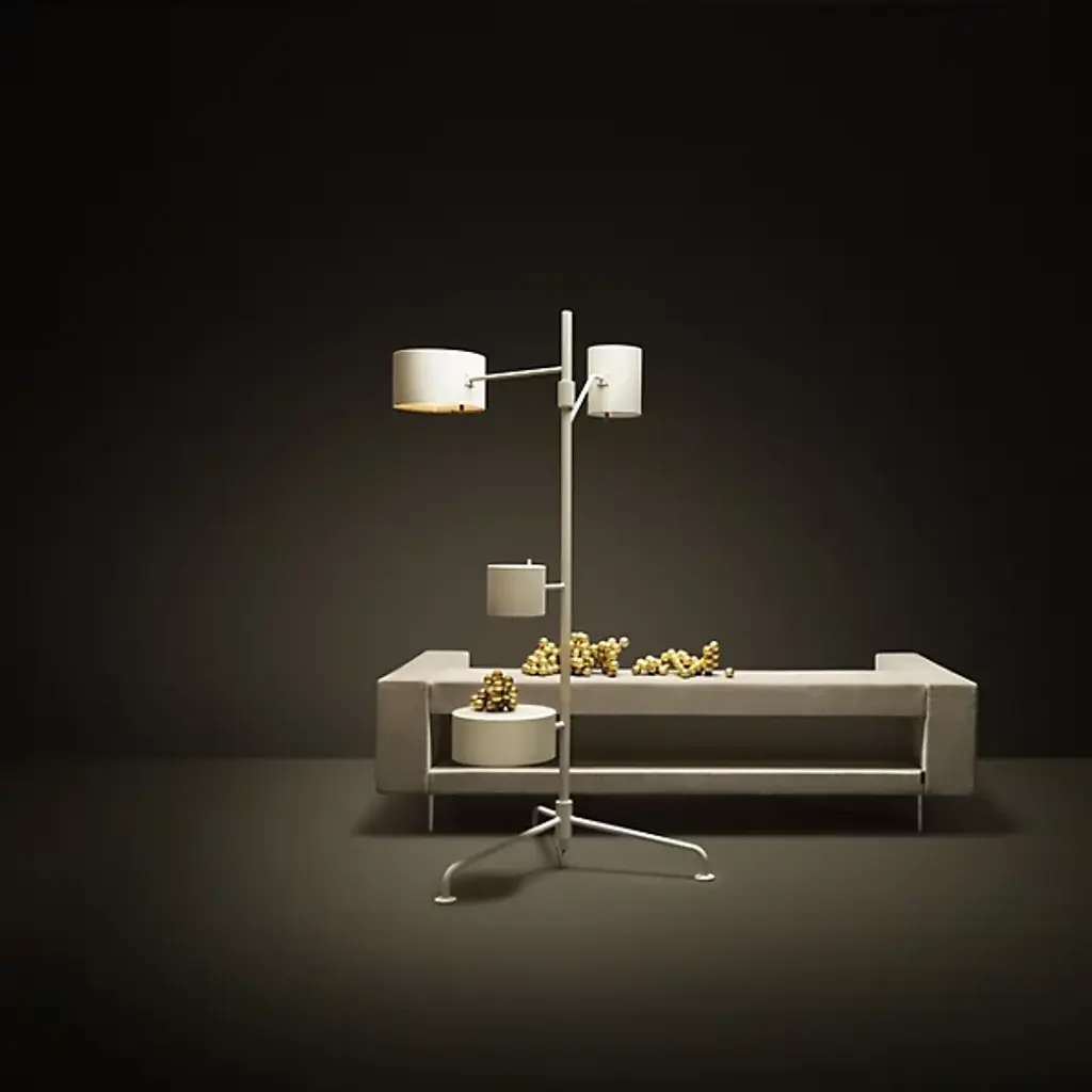 The Statistocrat LED Floor Lamp by Moooi brings multifunctionality to your living space. It features 3 shades with the tallest projecting light downwards and the widest doubling as a reading lamp. Look closer and you'll discover the lowest shade is actually a side table ideal for keeping snacks, beverages and reading materials easily accessible. Built-in adjustable dimmers on each shade provide even more convenience, making this floor lamp an impressive addition to any room.