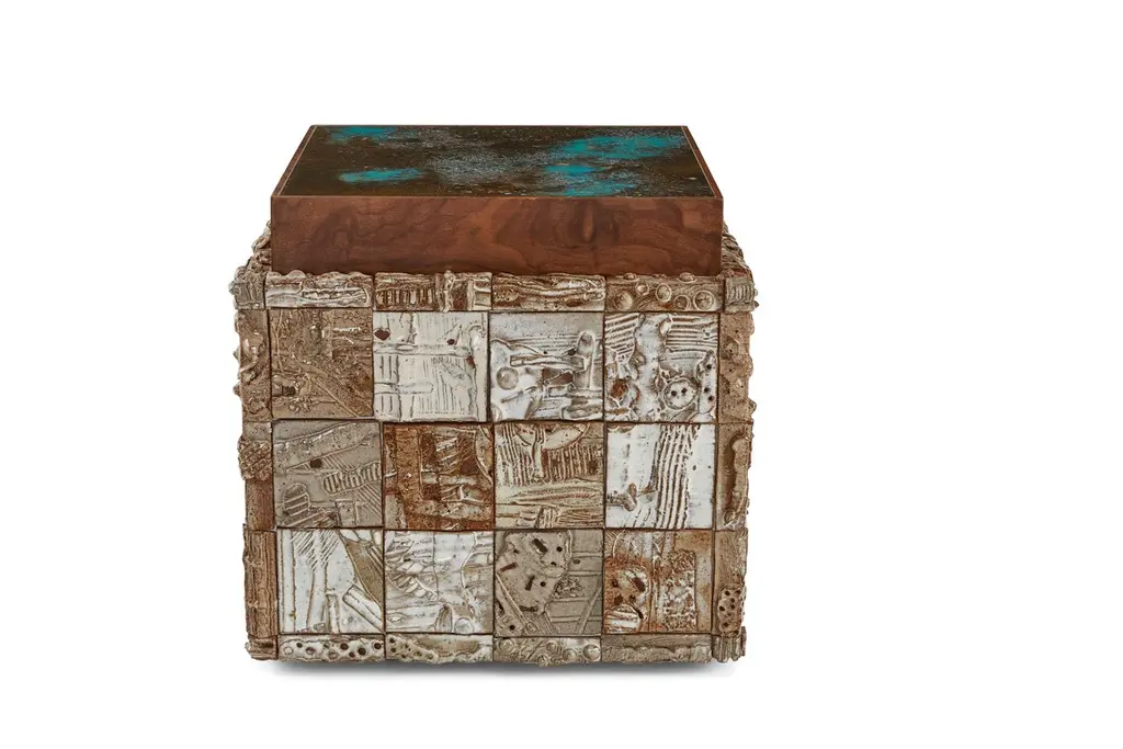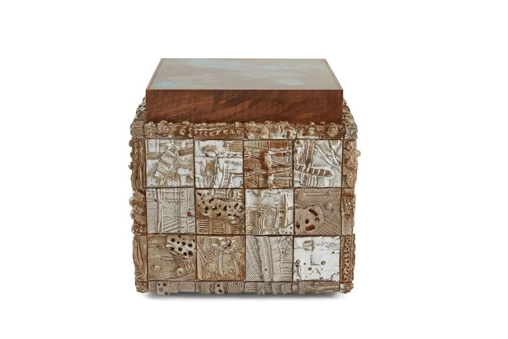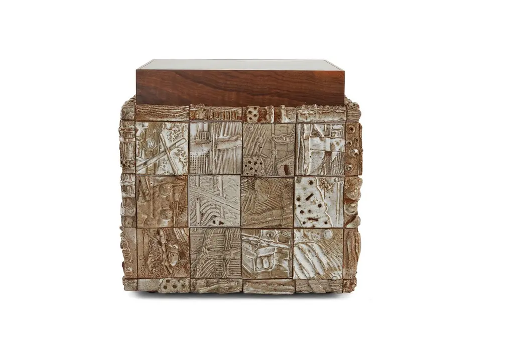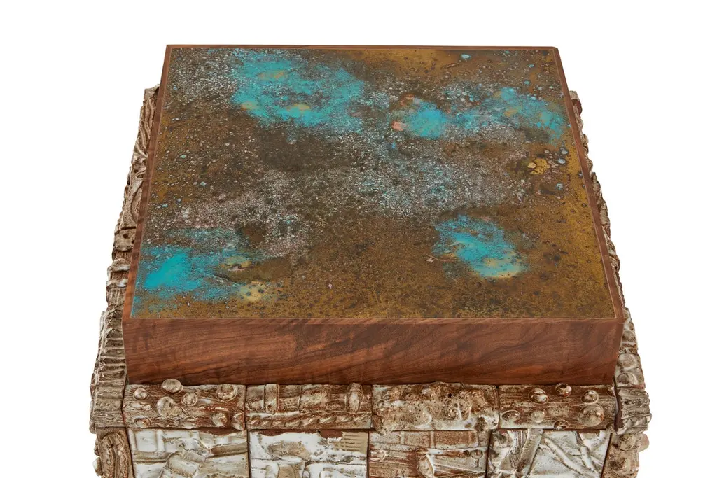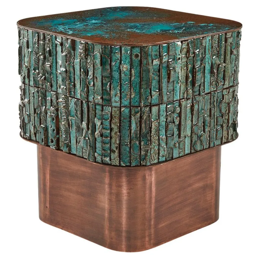 Stellar cube side table by Egg DesignsDimensions: 56 L x 56 D x 50 H cm Materials: Walnut timber, handmade Ceramic, Verdigris solid copperFounded by South Africans and life partners, Greg and Roche Dry - Egg is a unique perspective in contemporary furniture inspired with a soul that’s deeply rooted in the African continent.We believe Egg has a distinctive African design dialect.We dream that our products will not only be judged by their function and form, but by the beauty of their eternal narrative.In everything we create we must answer the question, “Is it Egg enough?”Egg, is a spirited blend of heritage, passion, meaning and African soul. It stands the test of time. It’s curiosities that make you smile. It’s love and truth that can be seen from afar and equally found in the minutest details. That’s why every piece we craft comes from Africa and carries within it a part of the African soul. We’re a melting pot of tribal craft, African heritage and modern luxurious expression.“If it’s not Egg enough, it’s not worth doing!”We have widened the prism of contemporary African design in Modern Antiques, high-end Furniture, lighting and custom interiors inspired by an African provenance for a modern, international customer.