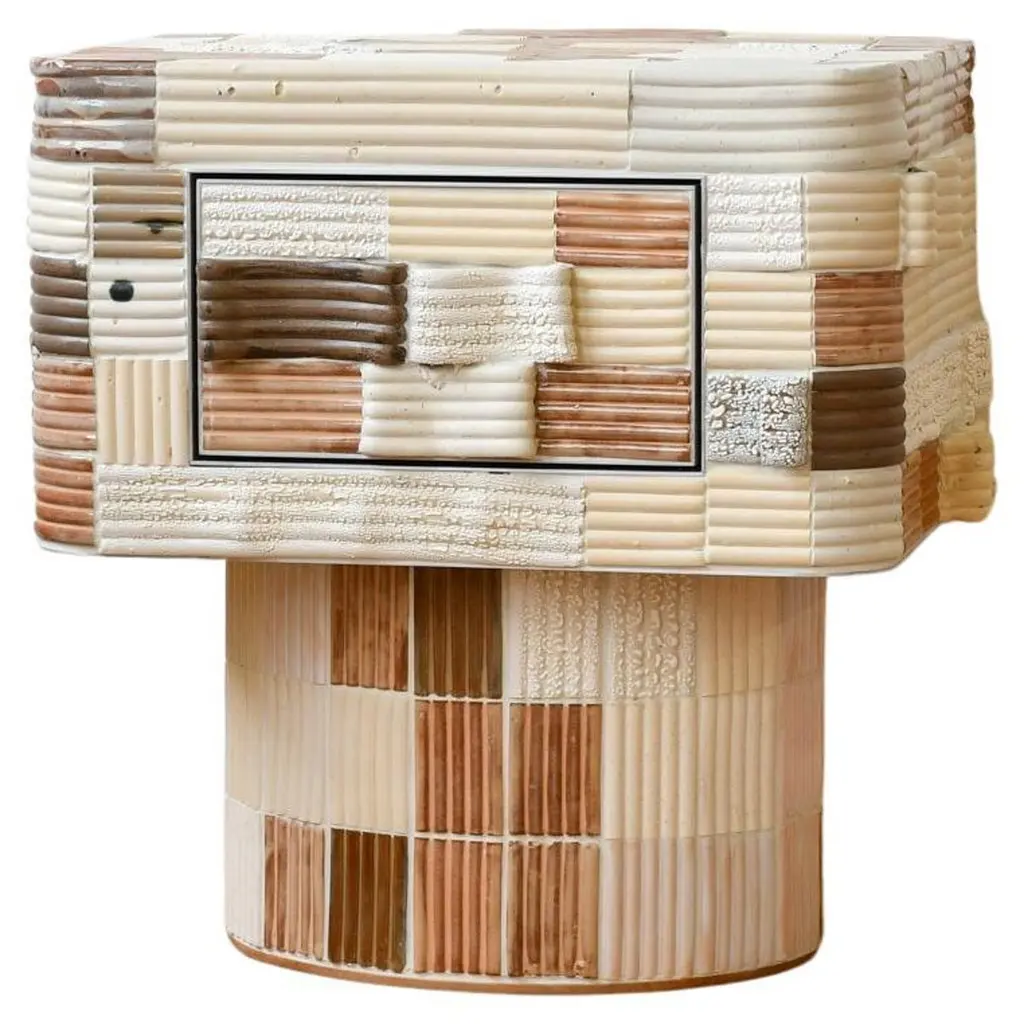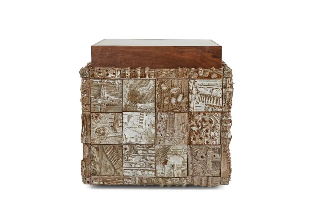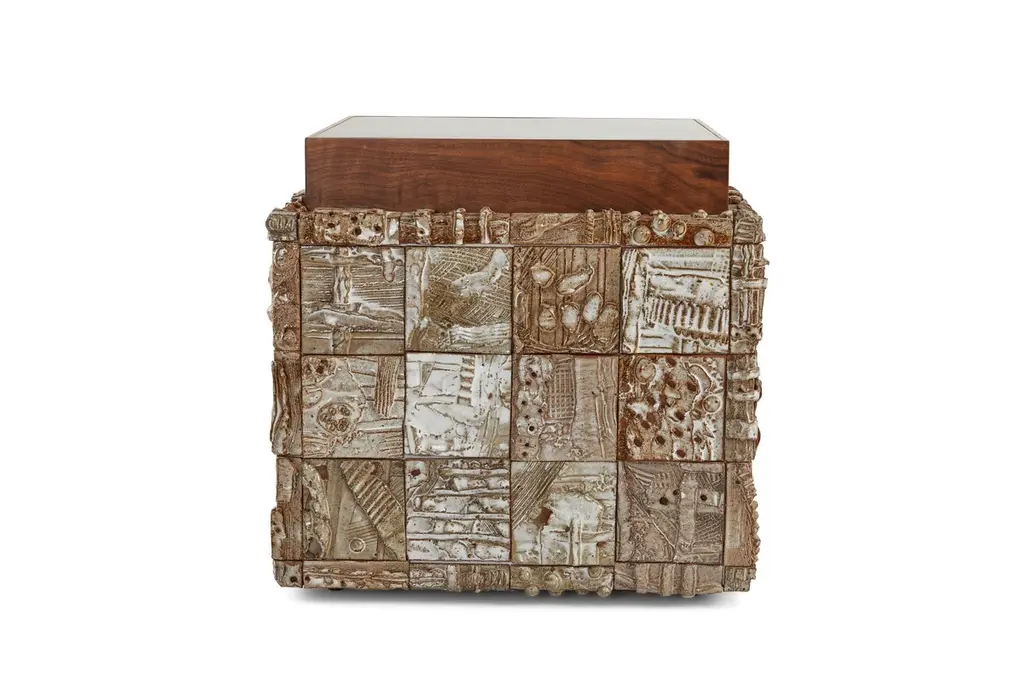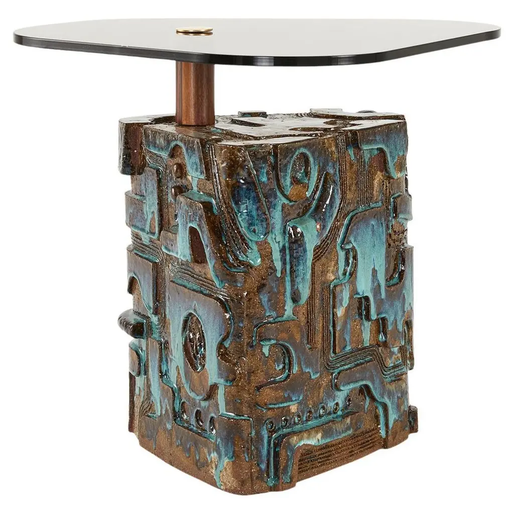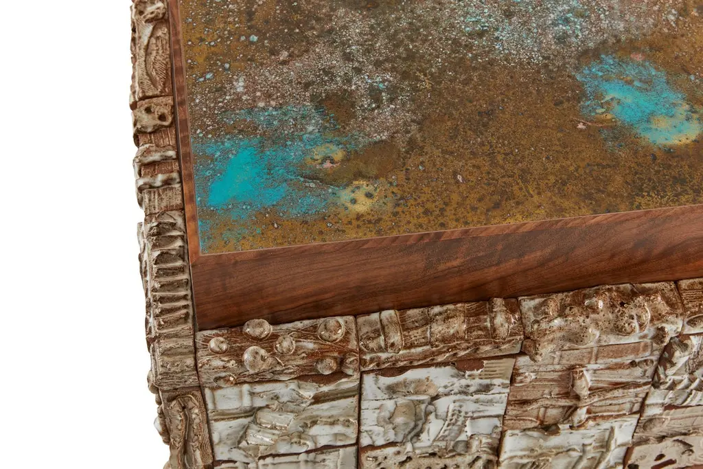 Stellar cube side table by Egg DesignsDimensions: 56 L x 56 D x 50 H cm Materials: Walnut timber, handmade Ceramic, Verdigris solid copperFounded by South Africans and life partners, Greg and Roche Dry - Egg is a unique perspective in contemporary furniture inspired with a soul that’s deeply rooted in the African continent.We believe Egg has a distinctive African design dialect.We dream that our products will not only be judged by their function and form, but by the beauty of their eternal narrative.In everything we create we must answer the question, “Is it Egg enough?”Egg, is a spirited blend of heritage, passion, meaning and African soul. It stands the test of time. It’s curiosities that make you smile. It’s love and truth that can be seen from afar and equally found in the minutest details. That’s why every piece we craft comes from Africa and carries within it a part of the African soul. We’re a melting pot of tribal craft, African heritage and modern luxurious expression.“If it’s not Egg enough, it’s not worth doing!”We have widened the prism of contemporary African design in Modern Antiques, high-end Furniture, lighting and custom interiors inspired by an African provenance for a modern, international customer.