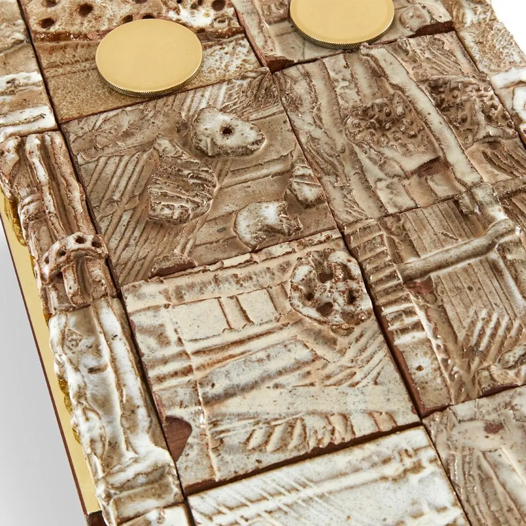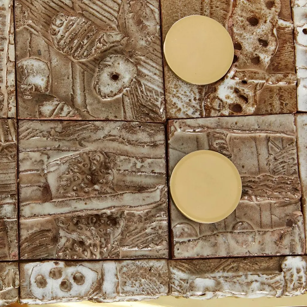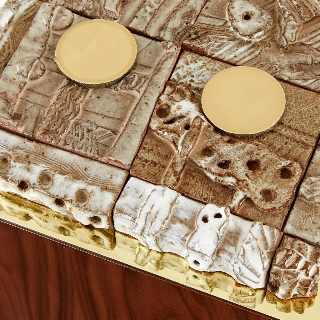 The Stellar Float bespoke side table is designed by Egg Designs and manufactured in South Africa. This side table is part of the Stellar collection which consists of a sofa, lounge and dining chair with side tables and lamps to match. The Stellar range has a 70's aesthetic with a strong modern interpretation. Each ceramic tile, corner & edge is individually hand moulded and glazed by a group of ceramic crafters, this ensures that each tile is unique which means that every side table is individual, no two will look the same. The ceramic tiles are selectively & individually applied to ensure variances in colour, size and thicknesses, these variances create an uneven surface and are the signature of the Stellar range. This ceramic side table while expertly manufactured has a handmade quality.The ceramic tile cladding to the Stellar Float side table is offset with Walnut timber with polished brass details. The Stellar side table would be equally at home in either a Mid-Century Modern, classical, minimal or modern interior.