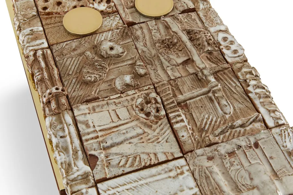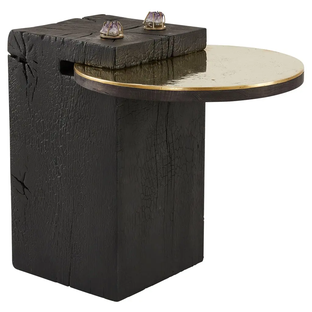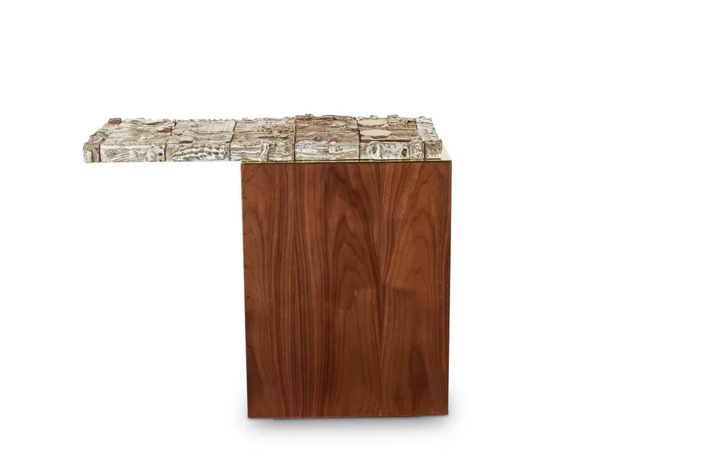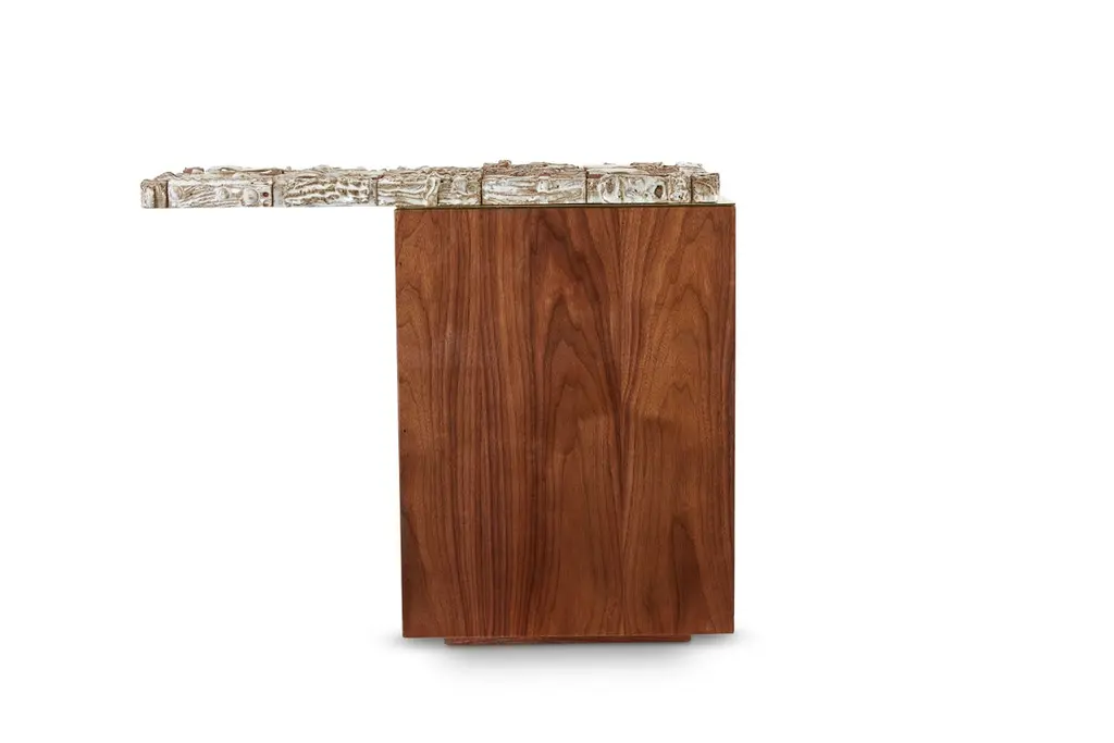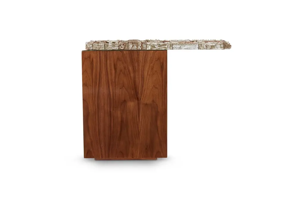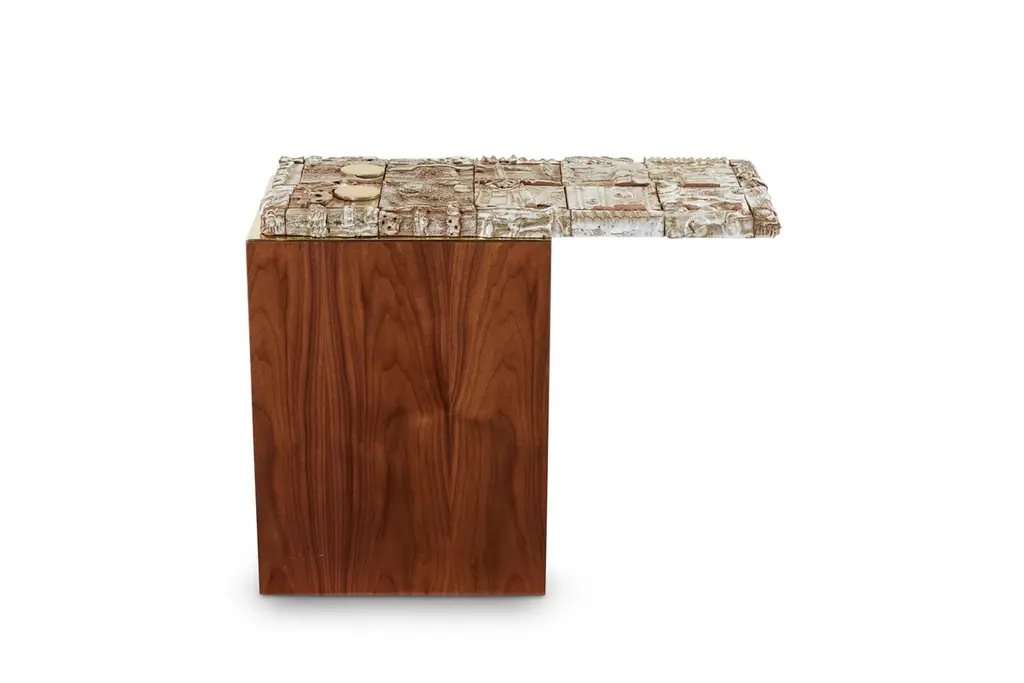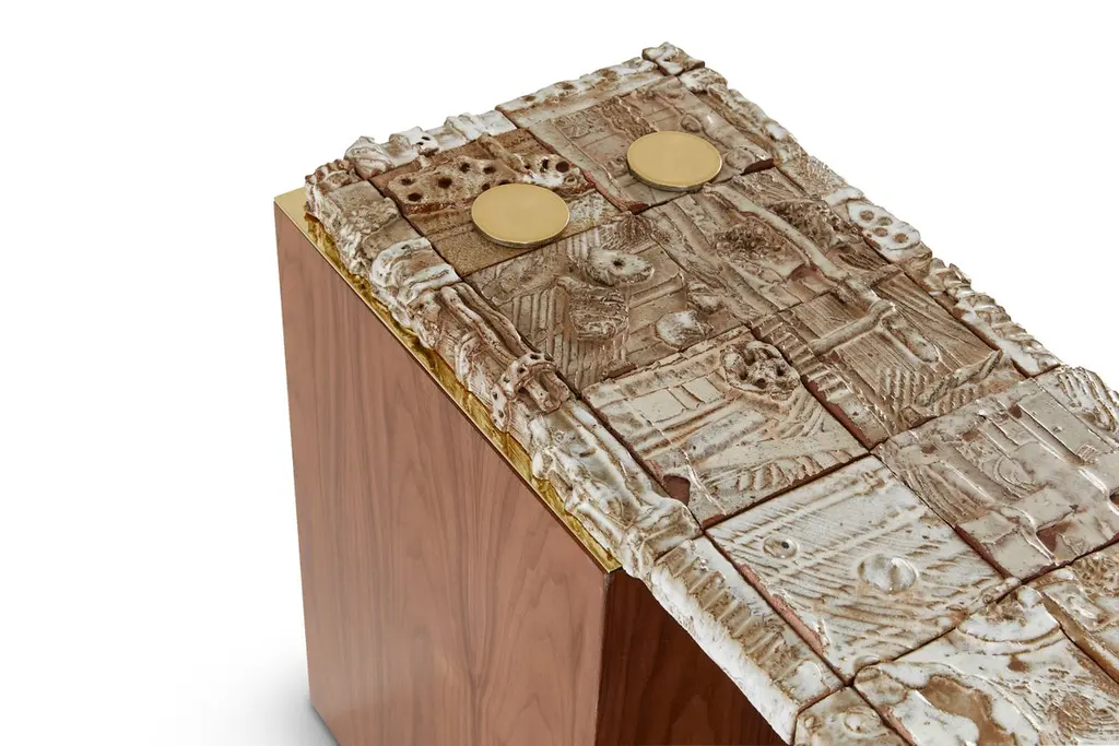 Stellar Float side table by Egg DesignsDimensions: 75 L X 38.5 D X 56 H cm Materials: Walnut Timber, Handmade Ceramic, Polished BrassFounded by South Africans and life partners, Greg and Roche Dry - Egg is a unique perspective in contemporary furniture inspired with a soul that’s deeply rooted in the African continent.We believe Egg has a distinctive African design dialect.We dream that our products will not only be judged by their function and form, but by the beauty of their eternal narrative.In everything we create we must answer the question, “Is it Egg enough?”Egg, is a spirited blend of heritage, passion, meaning and African soul. It stands the test of time. It’s curiosities that make you smile. It’s love and truth that can be seen from afar and equally found in the minutest details. That’s why every piece we craft comes from Africa and carries within it a part of the African soul. We’re a melting pot of tribal craft, African heritage and modern luxurious expression.“If it’s not Egg enough, it’s not worth doing!”We have widened the prism of contemporary African design in Modern Antiques, high-end Furniture, lighting and custom interiors inspired by an African provenance for a modern, international customer.