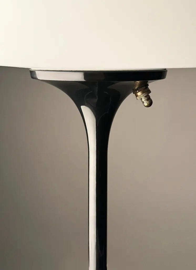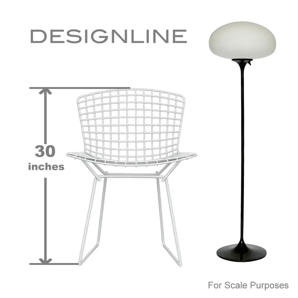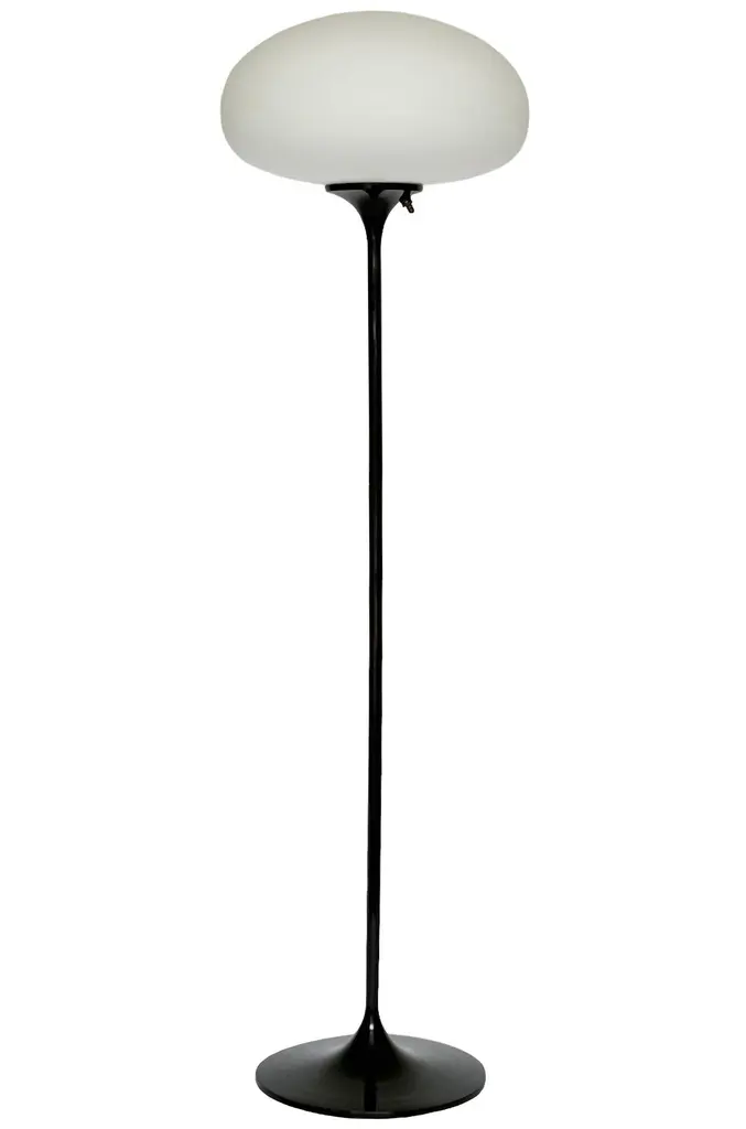 A sleek low profile floor made by Design-Line. It features a cast aluminum main base in a sculptural tulip form. The base is finished in a rich black gloss. The frosted glass lamp is hand blown and gives off a soft warm filtered light. It works with one standard bulb up to 100 watts and plugs into a standard US outlet. These retro lamps work with all mid-century modern furniture & decor. Such as classic vintage mcm, art deco, space age, post modern, retro kitsch and contemporary design. Imagine a pair of these lamps used as bedside lamps, on end tables in a living room, or a matching pair on top of a vintage credenza. These lamps will compliment modern furniture from iconic designers like Charles Eames, Eero Saarinen, Harry Bertoia, Paul McCobb, Adrian Pearsall, Verner Panton, Florence Knoll, Joe Columbo, Hans Wegner & Arne Jacobsen. Use a single lamp as an accent lamp on your favorite cabinet or buy one as a funky desk lamp. These are sure to go with modern furniture manufacturers from the past and present. Confidently mix these lamps that fit with brands like Herman Miller, Knoll, Fritz Hansen, Kartell, Artemide, Planner Group, Niels Moller, Maurice Villency, and Thayer Coggin. If you have any question, please don't hesitate to message us.