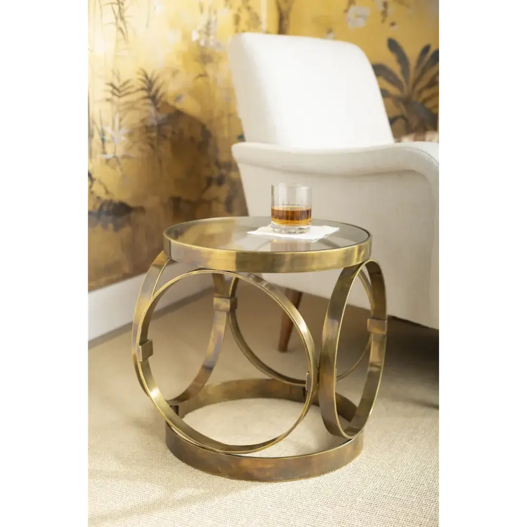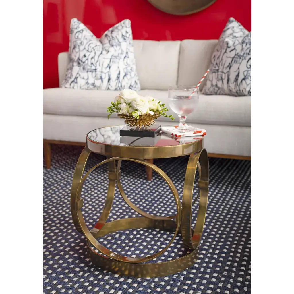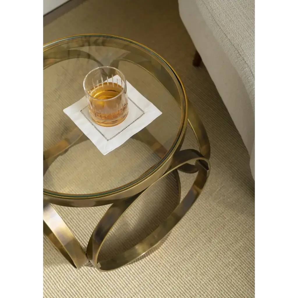 The Stephan Side Table is a playful take on a traditional piece which is usually made in bent cane or bamboo. We've recreated the piece in polished nickel and in brass with an antique finish which imparts a more contemporary and a much more glamorous air. This little decorative table is super helpful in many scenarios. It doesn't crowd: it's airy and open with a glass top. Place two in front of a sofa, flanking a loveseat, or nestled next to a cozy chair in a study.