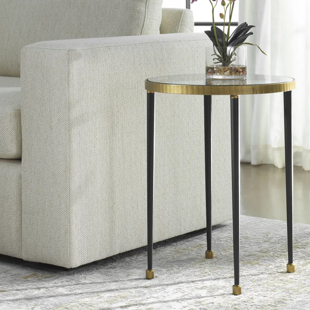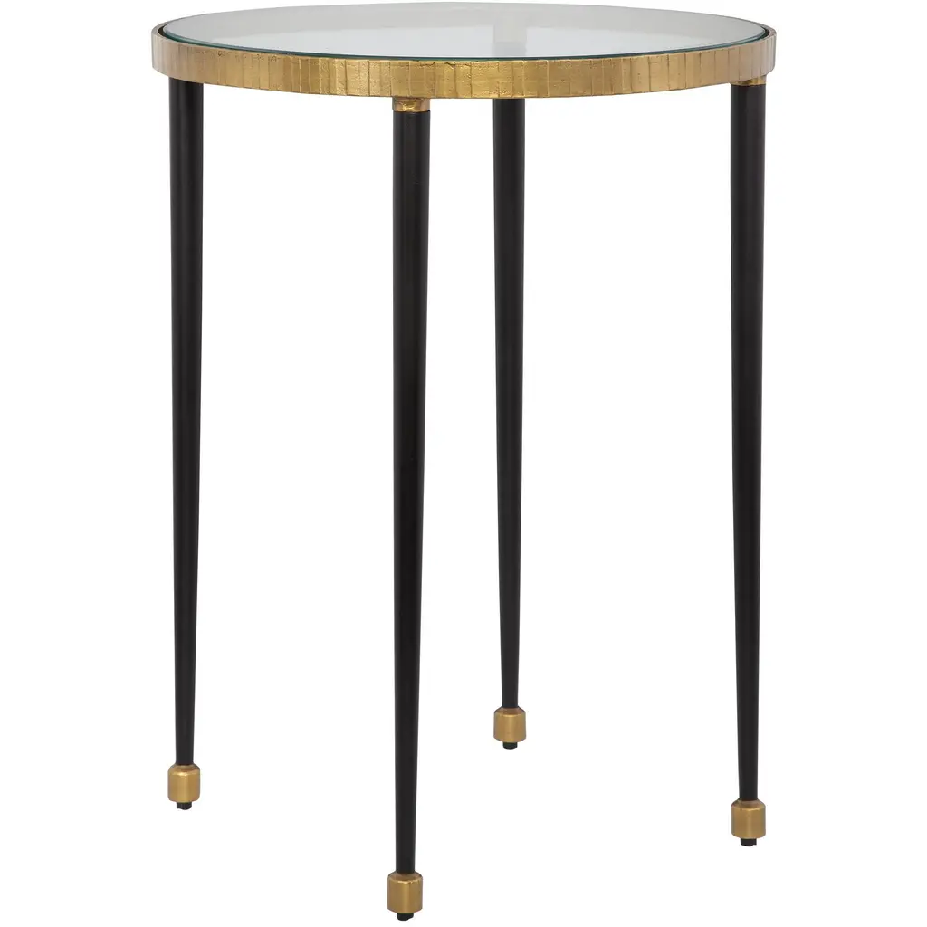 The Stiletto Side Table Offers Stylish Accent To Your Sofa Or Chair. Constructed From Iron Featuring A Texture Rimmed Top In Antique Gold With Tapered Black Legs With Petite Gold Accents. Top Is Clear Glass.