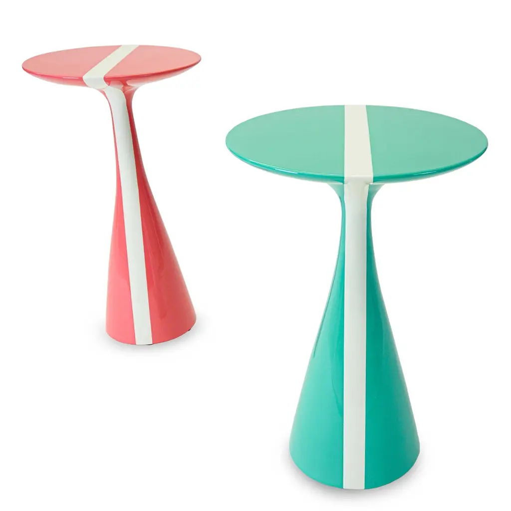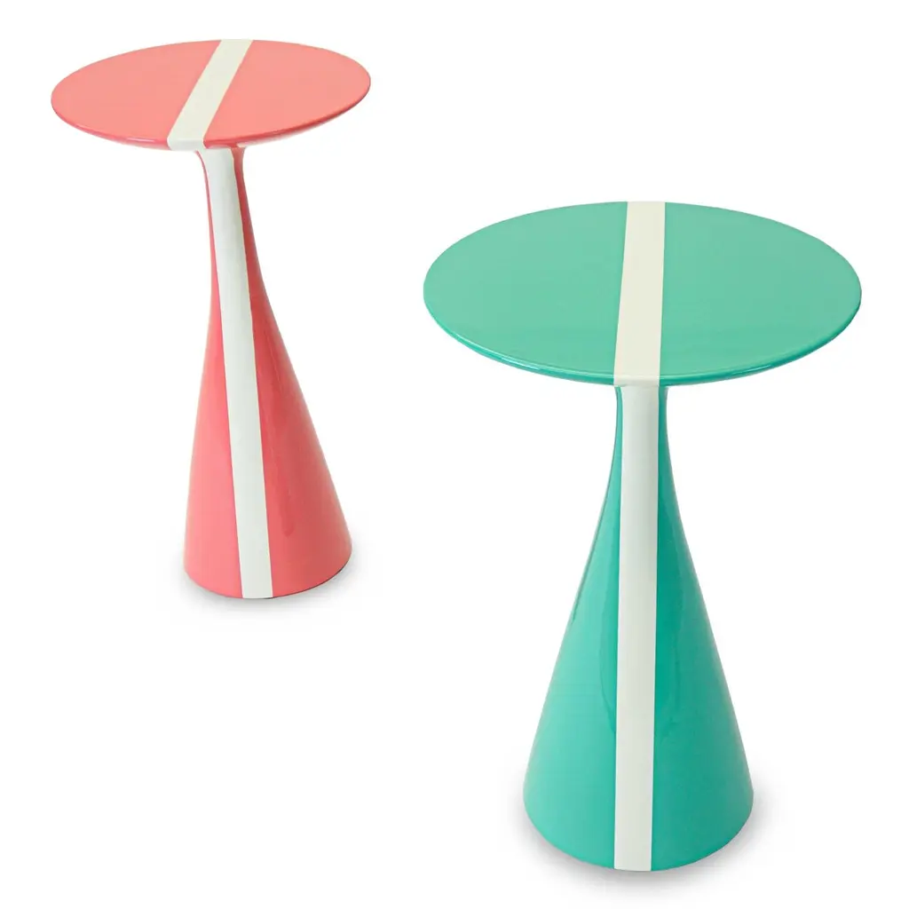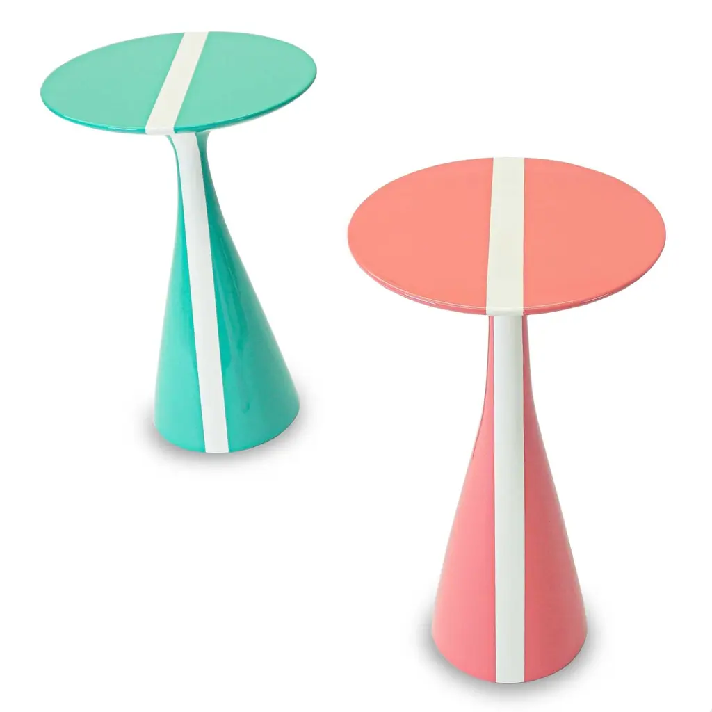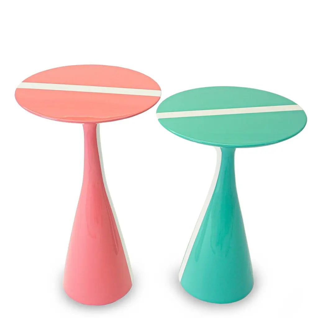 Our Stiletto table design with a fresh white stripe running across the top is made of solid hard maple and lacquered in high gloss finish. Shown here in a rich pink grapefruit and mint colors, but can be made in custom sizes and any paint color. As about current availability for pieces as shown. Measurements:Turquoise Overall: 15.25”Dia. x 23”HPink Overall: 13.5”Dia. x 24”HPrice As Shown: $4,050 as a pairCustomization may change the price.How We Work:Made to order by Connecticut-based furniture design and manufacturing company The Tailored Home. Submit your customization desires by 1stdibs messenger for a quote. After orders are placed our workshop manager creates a visual work order for your approval for quality assurance.Customization Options:Dimensions can be customized. Ask for details.The fabric shown may come in more colors. We also carry thousands of other materials and can send you samples and fabric pricing upon request. We accept your fabric for a COM fee of 5% of the cost of the piece. Welting, piping, tape, or trim can be added. Different species are available for pieces with exposed wood and can be painted & lacquered in any Benjamin Moore color (for an additional charge) or stained in one of our stain options. Custom color matches cost $75 per sample.We accept inspiration photos of pieces you like.2021 - Made to OrderThis piece can be made as is or custom-made with the customer’s choice of materials and size adjustments.9-10 weeks