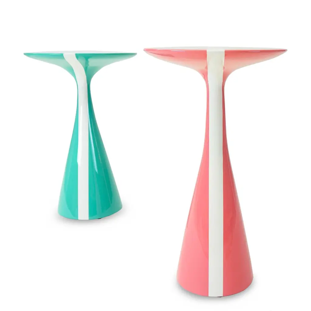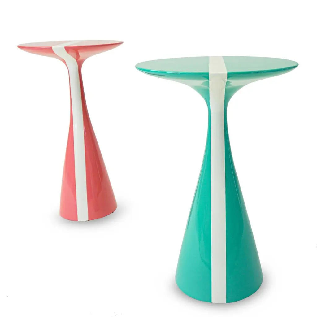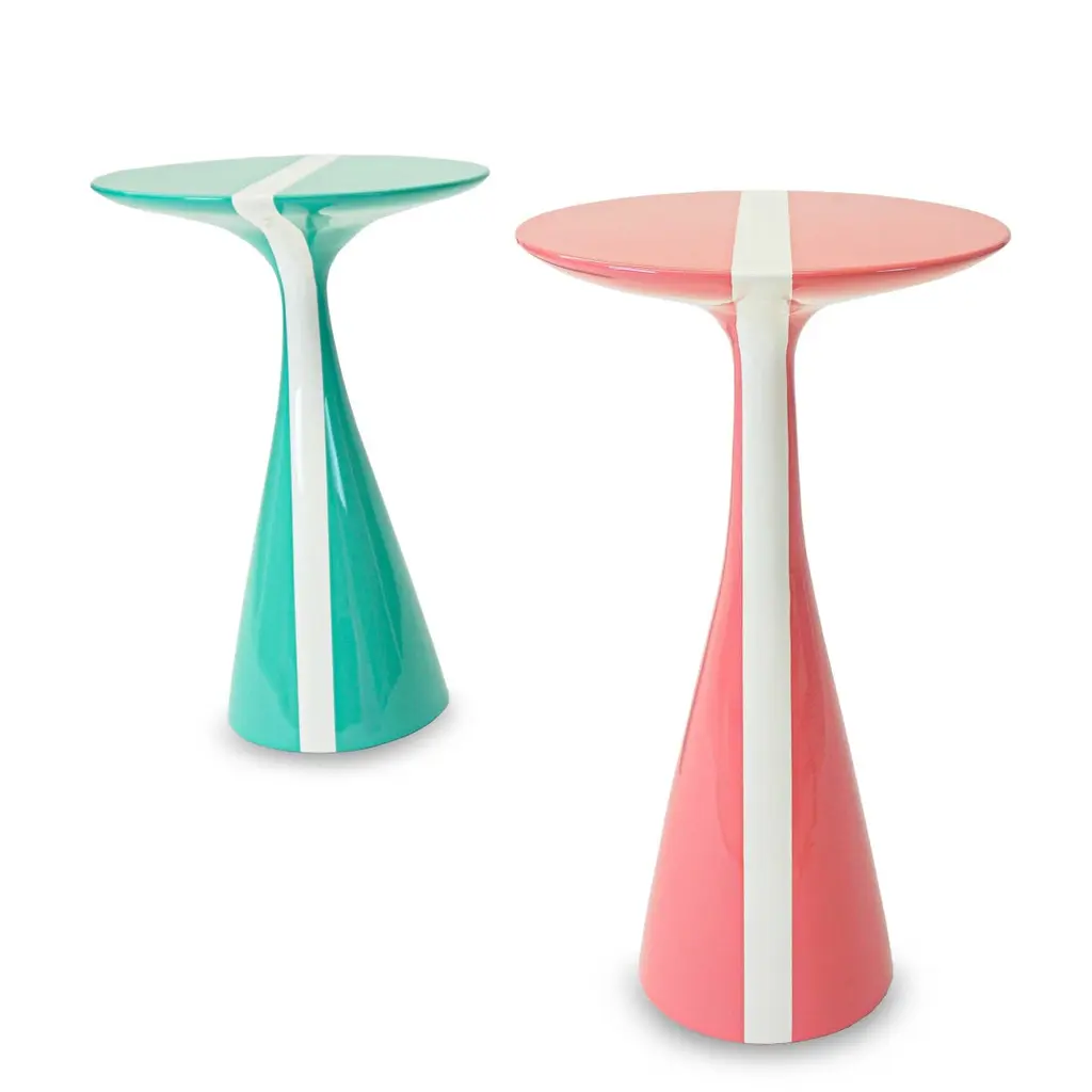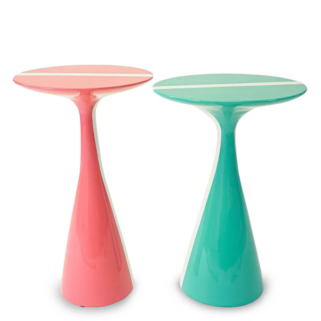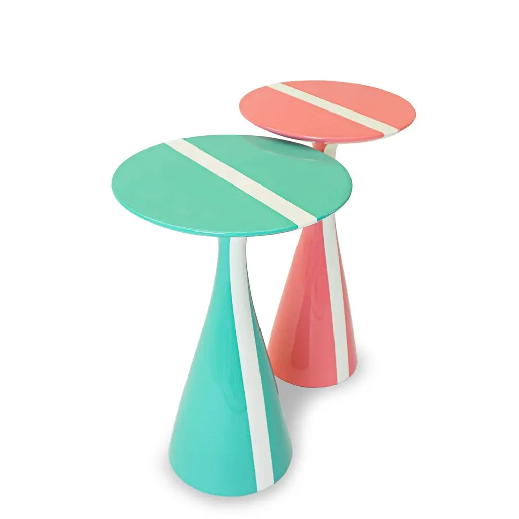 Our Stiletto table design with a fresh white stripe running across the top is made of solid hard maple and lacquered in high gloss finish. Shown here in a rich pink grapefruit and mint colors, but can be made in custom sizes and any paint color. As about current availability for pieces as shown. Measurements:Turquoise Overall: 15.25”Dia. x 23”HPink Overall: 13.5”Dia. x 24”HPrice As Shown: $4,050 as a pairCustomization may change the price.How We Work:Made to order by Connecticut-based furniture design and manufacturing company The Tailored Home. Submit your customization desires by 1stdibs messenger for a quote. After orders are placed our workshop manager creates a visual work order for your approval for quality assurance.Customization Options:Dimensions can be customized. Ask for details.The fabric shown may come in more colors. We also carry thousands of other materials and can send you samples and fabric pricing upon request. We accept your fabric for a COM fee of 5% of the cost of the piece. Welting, piping, tape, or trim can be added. Different species are available for pieces with exposed wood and can be painted & lacquered in any Benjamin Moore color (for an additional charge) or stained in one of our stain options. Custom color matches cost $75 per sample.We accept inspiration photos of pieces you like.2021 - Made to OrderThis piece can be made as is or custom-made with the customer’s choice of materials and size adjustments.9-10 weeks