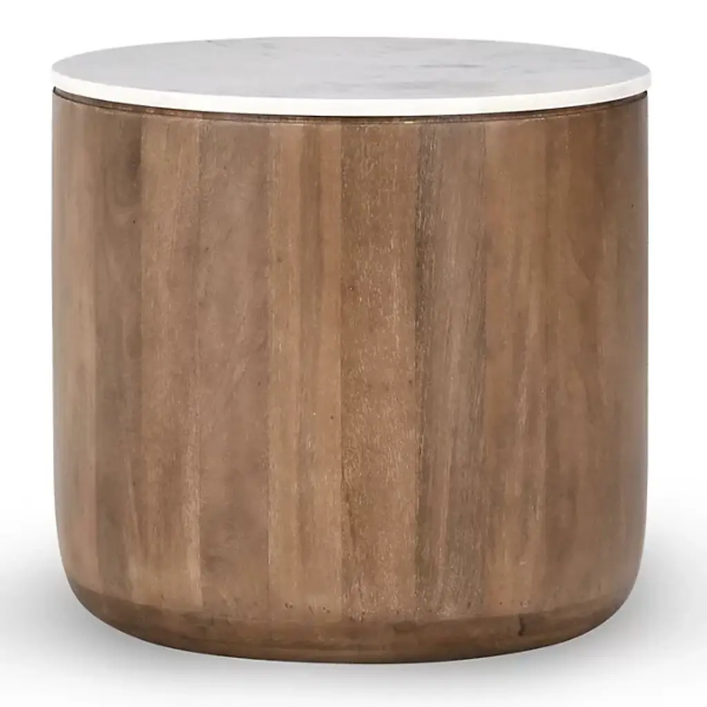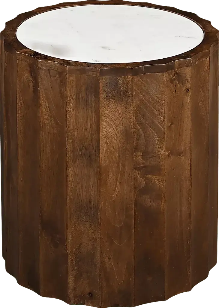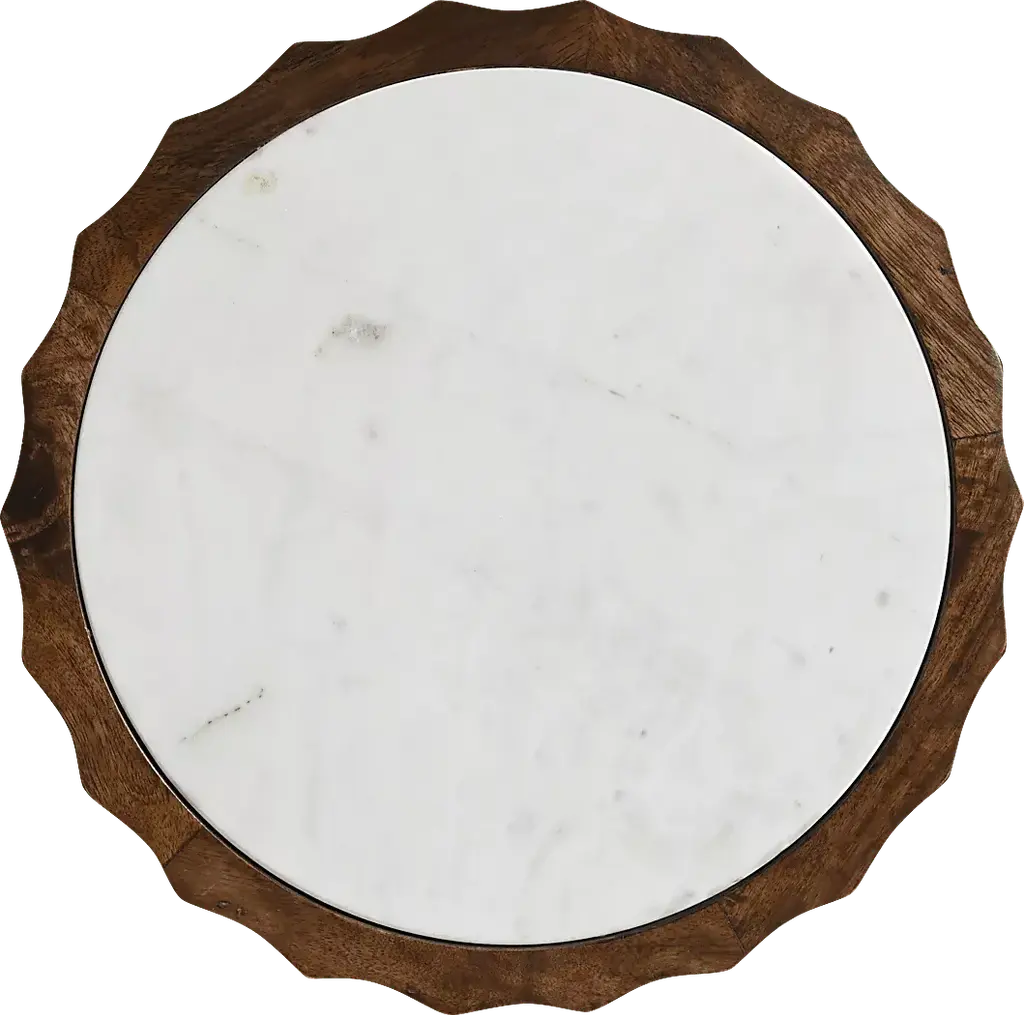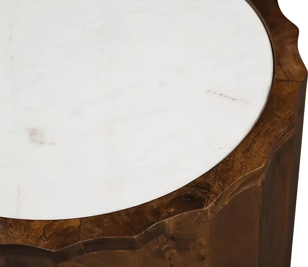 Bring a touch of elegance to your living space with this stunning Stinsonville side table. The base boasts solid Mango wood construction in a warm brown finish, featuring linear curved beveling that is sure to catch the eye. The round white marble top, with natural gray veining, is encased within the beautiful frame, ensuring that each piece is unique. For a complete and stylish look, pair it with the matching cocktail table. Customer assembly is required.
