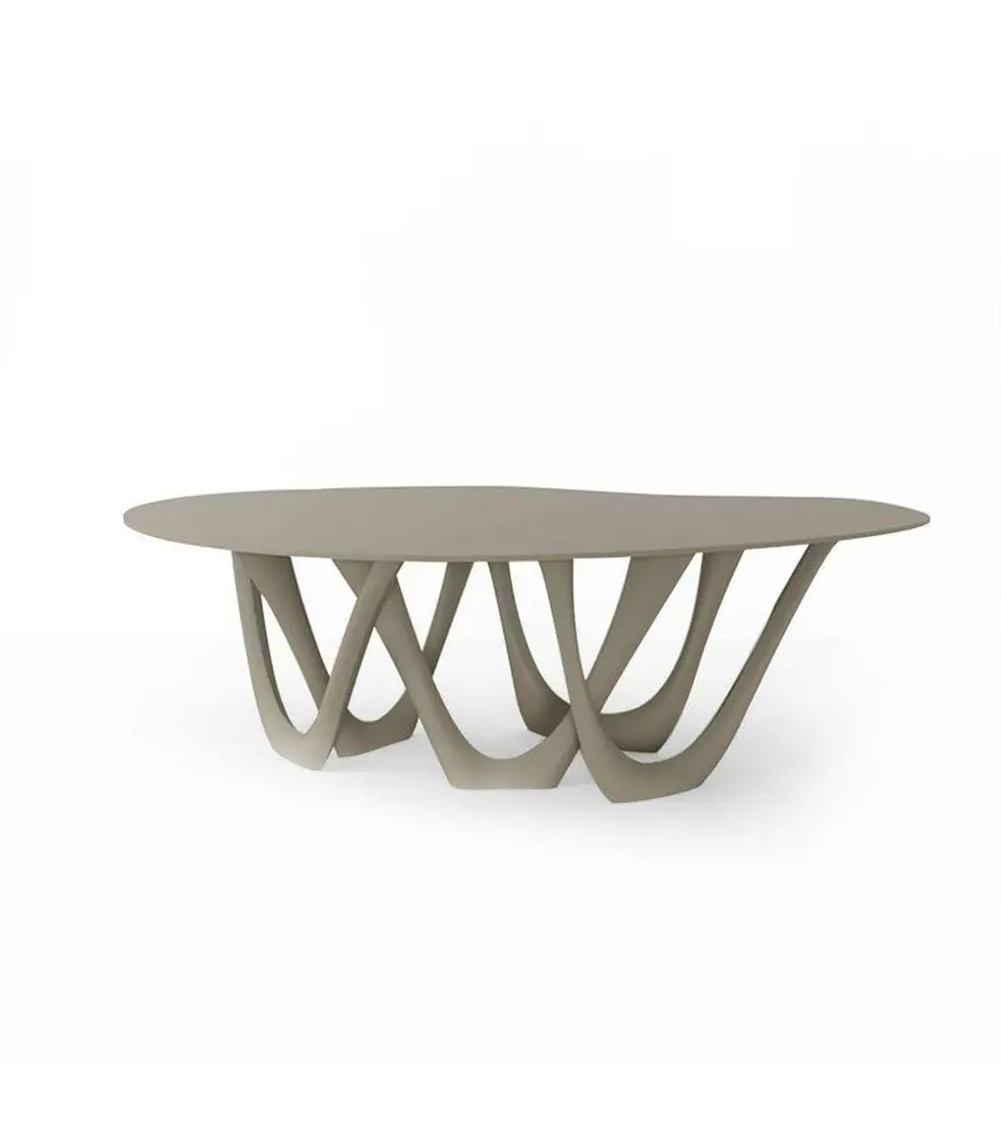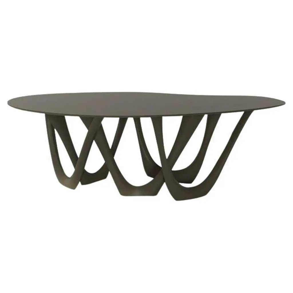 Stone grey steel G-Table by ZietaDimensions: D 110 x W 220 x H 75 cm Material: Carbon steel. Finish: Powder-Coated.Available in colors: Beige, Black/Brown, Black glossy, Blue-grey, Concrete grey, Graphite, Gray Beige, Gray-Blue, Moss Grey, Olive Green, Pale green, Resende, Stone gray, Tele gray, Umbra Grey, White Glossy, White Matt, Window grey or Yellow Olive. Available in finishes: Concrete, Stainless Steel, Wood top, and Aluminum. Also available in the side table version. G-Tables is a series of bionically shaped objects that are customized for customers' needs. Each table is “tailor-made” and created together with the user who can choose from a variety of materials, finishes and also decide about parameters like the number of people sitting at the table. The shape of the table, leg construction, and legs layout is optimized by the algorithm applied by designers to fit the distant space and meet the most demanding interiors.About Zieta: Zietas main goal is to deliver uniqueness and customization in design and construction while keeping the production, transport, and warehousing innovatively efficient.This is how they imagine the future world: Light, durable structures of customized applications produced on demand out of one-of-a-kind parts, yet efficiently.They use a computer-controlled production process. Customized pattern, customized form, customized function, one-of-a-kind product, and outstanding precision are what they deliver.You will find all of this philosophy reflected in the products. The research, they discover new possibilities, they play with forms and they deliver a beautiful, innovative, surprising outcome to people who love the design and who care about design development.They believe their work is a valuable contribution to the world of design not only by the unique beauty of the forms but most of all by opening ultra-innovative opportunities of forming and new paths for the world of the future. __