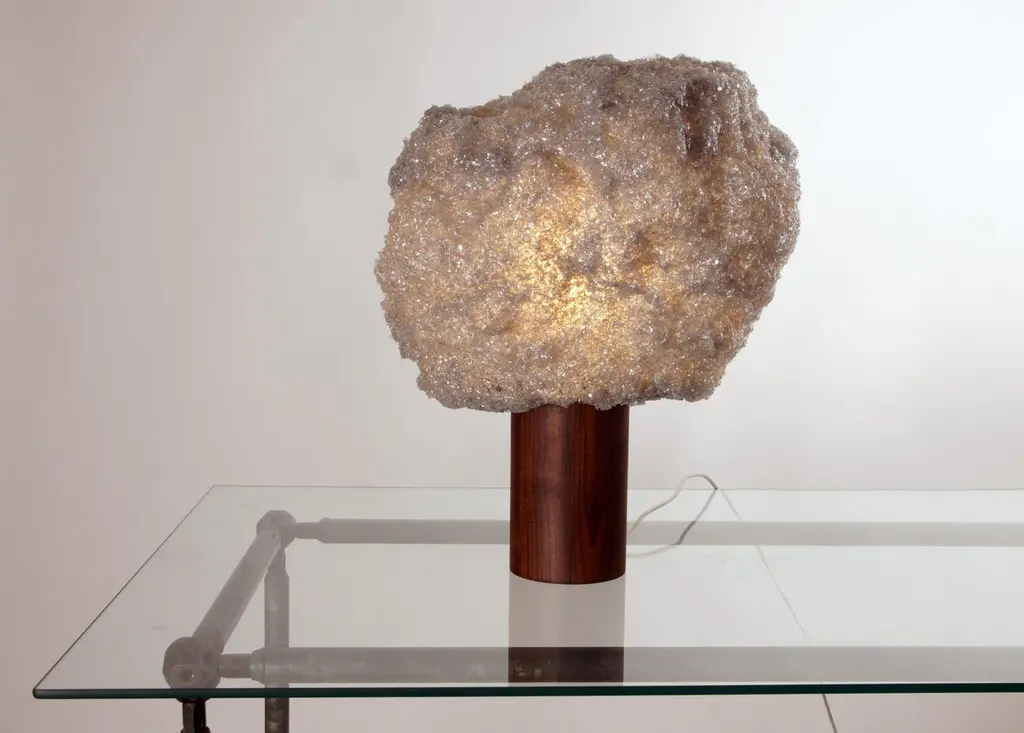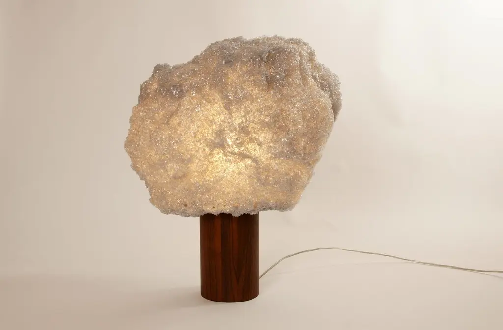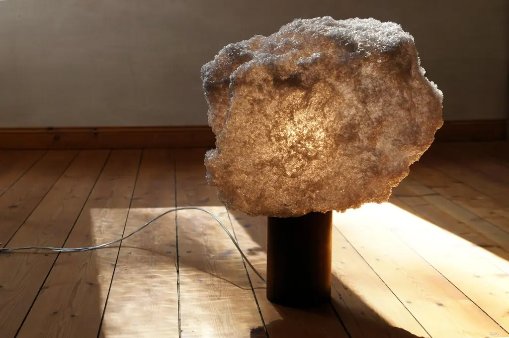 Pressed wood side table by Johannes HemannMaterial: polycarbonate, walnutDimensions: Ø 42 x H 52 cmThe Storm Series is by its concept the purest example of a process-design, where the designer seeks to set creative parameters to allow an object to shape itself, without any further direct involvement. The aim of this project is to create forms through storm winds. Johannes Hemann creates storm boxes, in which he releases storms from high pressure air. The storm is the base of the project: ‘the silence before the storm’. The material lies on the bottom of the box – ‘standstill’ – the air comes in, the storm begins and the energy is transferred from the wind to the material. ‘The wind stops’ - the form has been shaped and the silence after the storm sets in. The storm energy is then visible in the shape. Each piece is unique, as each generated storm finds different expressions.All our lamps can be wired according to each country. If sold to the USA it will be wired for the USA for instance.