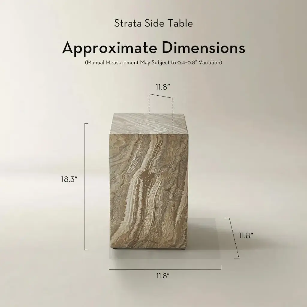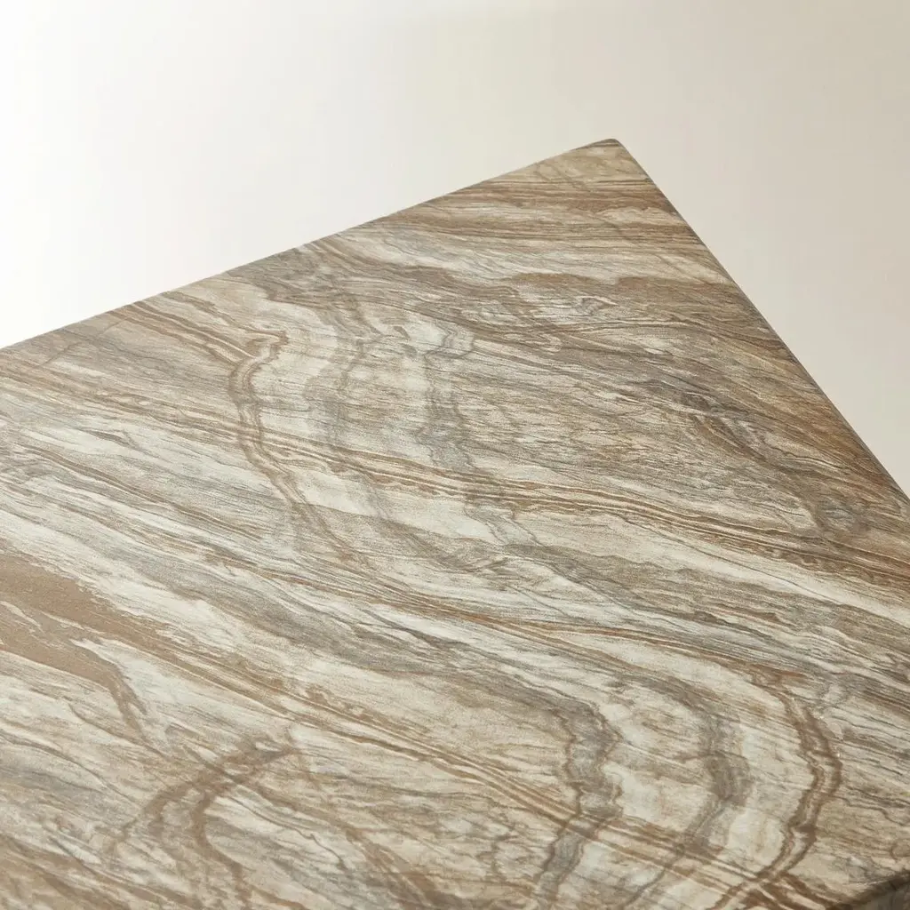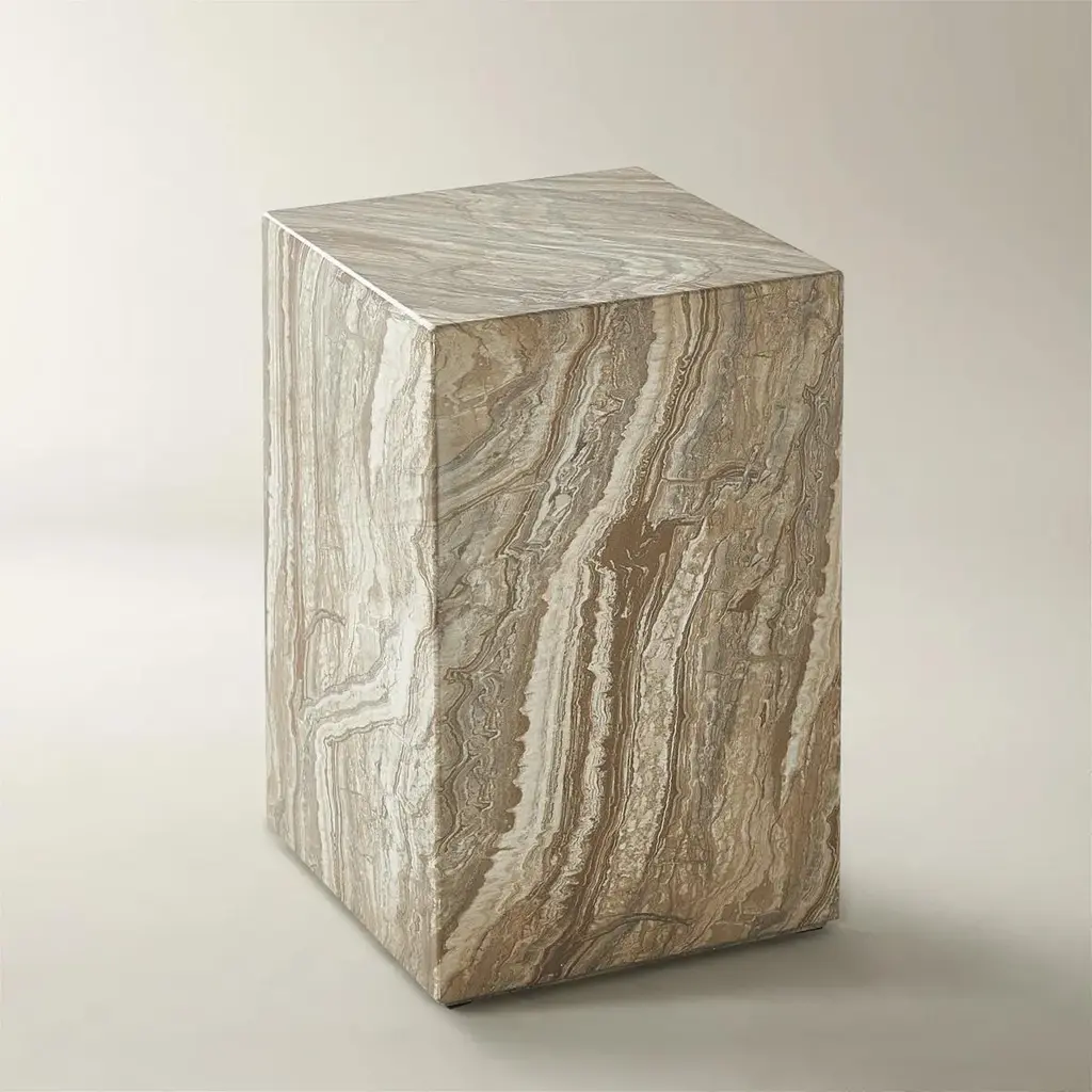 The Strata Side Table in brown marble brings grounded elegance to modern living. Its cuboid silhouette is precision-cast from fiber concrete and wrapped in hyper-realistic brown marble veining through seamless water transfer printing. The result is a table that looks like solid stone but offers a lightweight, resilient alternative. Perfect for indoor or outdoor use, this brown marble accent table is sealed to protect against moisture, heat, and everyday wear. The sculptural shape and warm, natural pattern make it a versatile companion beside sofas, beds, or outdoor lounge seating—proof that form and function can coexist beautifully.
