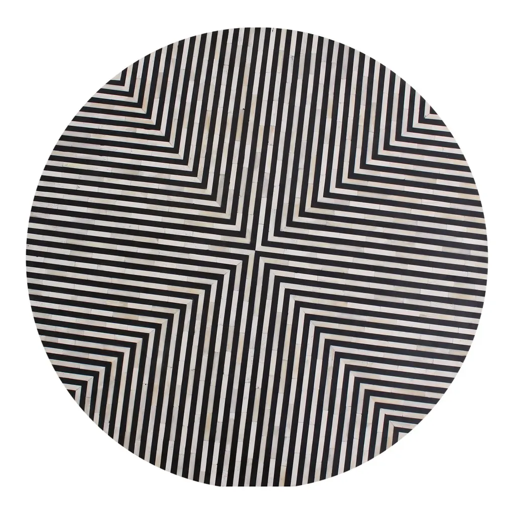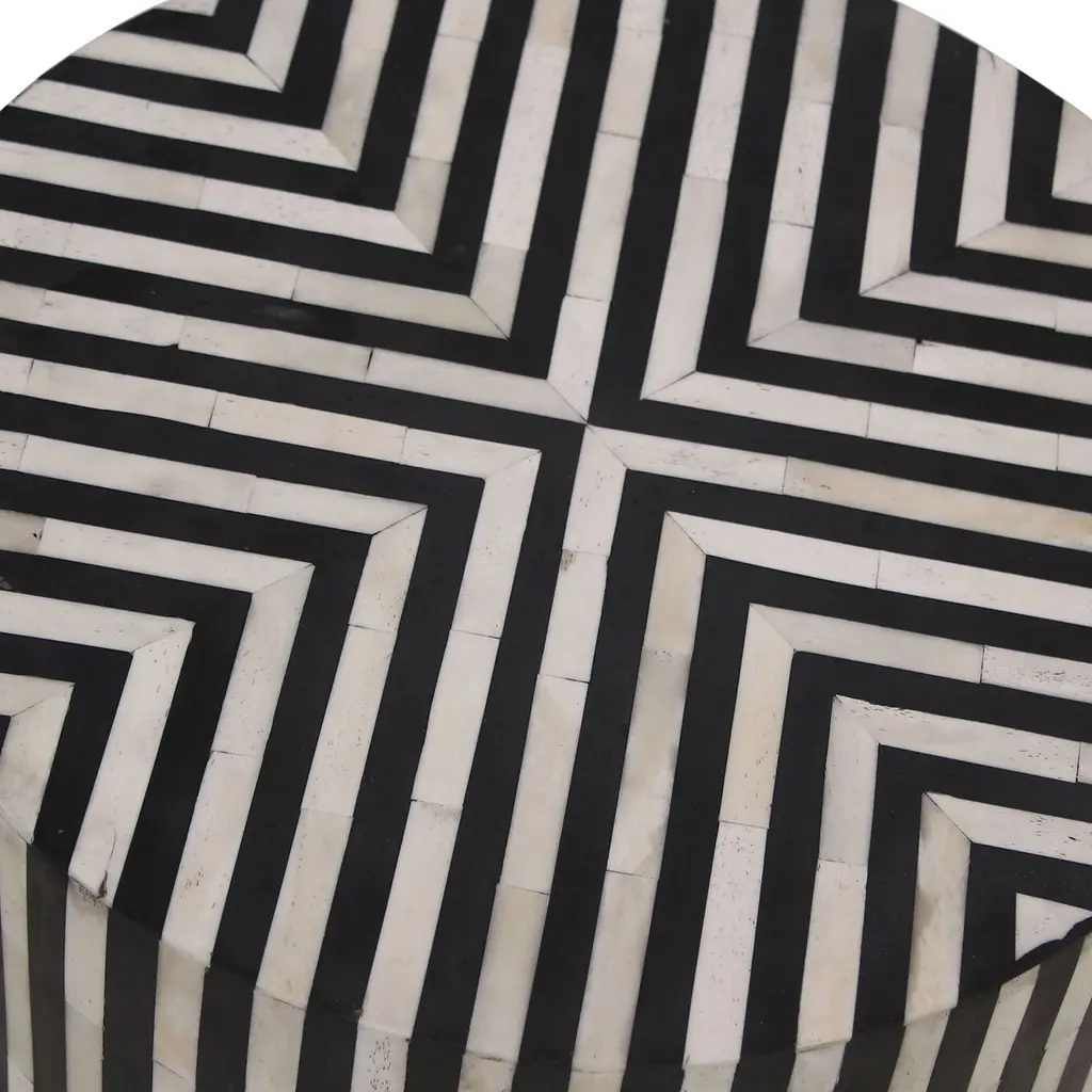 Bone veneer tiles form a bold, hypnotic print. Art deco inspired with black and white contrast. Can use as a side table or plant stand.