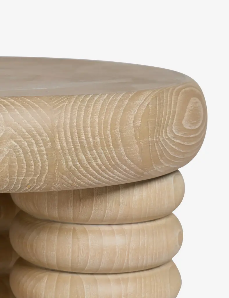 Add a chic touch to your favorite seat with our Sula side table. The round tabletop sits on chunky legs with stacked grooves for a soft yet modern look in the room. A light wash highlights this wood end table's beautiful natural grain.
