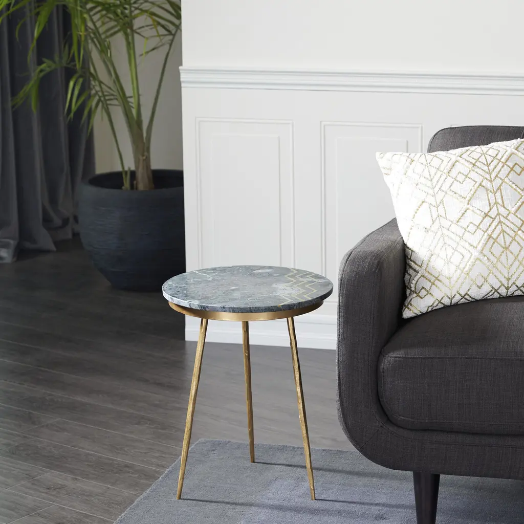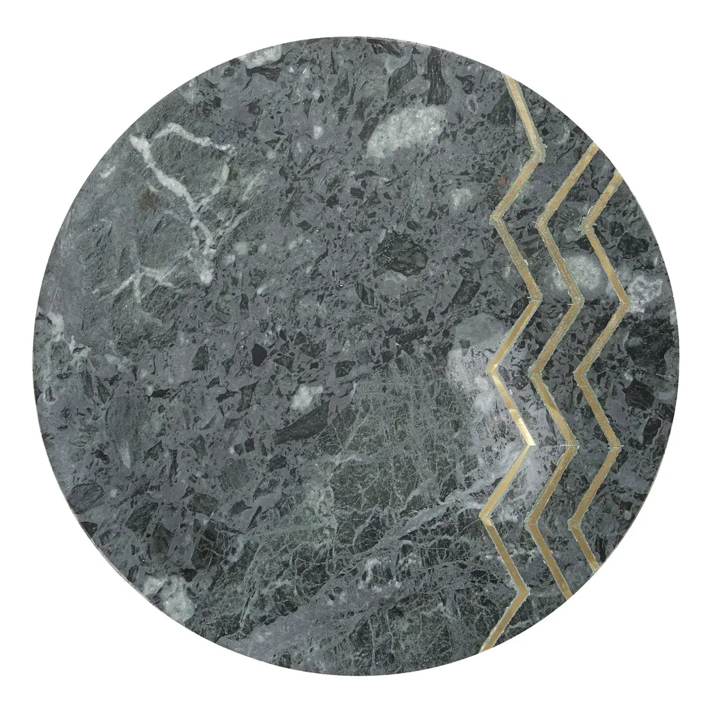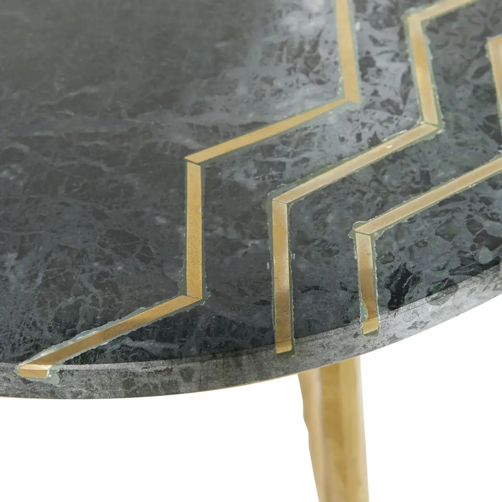 Ideal for elevating any room with a touch of quiet luxury, this green marble side table is inlaid with a gold-metal zigzag pattern and sits on gold tripod legs. Meticulously crafted from natural stone for textural appeal and organic warmth, its contrasting, sleek metal base gives it a contemporary look and enhances its modern design. Place it next to a sofa or armchair for a decorative accent and a place for a lamp, book, drink, and more.