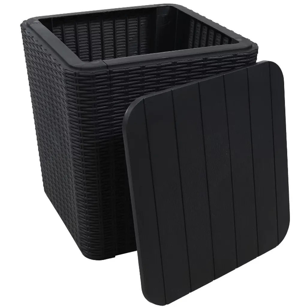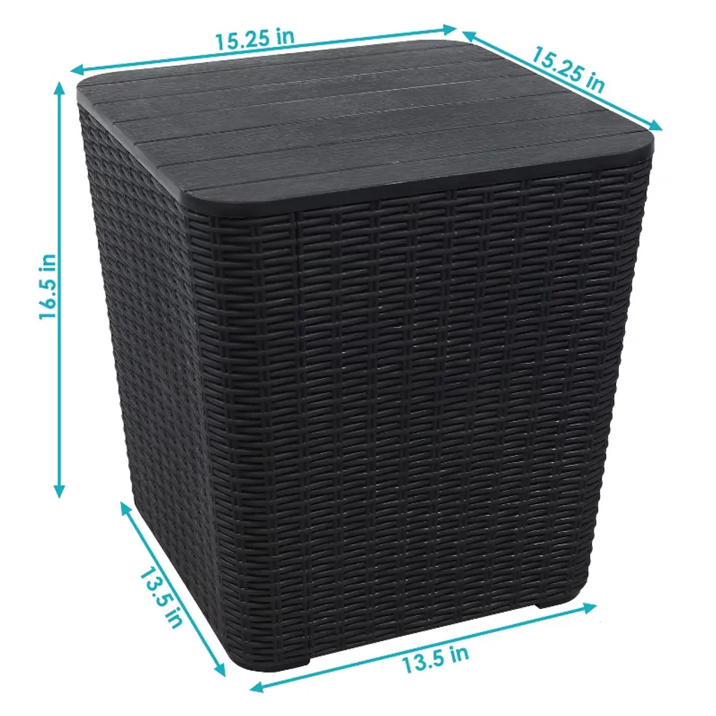 Make the most of any patio space with this multi-functional outdoor deck box and storage featuring a convenient tabletop. This deck box features a UV-protected and weather-resistant polypropylene and resin construction with a woodgrain look designed to complement any outdoor space while remaining durable against the outdoor elements. This storage box is the right height to use as a side table next to any patio or poolside furniture for easy storage of pool items and pillows while being able to set down your cool drink on top. The storage box is easy to assemble and designed to protect pillows, pool accessories, outdoor tools, decor and more! Keep all your favorite things safe this this storage box: stow away seasonal decorations,or other tools and items you want to have on hand with this woodgrain designed and weather-resistant storage box.• SIZED TO STORE PATIO OR GARAGE ITEMS: The small deck box measures 15.25" square x 16.5" H, weighs 6 lbs, and has a 110 lb weight capacity. Interior storage space is 13.5" square on the bottom, 15.25" square on the top and is 16" H. Use as both a storage box as well as a side table.• ADAPTABLE TO ANY SPACE: The outdoor side table with storage can be used as a deck storage box for patio cushions, by the pool, in the garden for storing gardening tools, or as a storage bin for indoor household items.• DESIGNED FOR LONG-LASTING STRENGTH: The small outdoor storage box features a UV-protected, weather-resistant, polypropylene and resin construction for durability in adverse weather conditions. The deck box's rattan look matches various aesthetics.• 11.5-GALLON STORAGE CAPACITY: This small indoor or outdoor storage table can be used to store and protect patio cushions, decorations, pillows, garage tools, and blankets. It is small enough for those seeking a compact storage solution for a limited space.• WORRY-FREE PURCHASING: Sunnydaze Decor backs its products with a 1-year manufacturer's warranty.