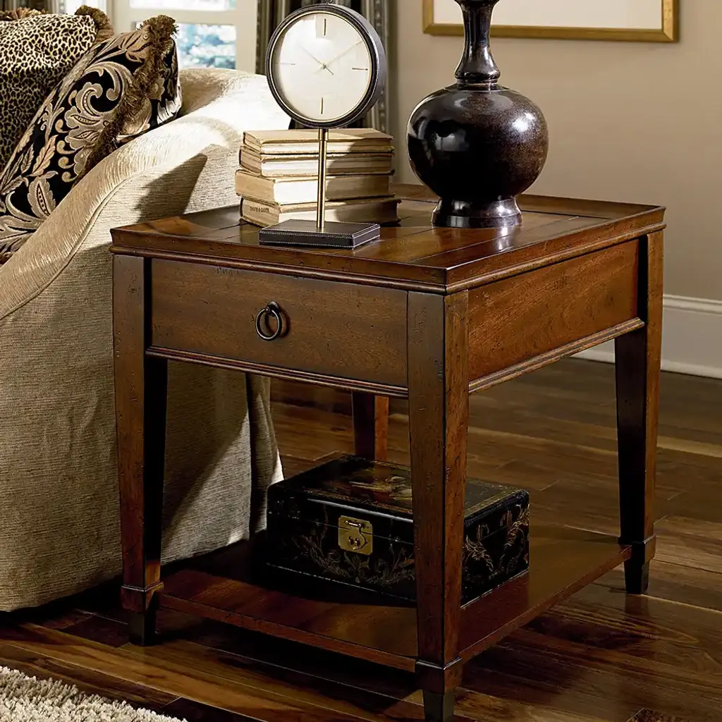 Enhance your living space with the Sunset Valley Rectangular Drawer End Table, a perfect blend of form and function. Expertly crafted from luxurious mahogany veneers and durable hardwoods, this elegant piece exudes timeless charm. Its standout feature is a convenient drawer, ideal for tucking away remote controls, coasters, or reading materials, keeping your surface clutter-free. Below, a spacious lower shelf provides the perfect spot to showcase treasured books, decorative items, or even a stylish storage basket. The table's rich wood tones and classic design effortlessly complement a variety of decor styles, from traditional to contemporary. Whether placed beside your favorite armchair or flanking a sofa, the Sunset Valley Rectangular Drawer End Table offers both practical storage and sophisticated style, making it an indispensable addition to any well-appointed room.