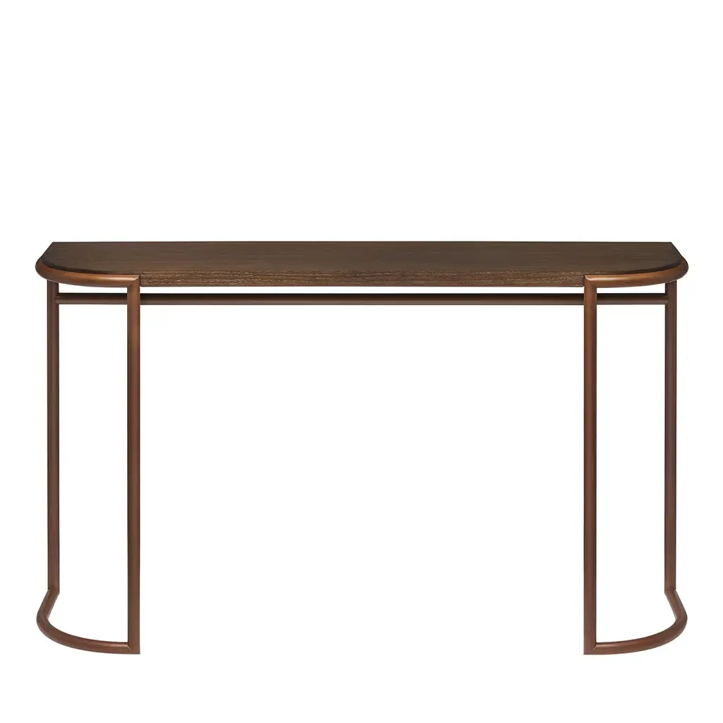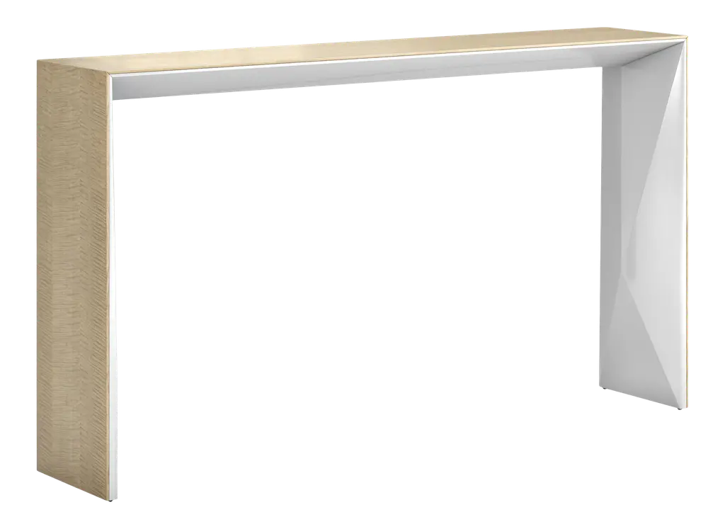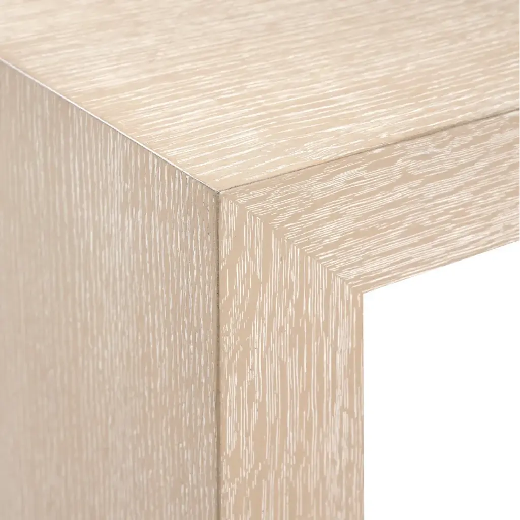 The Sutton Console is a unique architectural piece finished in Clear Lacquered Bleached Cerused Oak. The asymmetrical element of the design is a single rectangular leg of lightly finished bronze, a detail that highlights the minimal, modern aesthetic. The Sutton’s slim profile makes it an excellent option for a narrow hallway, a side table, or as a desk in a small space.