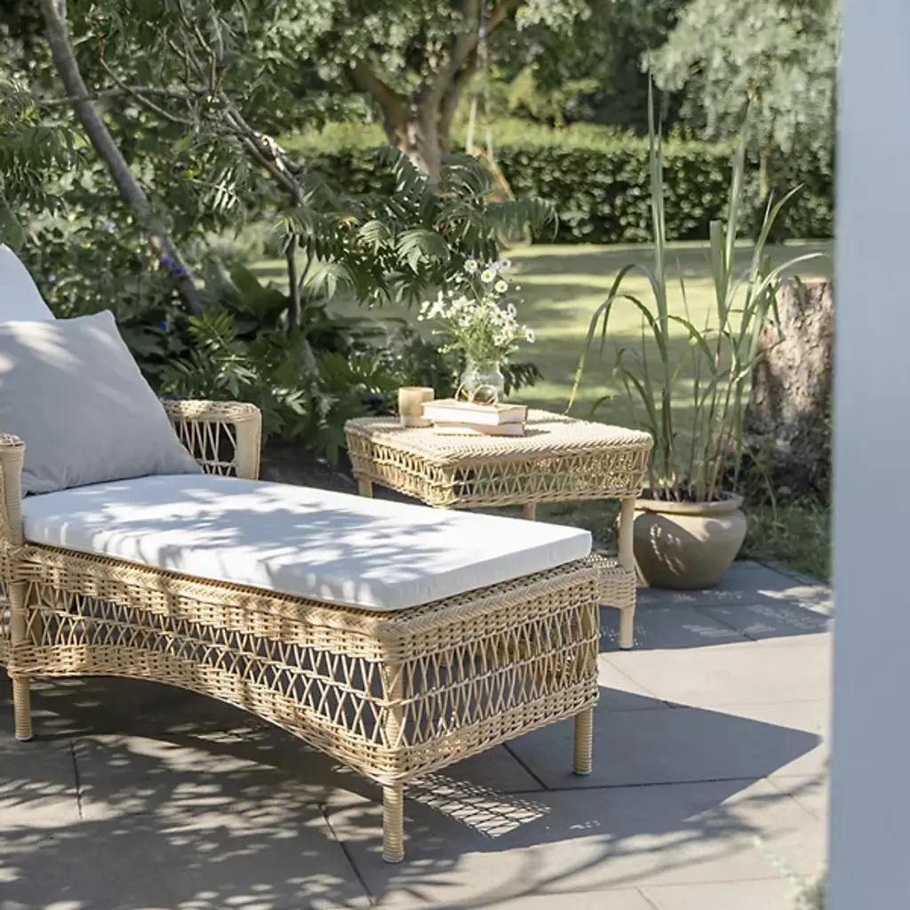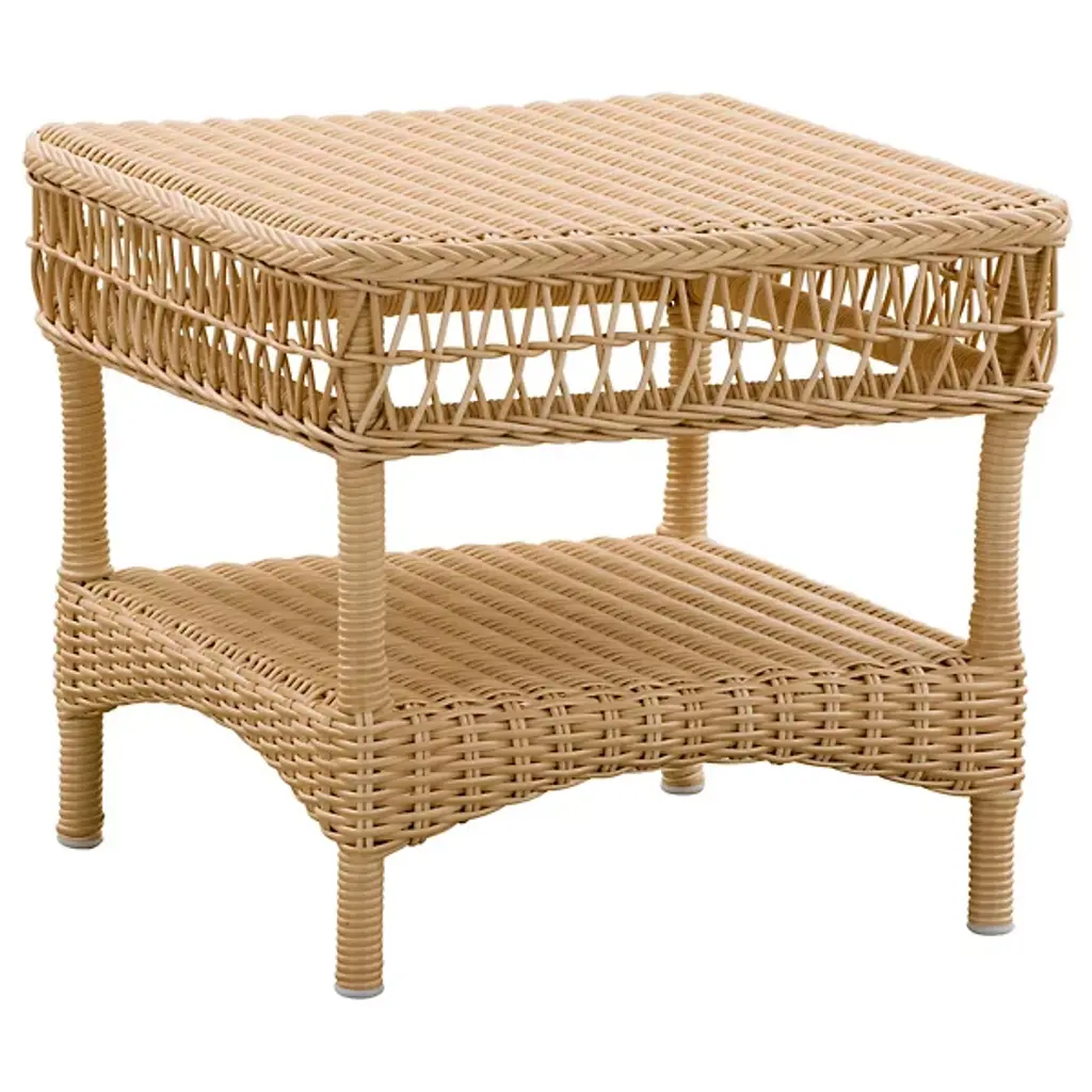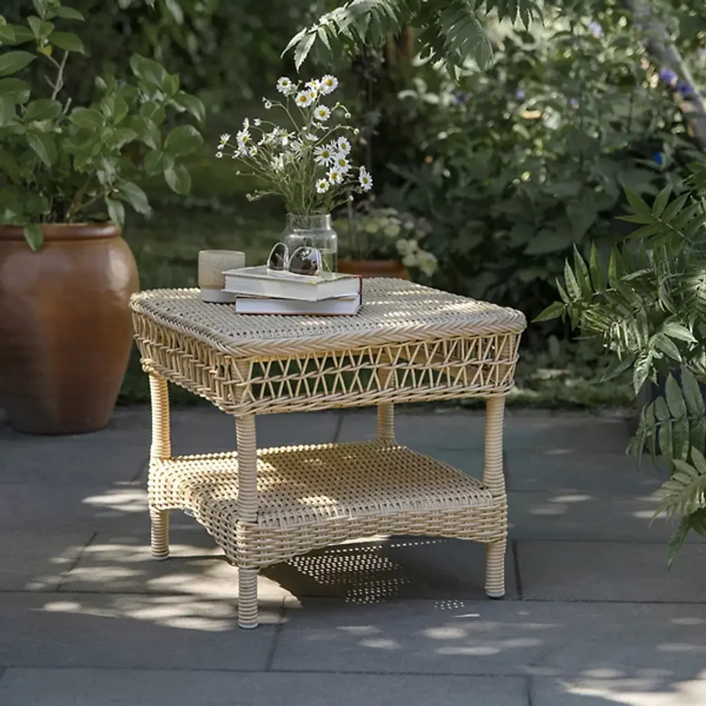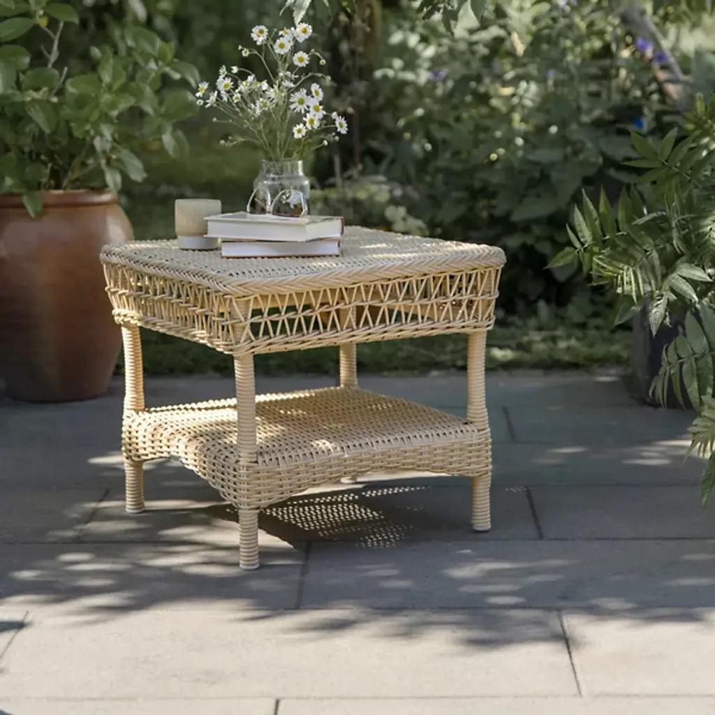 Inspired by the British colonial style, the Suzy Outdoor Side Table by Sika Design combines elegance with practicality. Details like a braided perimeter around the tabletop, a breezy open weave apron, and a curved skirt give this two-tier outdoor patio table its summerhouse appeal. A perfect chairside companion, the table has space for a potted plant, a drink, and snacks and the lower shelf provides storage space for books and magazines. Made from durable AluRattan™ (powder-coated aluminum) and ArtFibre™ faux wicker, the side table is suitable for hospitality and residential use.