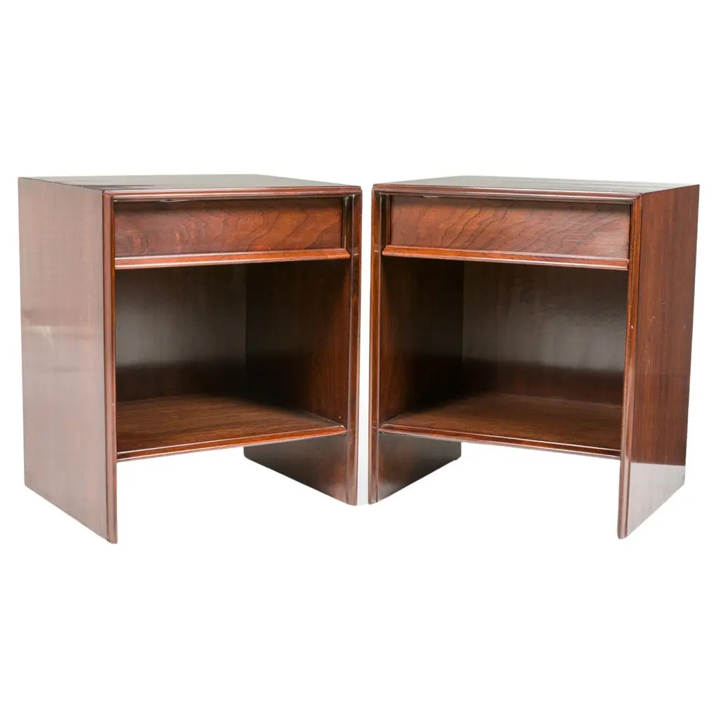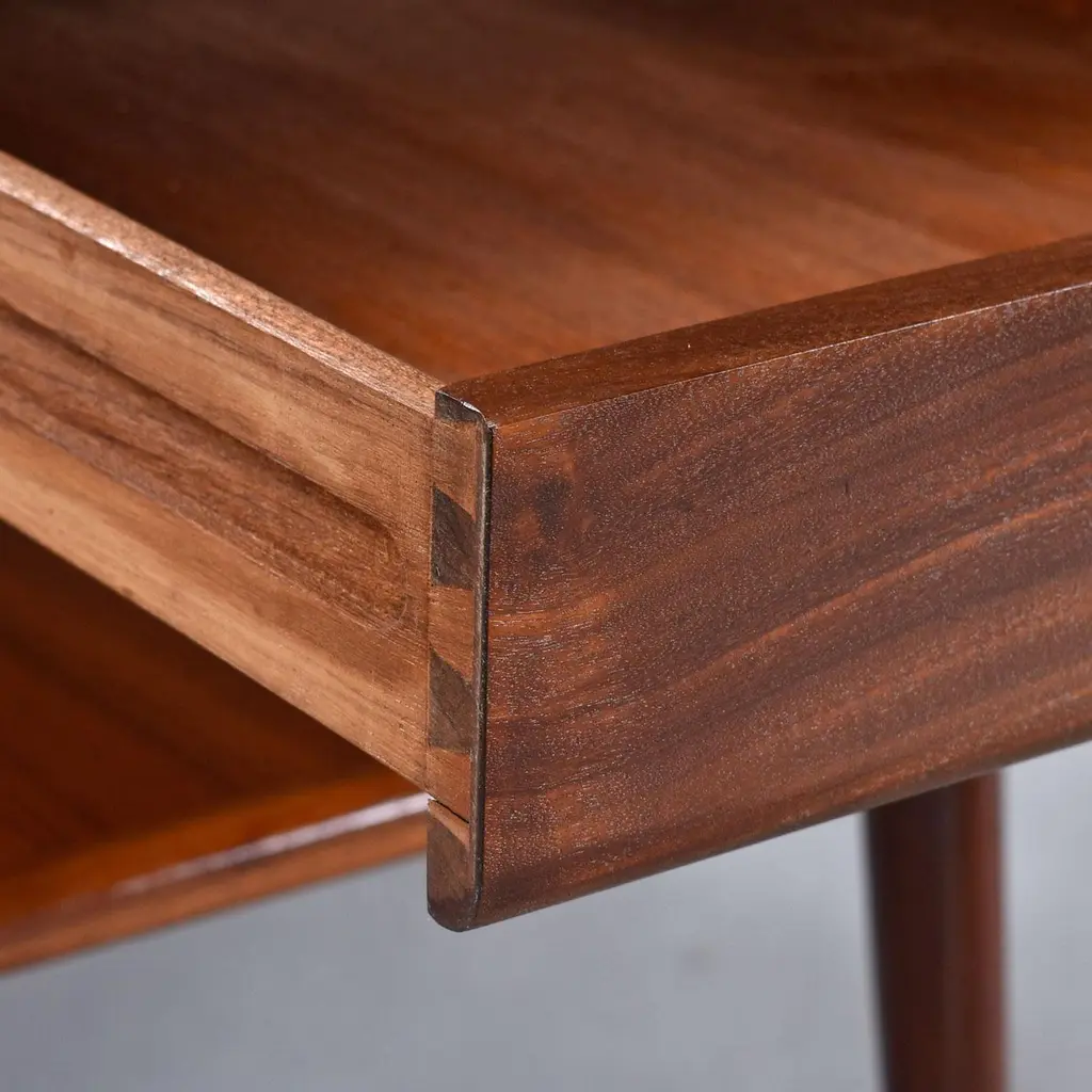 Exquisite pair of large Danish teak end tables by Svend Åge Madsen for Karl Lindegaard, circa 1960s. These sculptural Mid-Century Modern pieces embody the elegance and restraint of fine Scandinavian craftsmanship.Each table is meticulously finished on all sides and features a single, seamlessly integrated drawer—offering discreet storage while maintaining a clean, architectural silhouette. The solid teak legs are slightly more substantial than those found on typical Danish furniture, lending a grounded presence without sacrificing refinement.Softly rounded edges and gently bowed teak edge banding frame the tabletops, creating a subtle interplay of light and curve that reflects Madsen’s humanist approach to modern design. The tabletops have been expertly refinished, preserving the rich, warm orange patina that only decades of natural aging can produce.Stamped with the Svend Madsen maker’s mark and labeled Made in Denmark, this pair exemplifies Madsen’s celebrated mastery of proportion, balance, and material honesty. Perfect as end tables or nightstands, they elevate any interior that values form, texture, and timeless modernist simplicity.Condition: Tops refinished and detailed throughout. Only minimal age-appropriate wear remains.