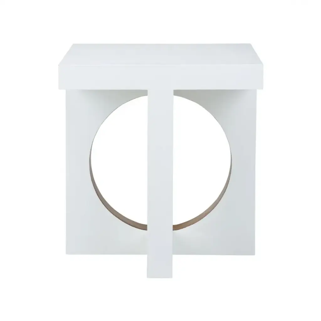 STUNNING WOOD SIDE TABLE FINISHED IN TEXTURED WHITE WITH A DRAMATIC SWOOP OF GOLD IN THE INTERIOR. SLEEK, SOPHISTICATED AND AN IMPRESSIVE DESIGN STATEMENT. DESIGNED BY BRADSHAW ORRELL.