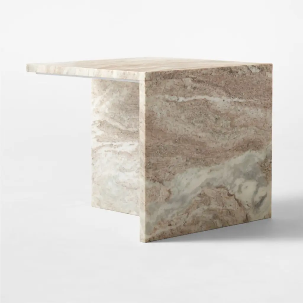 Hand-finished torrento marble squares up in a sculptural T. Designed by Studio Anansi, side tables elevate marble's natural tones and veining. Learn about Studio Anansi on our blog. CB2 exclusive.
