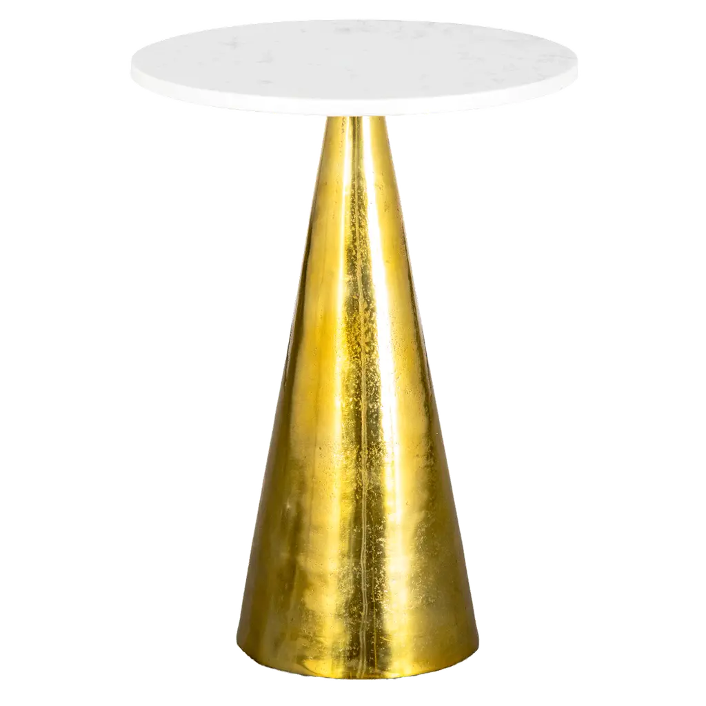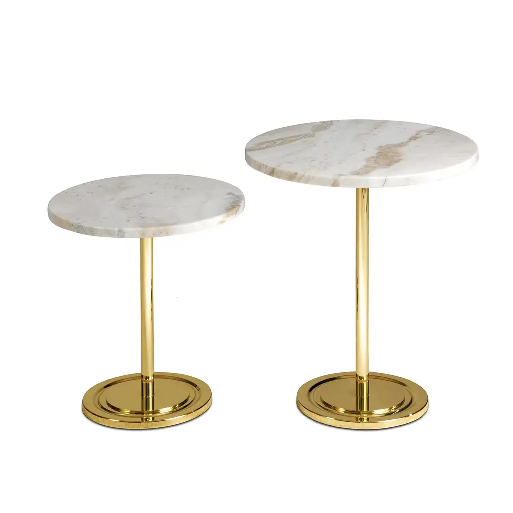 This elegant and versatile side table will be a precious addition to both a modern and a classic home, thanks to its timeless allure and the unique combination of traditional materials and contemporary minimalism. The round base and central leg, both in brass, support a round top in Corteccia marble, whose natural veins add a one-of-a-kind, striking decoration to the piece. Either alone or combined with the other side tables by this designer for a dynamic effect, this piece will enrich the look of any living room.