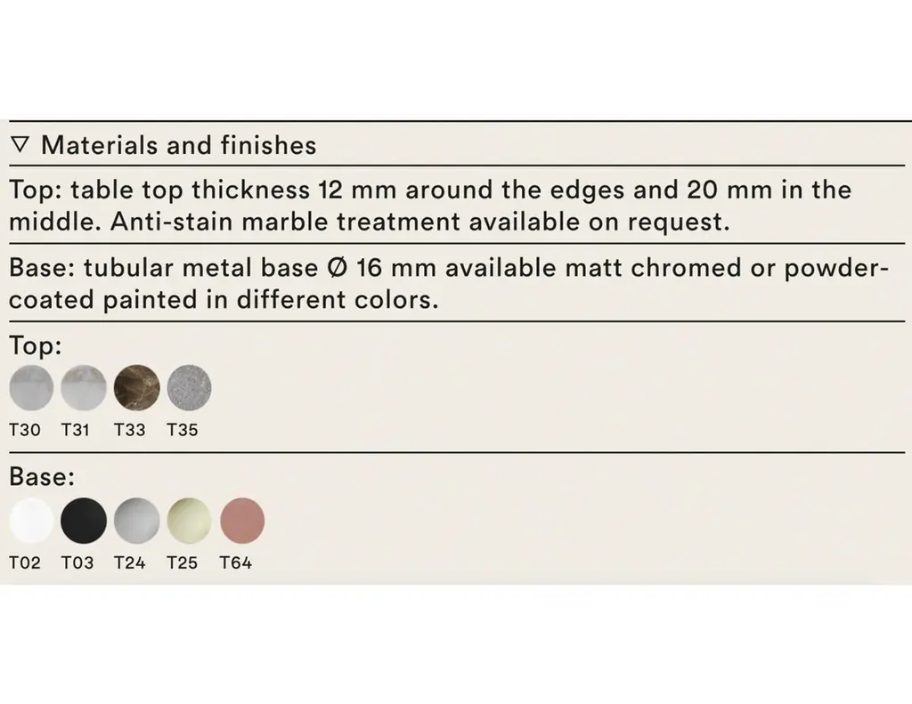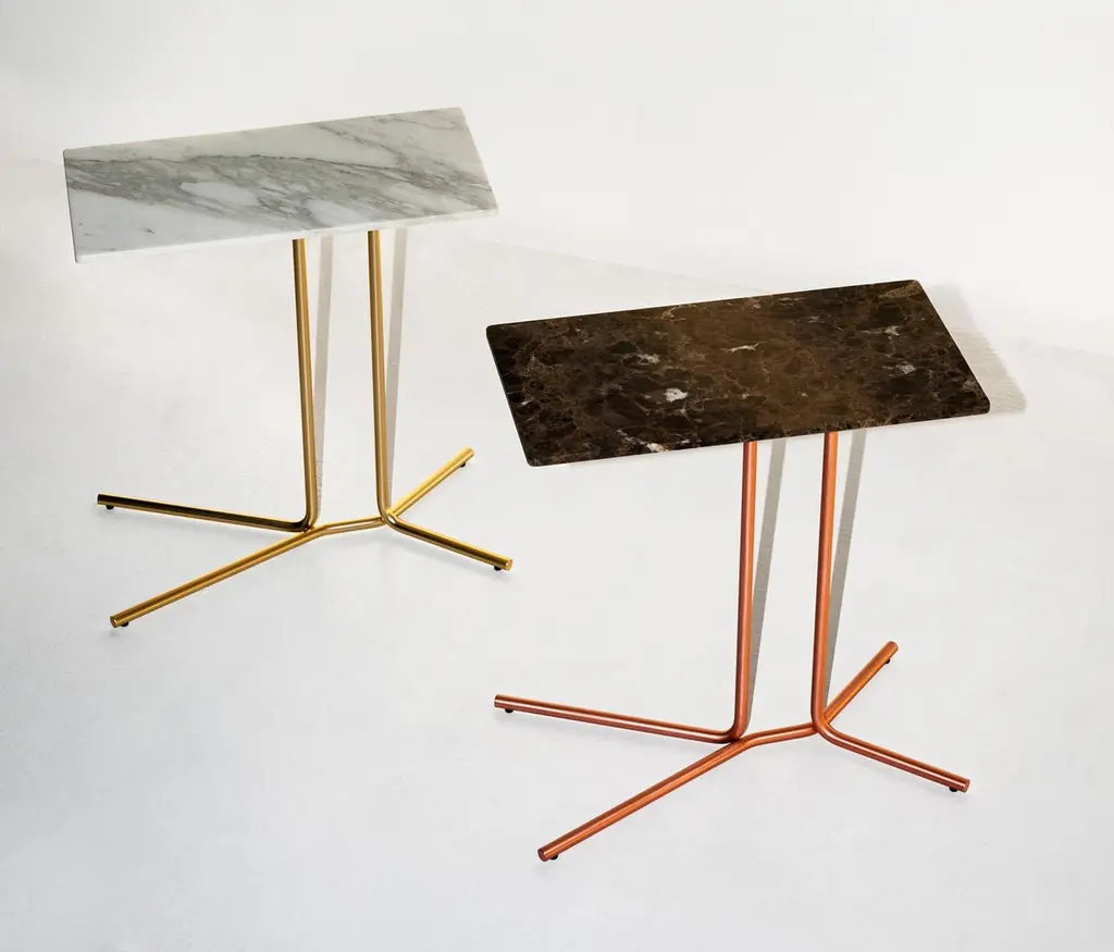 Designed to complement the sofas in the modular system chill-out, and echoing their essential lines, Ledge is a small coffee table with an offset metal frame that offers lightness and stability. With its delicate and precious finishes, it is suitable for use not only in the contract world, but also at home.Op: table top thickness 12 mm around the edges and 20 mm in the middle. Anti-stain marble treatment available on request.Base: tubular metal base Ø 16 mm available matt chromed or powder-coated painted in different colors.