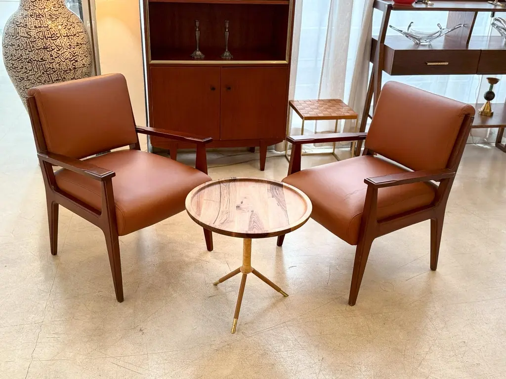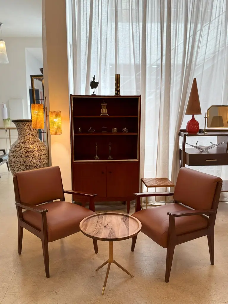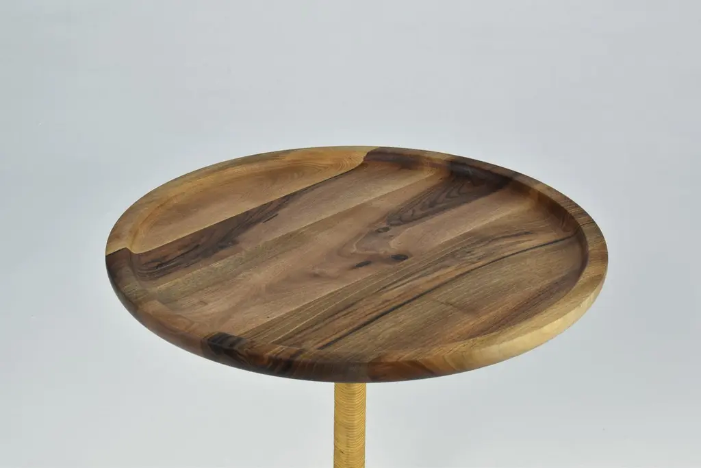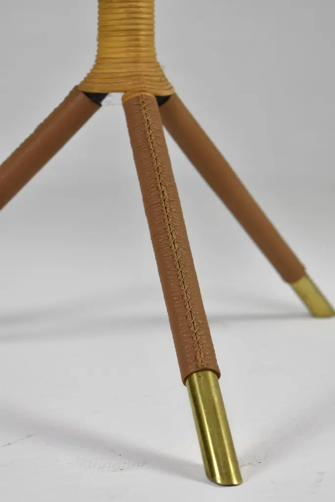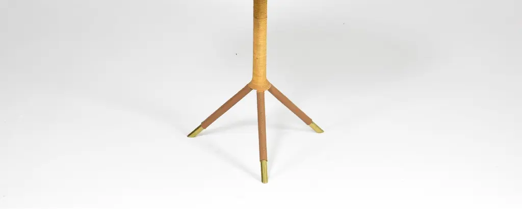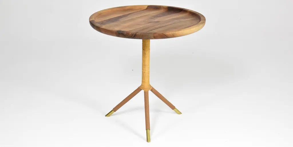 Tafra. 2025Handcrafted at Jonathan Amar Studio – MoroccoNamed after the Tamazight word for “interweaving,” Tafra embodies the harmony of materiality and gesture. This sculptural tripod table blends Mediterranean warmth with Moroccan craftsmanship, shaped through a dialogue between natural textures and detailing.The tabletop is carved from solid teak wood, subtly hollowed to form a soft tray profile. The central stem is wrapped in sustainably sourced natural rattan core, coiled by hand to create a surface movement.The tripod steel frame is sheathed in hand-stitched leather, using traditional saddle-stitch techniques commonly found in fine leather goods. This level of leather craftsmanship is a hallmark of our studio. The legs are finished with solid brass sabots, adding weight and contrast.Materials: Solid teak wood, rattan, hand-stitched leather, steel structure, solid brassDimensions: Ø 50 cm H 55–60 cm (customizable)Finishes: Natural teak or dark-stained wood; aged brass or polishedHandmade in MoroccoSubtle variations may occur due to the artisanal processLimited production. Custom finishes and private commissions available upon request.------------------------We’re an exhibition space and an online destination established by the passionate art director behind Jonathan Amar design studio.His gallery presents a harmonious mix of iconic and engaging 20th-century pieces and bespoke contemporary designs. With a strong focus on Italian mid-century modern, his success strives from sourcing objects with striking shapes, intricate techniques, and quality materials that cross the concept of time in the same way a Spirit does. Jonathan Amar being of French and Moroccan origin, the gallery is split between a small space in Paris and its headquarters in Rabat where the magical restoration work takes place.All our pieces are expertly restored at our atelier and we only offer items that will last another lifetime. Our workspace includes a luminous gallery, a restoration atelier where our team of experts in metalwork, woodwork, upholstery, and electrics; restore each piece with the mission to honor a balance between restoration and preservation. There may be natural light age-related wear but never any hard damages or structural issues. Since the launch of our gallery in late 2017, we have exported over 1100 items to buyers in 21 countries located in all four corners of the world from Europe and North America to Asia and Australia. In the United States alone, we have ensured the delivery of over 650 pieces of all sizes (from big dining tables to small decorative objects) in 23 states.We take the utmost attention to our packaging by building robust made-to-measure boxes in our atelier with the aim of providing safe and cost-effective delivery prices for every client. Most deliveries arrive smoothly in less than 8 days. FYI the Morocco Free Trade Agreement (MAFTA) went into effect on January 1, 2006. Under the agreement, most Moroccan goods enter the United States duty-free. Please don’t hesitate to contact us if you have any question!