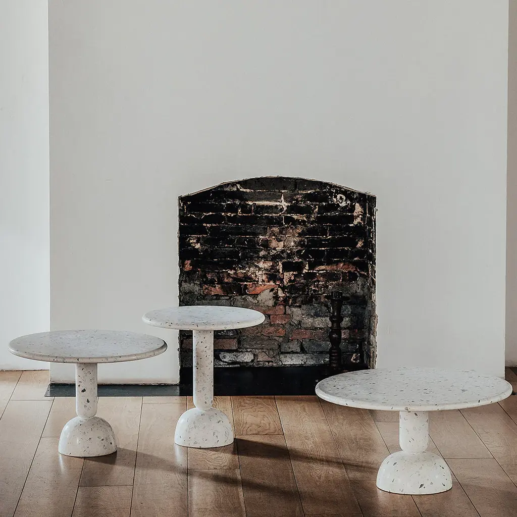 Inspired by Stellar Works' commitment to East-West harmony, the Taiko side tables draw from the iconic Taiko drums. Their rounded aesthetics and commanding presence influence the carefully crafted shapes, blending cultural elements for visually striking and functional design. Available in three sophisticated terrazzo combinations - ice white, color gold, and carbon black - the Taiko side tables seamlessly combine form and function. The Taiko side tables stand as a testament to the successful fusion of innovation and functionality in contemporary furniture design.
